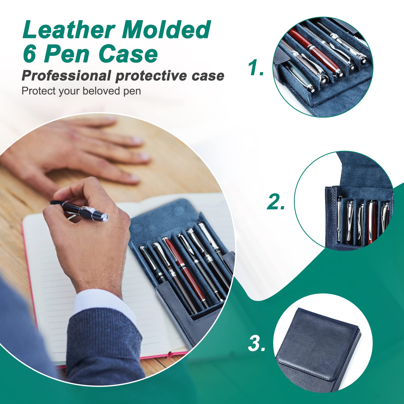 Hiram leather fountain pen case for 6 pens, Portable leather pen storage box with hidden magnetic snap closure design (Blue)
