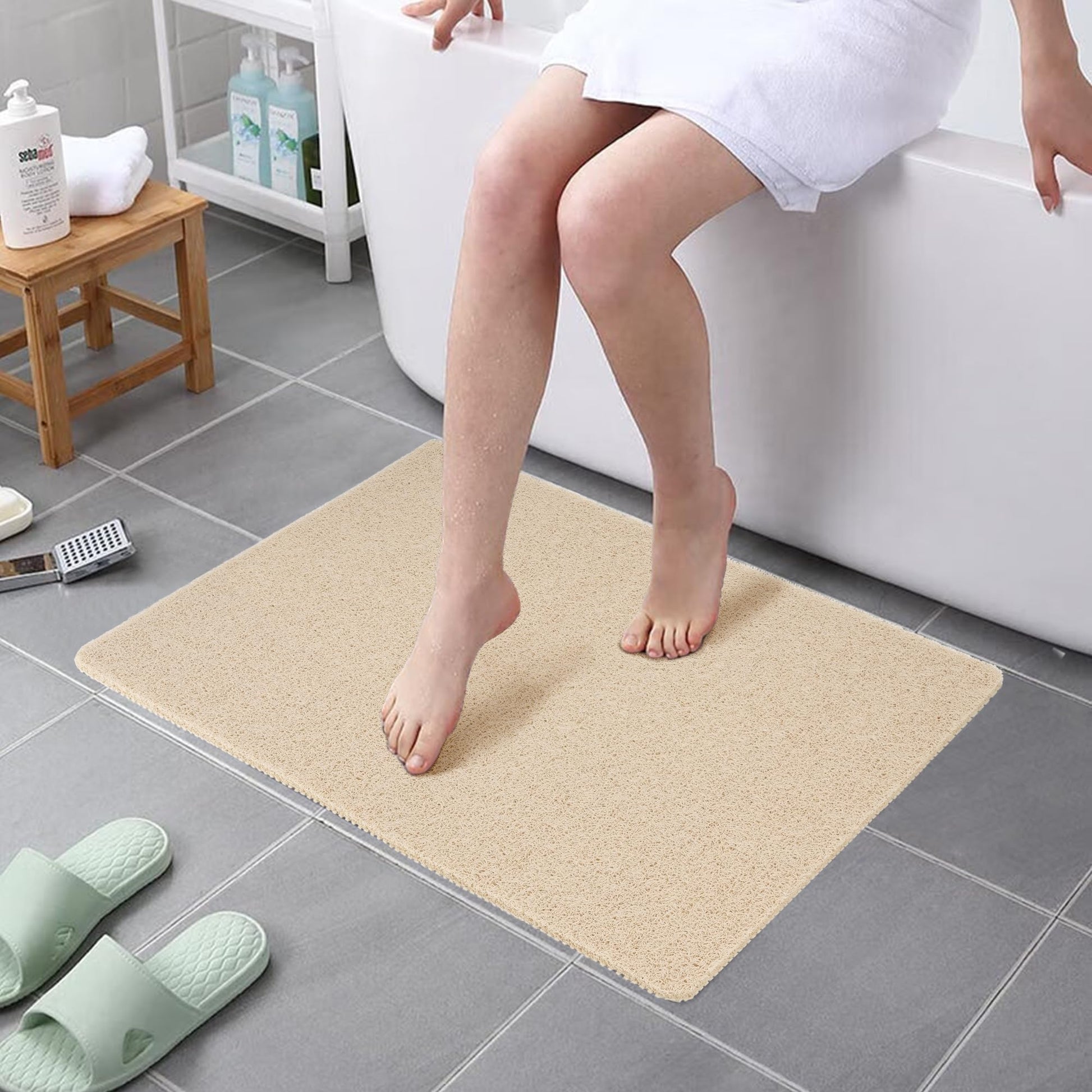 HITSLAM Non-Slip Shower Mat, 80x60cm Non-Slip Bathtub Mat with Drainage, Soft PVC Loofah Anti-Slip Mat for Bathtub, Quick-Drying Bath Mat, Beige