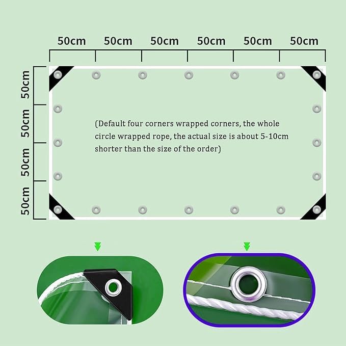 "ROBUST & DURABLE: Clear tarpaulin with eyelets, PVC material, thickness 0.3mm, weight 400g/㎡, waterproof, rainproof, tear-resistant and foldable, not easily deformed, durable. Transparent PVC tarpaulin, edges wrapped with high-strength nylon rope and reinforced plastic corners for optimum stability and tear resistance. Transparent tarpaulin with 99% transparency, weather-resistant and sturdy processed to ensure your plants and flowers get more sunlight even in cold weather and grow healthy. EASY TO INSTALL: Eyelets made of high-quality aluminum alloy, hole spacing 50 cm (20 inches), hole inner diameter 1.2 cm, holes all around. The clear tarpaulin with eyelets can easily be attached to railings, posts, fences, and more. MULTIFUNCTIONAL: Transparent tarp with eyelets, can be used as greenhouse film, pergola cover, camping tent, waterproof balcony tent, dust cover, car cover, outdoor curtain, terrace canopy side panel. NOTE: The PVC tarpaulin may have folds upon receipt. Due to vacuum packaging, the received tarpaulin may have folds that can be removed by heating with a hairdryer or exposed to sunlight for a few hours."