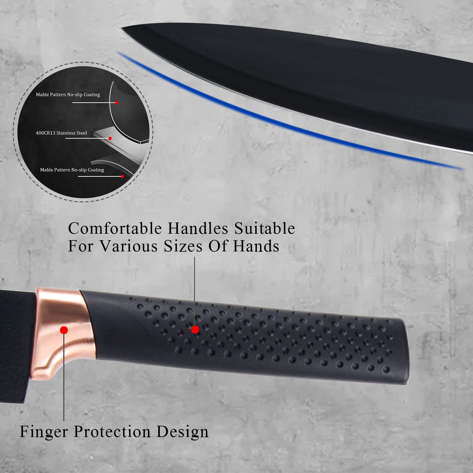 "Extra sharp & rust-free knives: Our stainless steel knives with a 15° sharpened blade effortlessly cut through all foods. The innovative coating provides corrosion resistance. Easy hand washing maintains sharpness and durability.