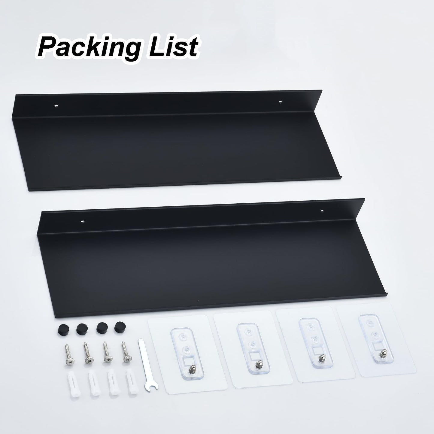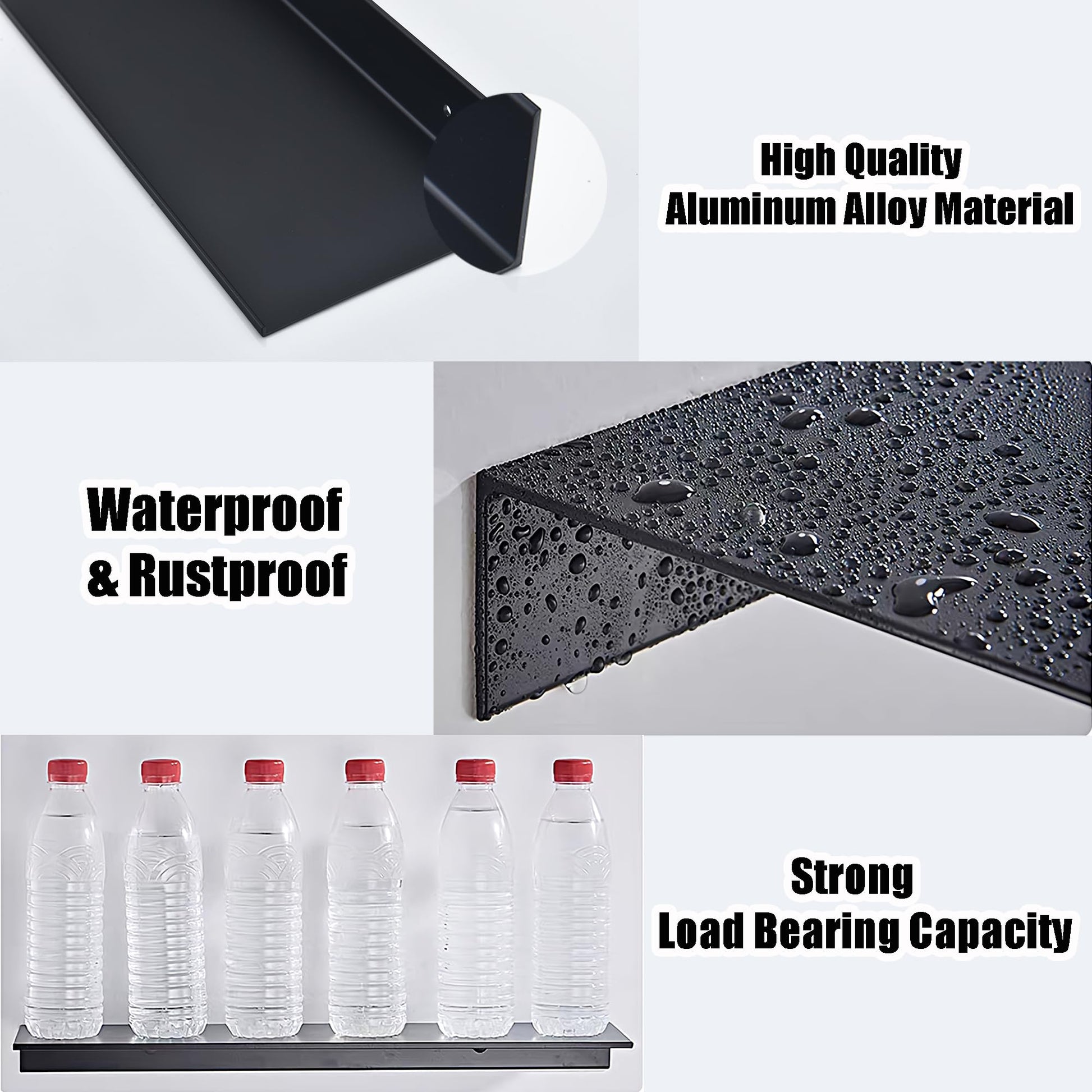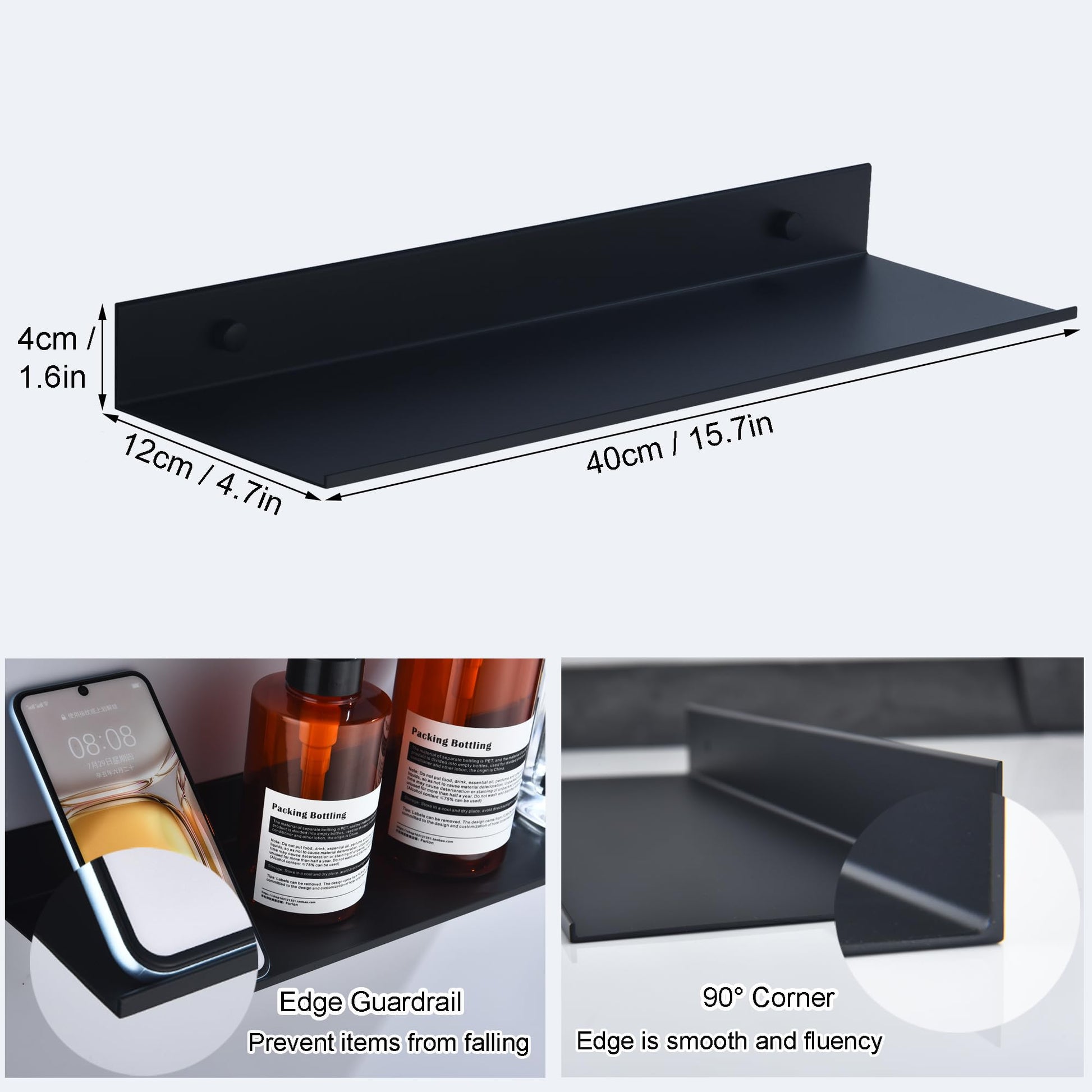 ["Large Capacity: The size of the bathroom shelf is 15.7 * 4.8 inches, which exceeds the size of most shower stands and can easily hold shampoo, conditioner, shower gel, facial cleanser, and other toiletries. The shelf features a 5mm high barrier to prevent items from falling off.","High Quality Material: Our wall shelves are made of high-quality space aluminum, which is waterproof, rustproof, and corrosion-resistant, making them ideal for moist environments such as bathrooms and kitchens. Strong and durable, with a strong bearing capacity, can easily hold up to 22 lbs.","Multifunctional Use: Our floating shelves can be used not only as bathroom shelves but also in the living room to display your photos, plants, artwork, and other decorations, and in the kitchen as spice racks. You can display the two shelves in different shapes according to your needs.","Minimalist Design: The unique shelf looks elegant and simple, and the smooth, one-piece design complements most home decoration styles, making your home look more organized.","Easy to Install: Floating shelves can be installed with or without drilling. The accessories and installation instructions needed for both installation methods are included in the package. Please read the installation instructions carefully before installation and follow the steps in the installation instructions to ensure an easy and successful installation."]