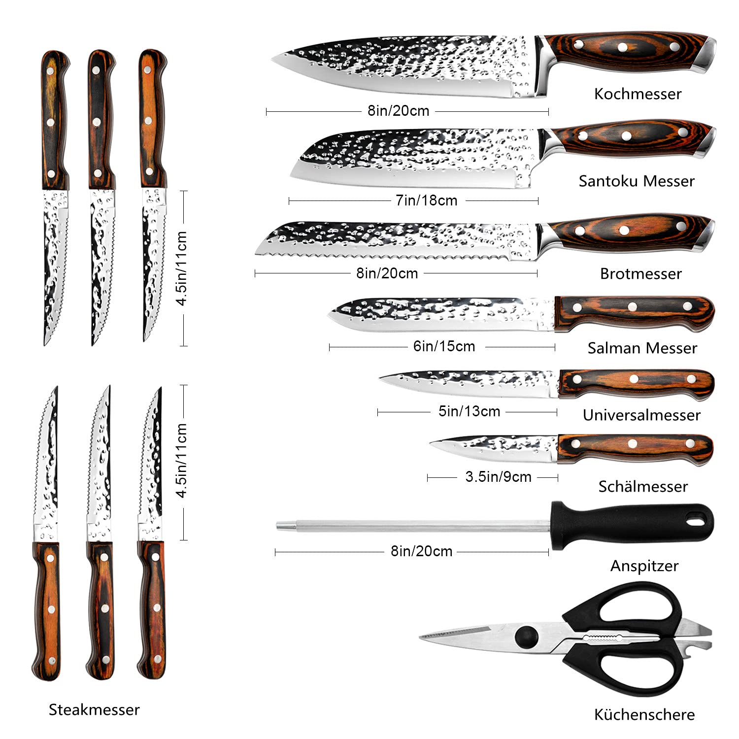 ["★All-in-One Knife Set for All Your Needs★ 15-piece knife block set includes: 1x Chef's knife, 1x Santoku knife, 1x Bread knife, 1x Salmon knife, 1x Utility knife, 1x Paring knife, 6x Steak knives, 1x Sharpener, 1x Kitchen scissors, 1x Knife block. This knife block with knives is essential for professional chefs and home cooks.","★Sharp Blade★ The blade undergoes a continuous forging process and precise tempering treatment, making it hard to break and highly durable. Exquisite knife sharpening technology for perfect balance between ultra-thin slices and maximum flexibility when cutting food. The blade is hammered to create a water wave texture, making it difficult for food to stick to the blade.","★High-Quality Japanese Stainless Steel★ This knife set features high-quality stainless steel blades with high carbon content for precision and accuracy. Each piece in this knife block set has strong, rust-resistant stainless steel blades with high carbon content. Additionally, these knives are extremely well-balanced for precision tasks. Sleek, sharp, and smooth, whether you're slicing, dicing, chopping, or peeling, it's very practical.","★Rivet Handle with Wood Grain★ The entire knife is made from a single piece of steel, with Pakkawood on the outside and three rivets to reinforce it for more durability. The ergonomic, non-slip wood grain handle provides a comfortable grip, optimal weight and balance, and minimizes finger fatigue.","★Easy and Stylish Knife Holder★ The wooden knife block is sturdy for safely storing your knives, non-slip, breathable to prevent any possibility of bacteria infiltration. The space between knives is designed reasonably, not too tight and easy to take out. We strive to enhance your cooking experience. If you have any questions about our knife set, please contact us. Our 24-hour customer service team is happy to assist you."]