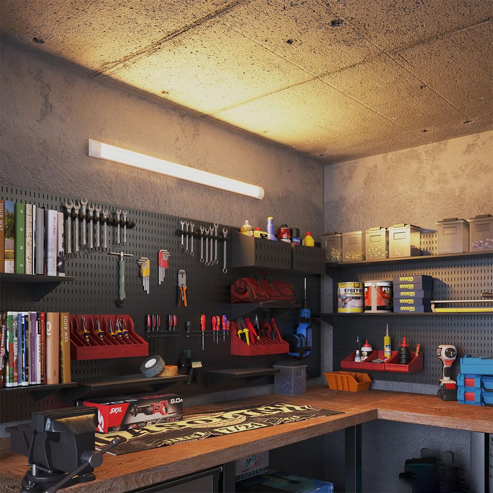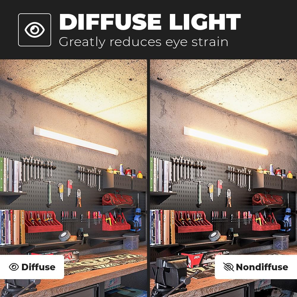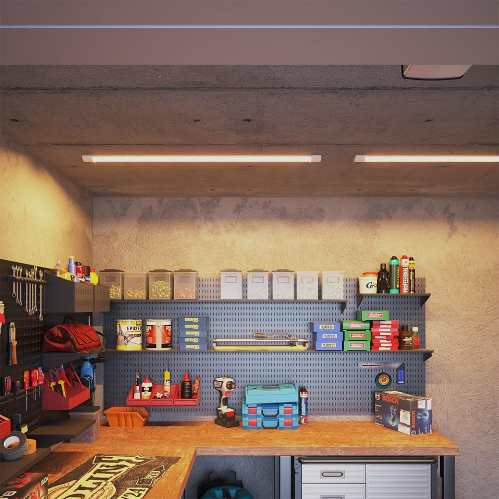 "Perfect light everywhere: We are sure that you will be amazed by the light of this LED batten light. In addition to its brightness and flicker-free light, our ultra-flat LED light strip has another great strength: its neutral white light (4000 Kelvin) does not cast any shadows. The design, the milky lampshade, and the extremely wide beam angle of 110° make it possible. The result is perfect lighting in a house, garage, basement, shed, shop, warehouse, and so on.