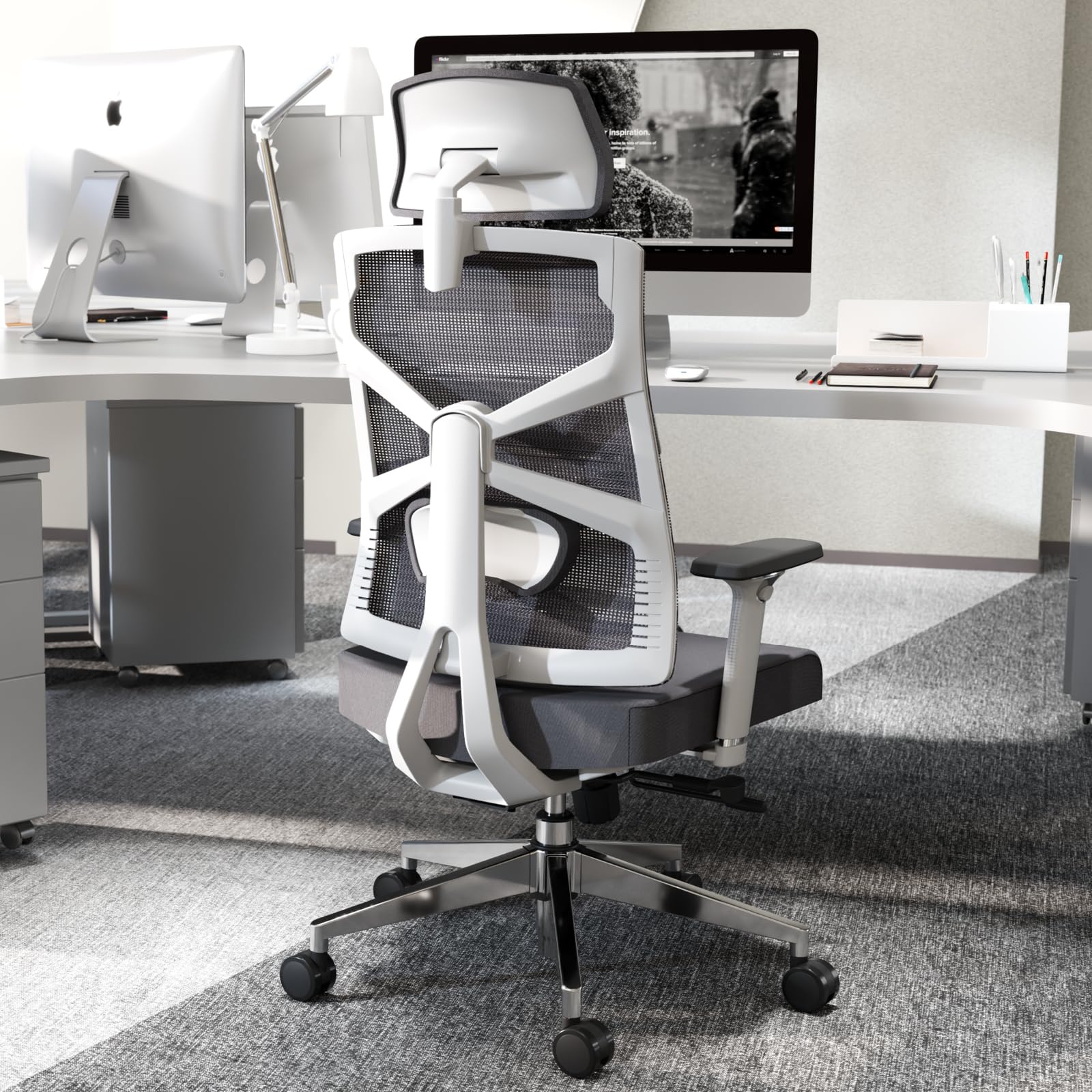 HOLLUDLE ergonomic office chair with adaptive backrest, desk chair with 4D armrests, adjustable seat depth, lumbar support, and 2D headrest, breathable mesh executive chair, White