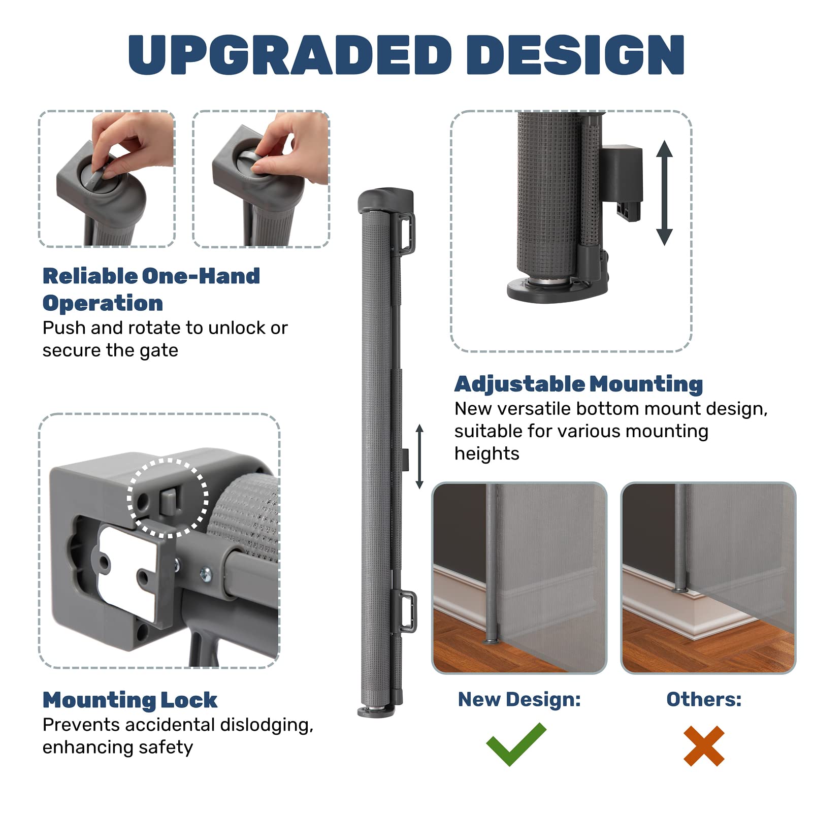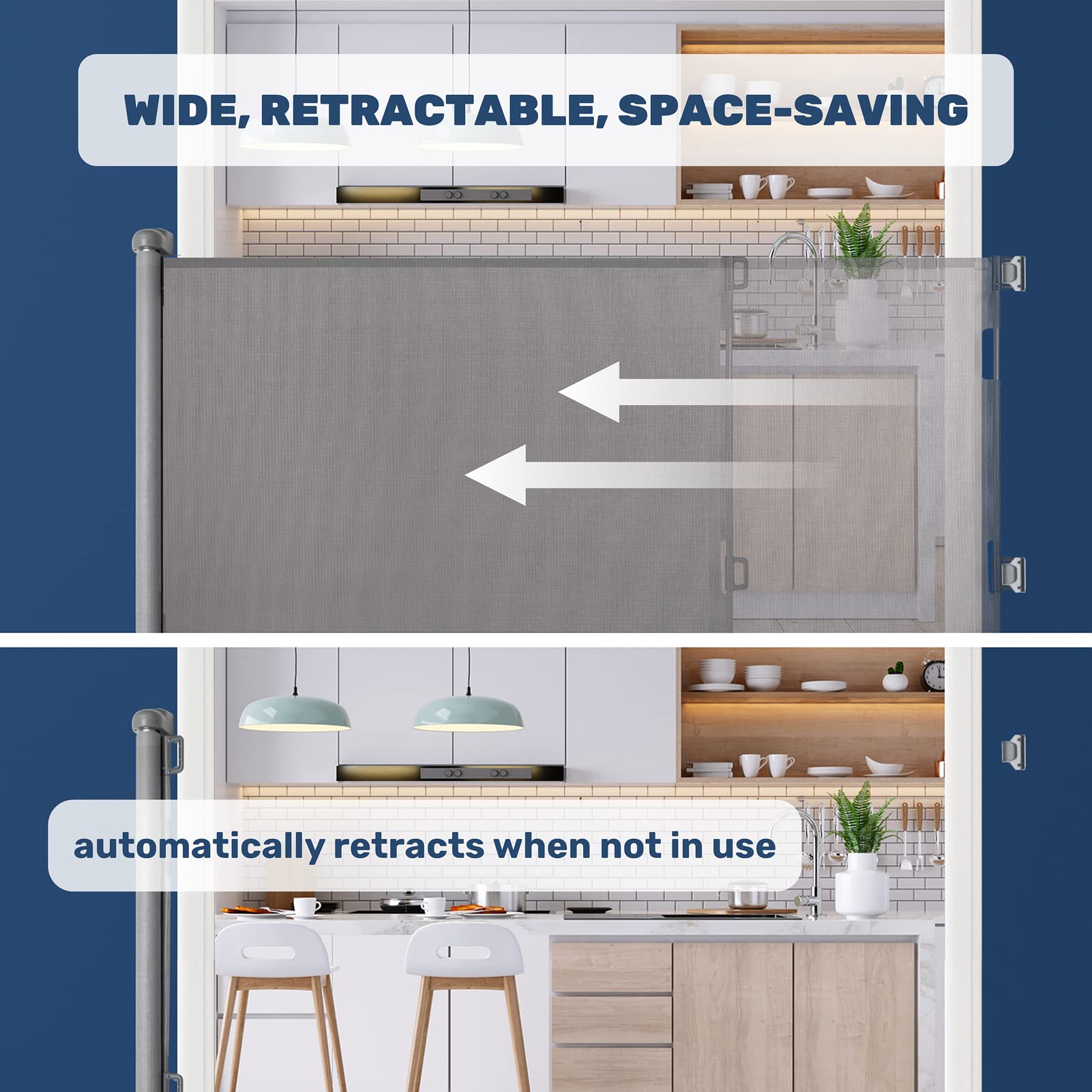["Extra Wide Safety Gate - Expands up to 70.9 inches wide and 33.9 inches high. Ideal for stairs, doorways, hallways, and outdoor areas. Save space with our retractable design. Create a safe playing environment for your child or pet.",