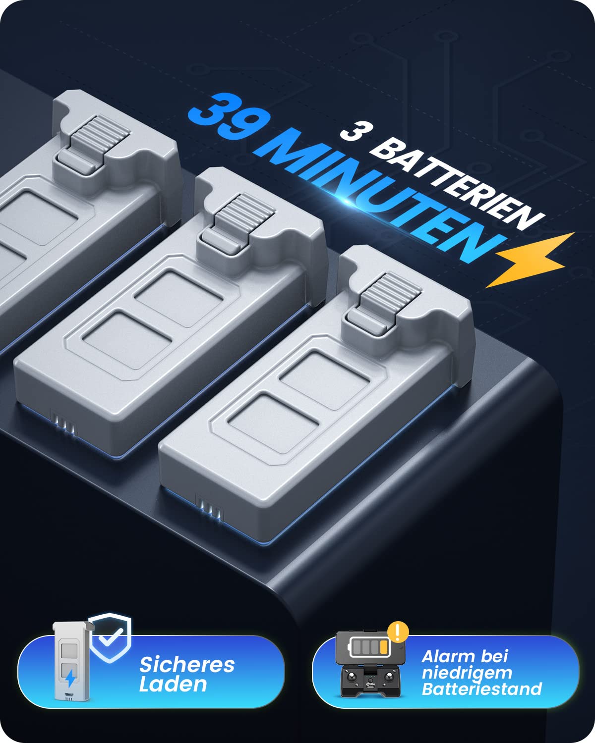 "3 times longer flight times - Thanks to the 3 batteries, the flight time extends to up to 39 minutes. Twice as long as others! At the same time, the modular battery is more advanced and safer.",