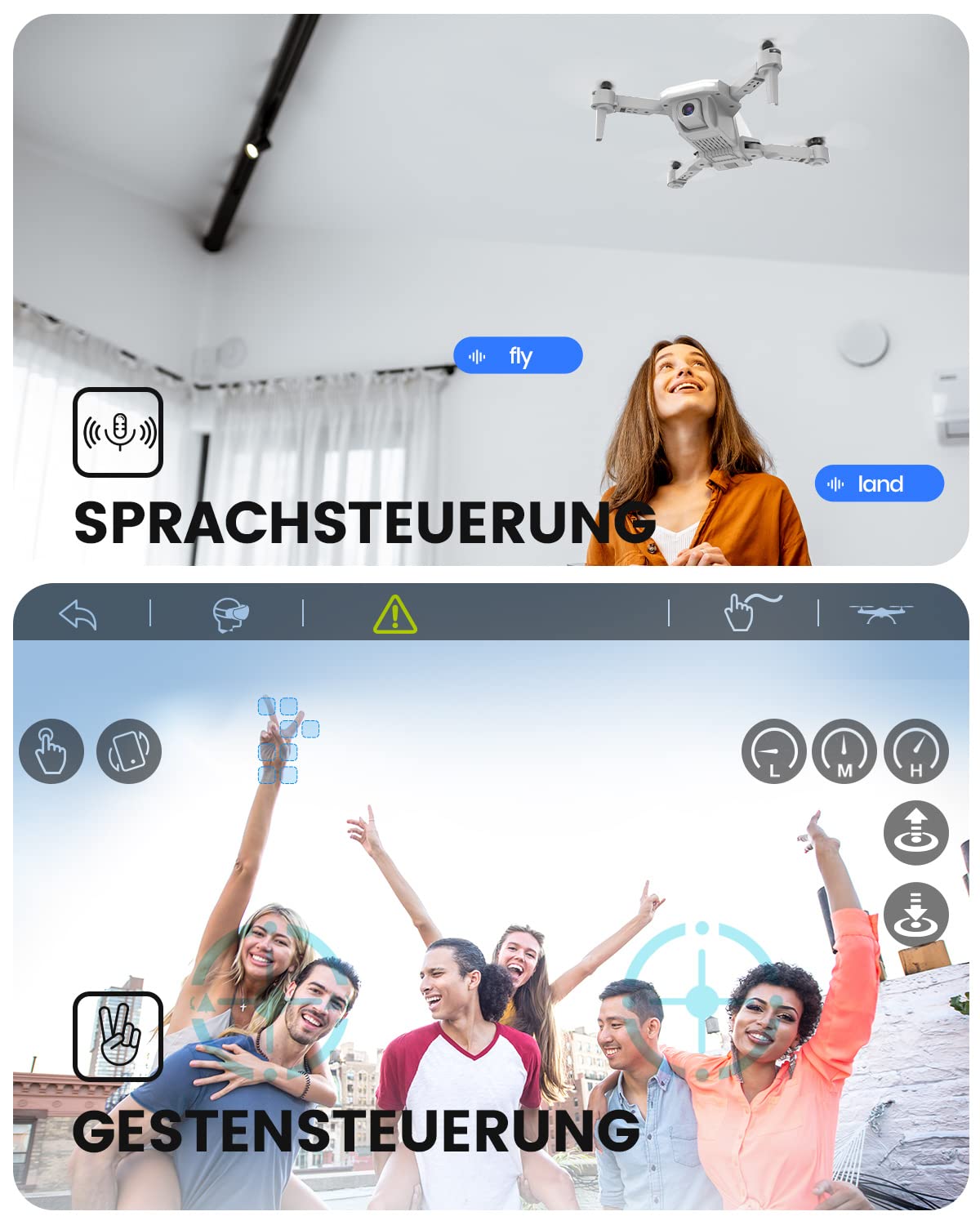 "Smart App features - With Tap-Fly, the drone flies along the user-defined points. In gravity sensor mode, the drone flies in the direction of your phone. With gesture control, selfies can also be easily taken.",