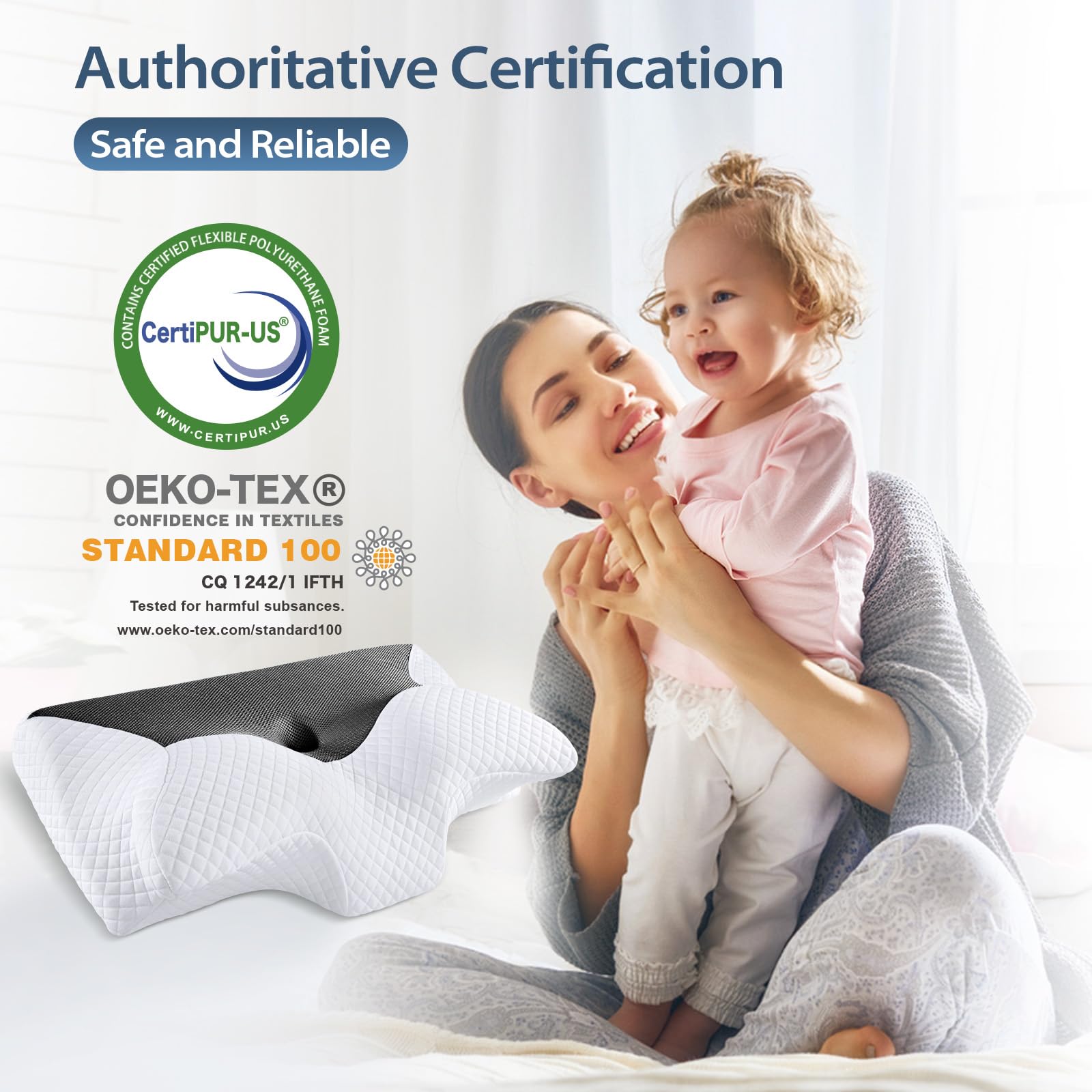 "【Ergonomic Design】The ergonomic pillow maintains the natural curvature of the neck with cervical contour to properly support the neck. The central hollow of the neck support pillow supports the head and ensures optimal posture. The wedge extension helps support the thoracic spine. Special armrests of the orthopedic pillows support the arms. 【Large Size】Compared to the standard sizes of 60 x 35 x 8/12 cm, this pillow measures 70×40×8.5/14, which is more suitable for people with a strong body or looking for a large pillow. The design of the armrests makes it easier to fall asleep on your back by placing your hands in the grooves and resting them on the pillow. No matter how you turn, your arms can comfortably rest in the grooves. 【High-Quality Memory Foam Pillow】This pillow is made of high-quality memory foam with moderate hardness to ensure comfortable support while sleeping and minimize neck pain and shoulder stiffness. The memory foam with temperature sensing function perfectly adjusts to your neck. 【Perfect Back Sleeping Pillow】When sleeping on your back, the natural traction of the neck and head support can reduce pressure on the back of the head, reduce snoring, and improve sleep quality. When sleeping on the side, the cut under the wing of your shoulder curve releases the shoulder pressure and places the arm on the hand to prevent numbness. 【Breathable and Easy to Care for Pillow】With a removable and washable cover with zipper for easy cleaning and extending the life of the foam neck pillow. Please note that the pillow core cannot be washed. If you need assistance, feel free to contact us."
