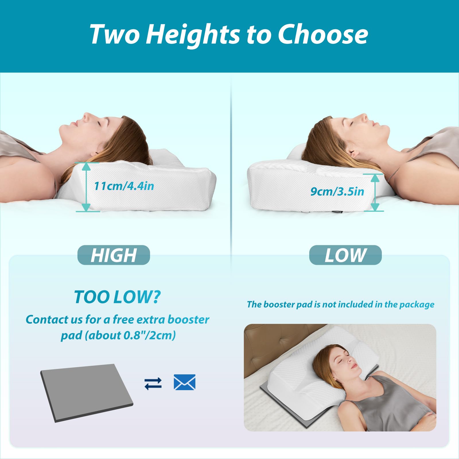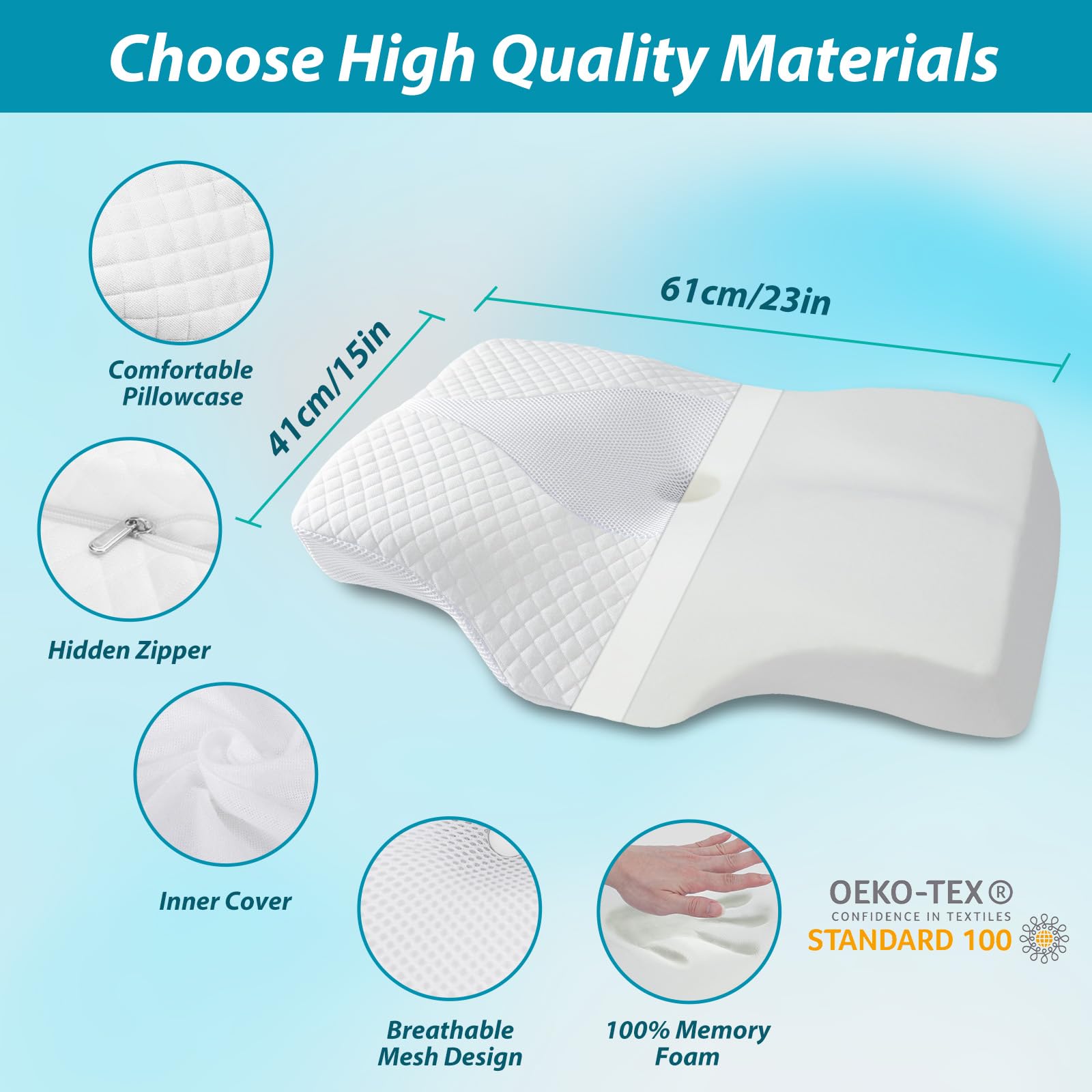 ["đăErgonomic DesignăThe ergonomic pillow maintains the natural curvature of the neck with cervical contour to properly support the neck. The central hollow of the neck support pillow supports the head and ensures optimal posture. The wedge extension helps support the thoracic spine.","đăTwo Different HeightsăThe pillow size is 24 x 16 x 3.5/4.3 inches. The high and low curved surfaces of the neck support pillow at both ends provide a custom fit to satisfy different users. At the same time, they allow for a comfortable sleep and ensure even breathing.","đăBreathable and Easy to CareăWith a removable and washable zippered cover for easy cleaning and extended life of the foam neck pillow. Please note that the pillow core cannot be washed.","đăMemory Foam PillowăThe neck support pillow is made from elastic foam. The memory foam retains its shape and supports the head, neck, and shoulder. The memory foam pillow guarantees optimal sleep comfort.","đăLarge Design PillowăWith the special ergonomic shape, the pillow is ideal for various sleep positions such as back, side, and stomach. This orthopedic pillow is particularly helpful for those who toss and turn in their sleep."]
