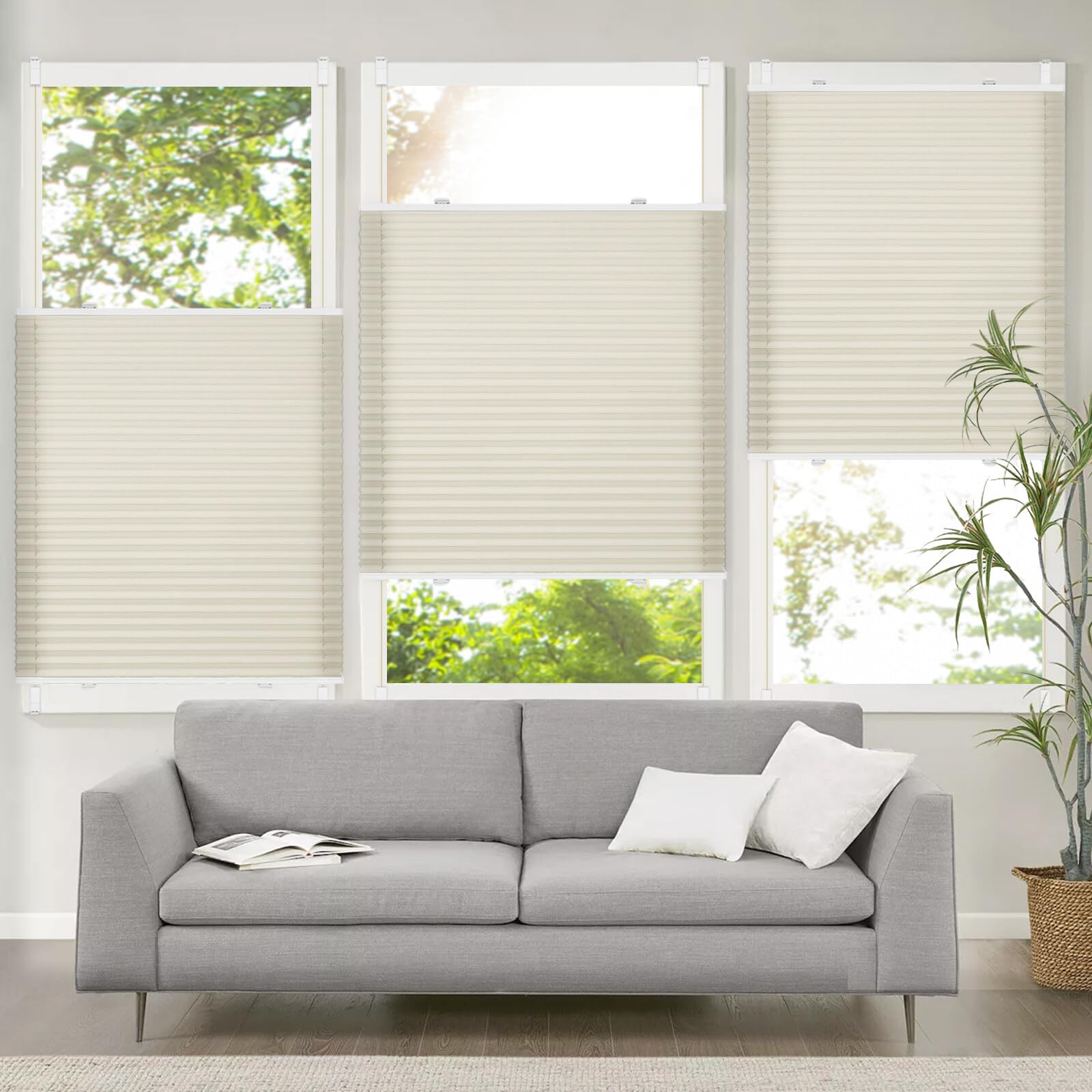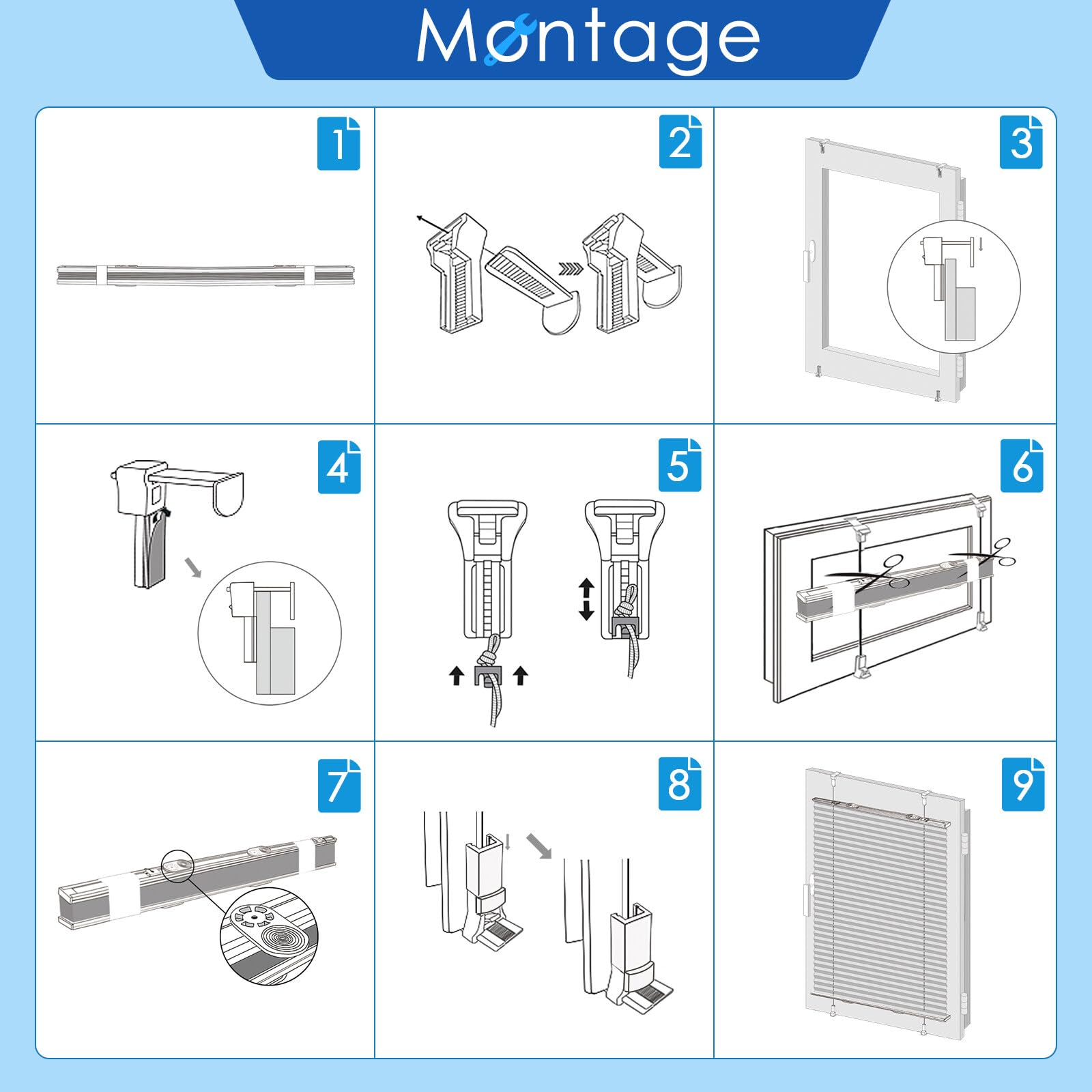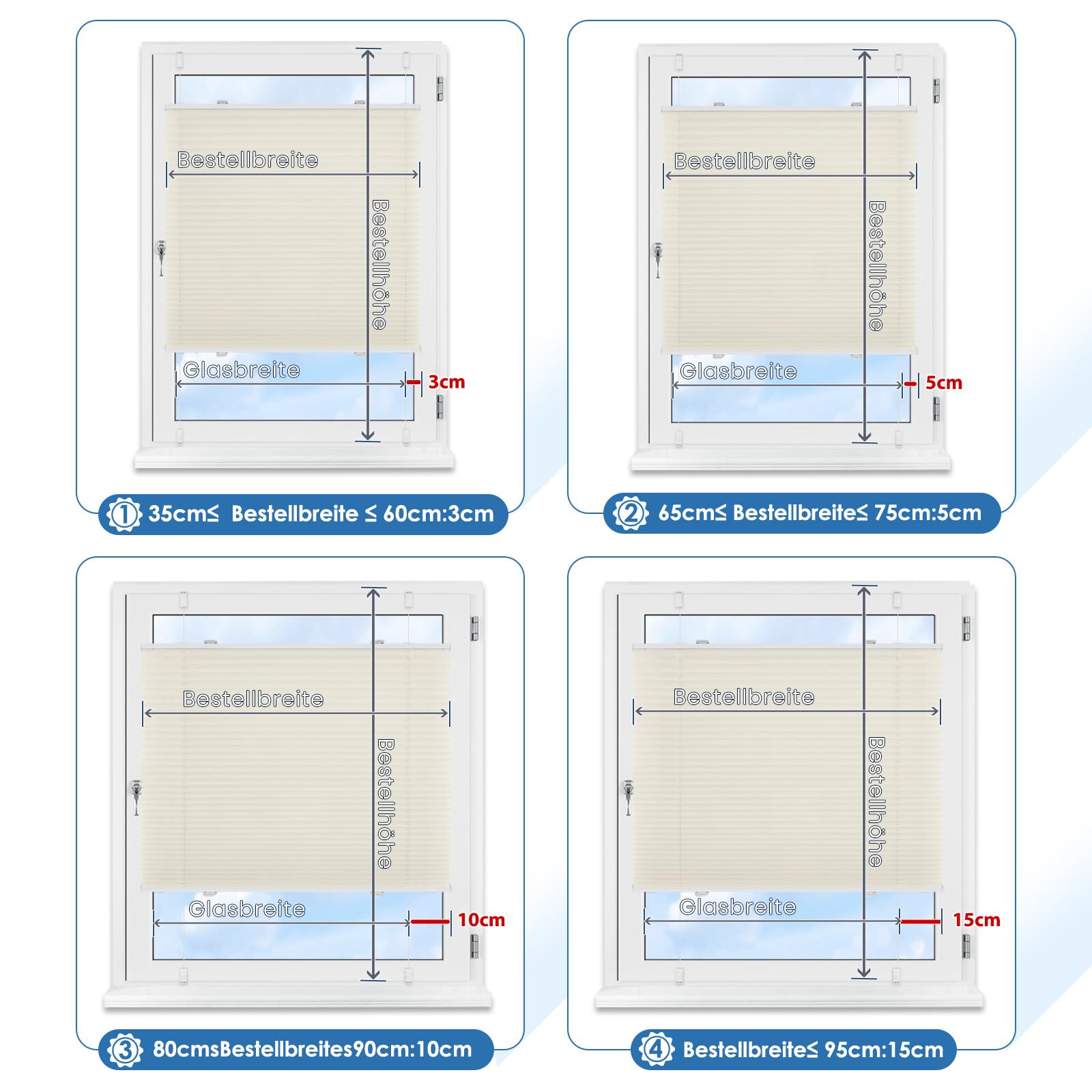 ["【Material & Cleaning】The pleated blind without drilling is made of 100% polyester - No chemical smell, environmentally friendly and certified by Öko-TEX. Easy to clean, wipeable with a damp cloth, can also be installed in damp rooms.","【Pleated without drilling】The pleated blind can be installed without drilling and simply clamped with the 4 clamp brackets on the window frame. Suitable thickness of the window frame: 0.4-0.9 inches. (not suitable for skylights wooden windows fixed windows)","【Properly measuring the blind without drilling】The indicated order width = fabric width; if you want 100% coverage, the fabric width should be 0.8-1.2 inches wider than the glass width, i.e. If the glass width is 16.5 inches, you can choose the blind with a width of 18 inches. Pay attention to the window handle so that it does not interfere with the movement of the window blind","【Free Adjustable Operation】You can adjust the position of the pleated blind without drilling with the cord and 2 handles freely. The pleated blind without drilling can be fixed in any position on the windows (bottom, middle, top)","【Usage Scenarios】Stylish and practical at the same time: The pleated blind without drilling is suitable for all types of rooms such as offices, bedrooms, patio doors, balconies, living rooms, children's rooms, bathrooms, and kitchens"]