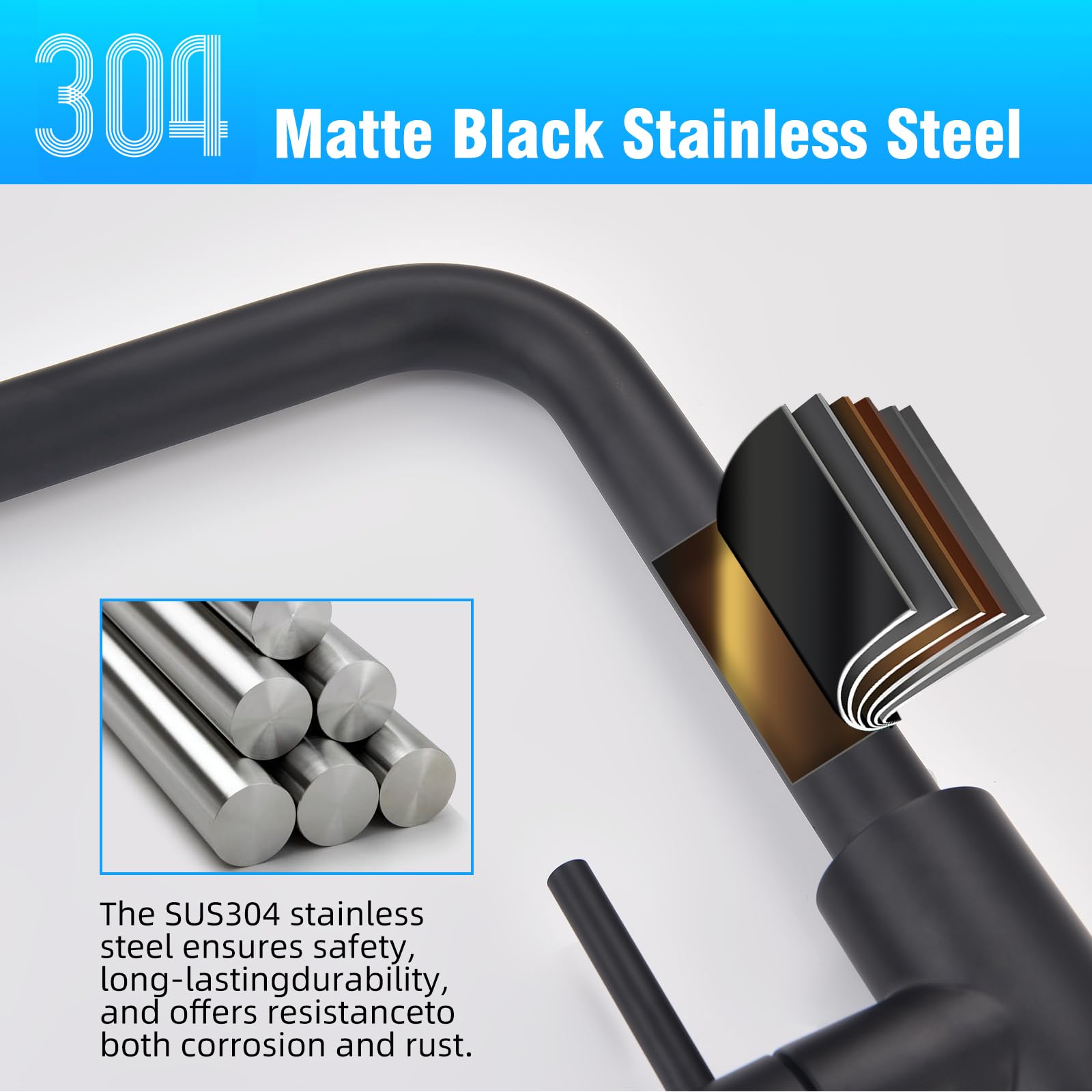 ["Simple installation and Elegant design"] Installing our kitchen faucet is particularly easy thanks to the included mounting kit and clear instructions. You do not need special tools or expertise to quickly and safely install the black kitchen faucet. Furthermore, the elegant matte black design adds a modern and stylish touch to any kitchen. With our pull-out kitchen sink faucet, you will experience a new level of comfort and style in your kitchen. Choose our kitchen faucet and benefit from its versatile features and durable quality.