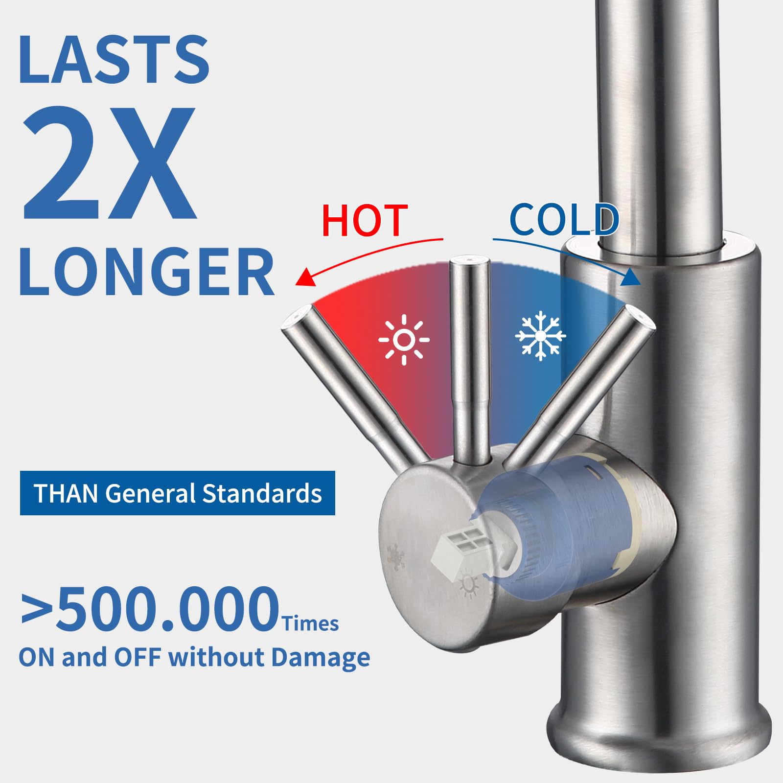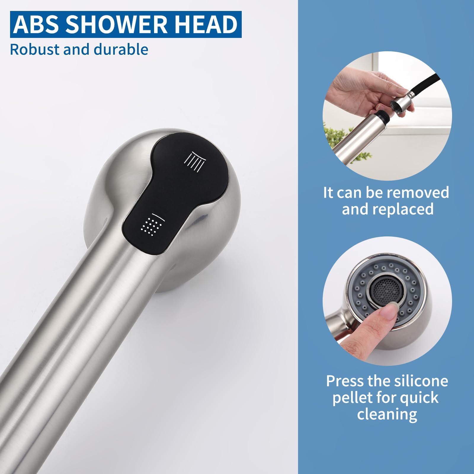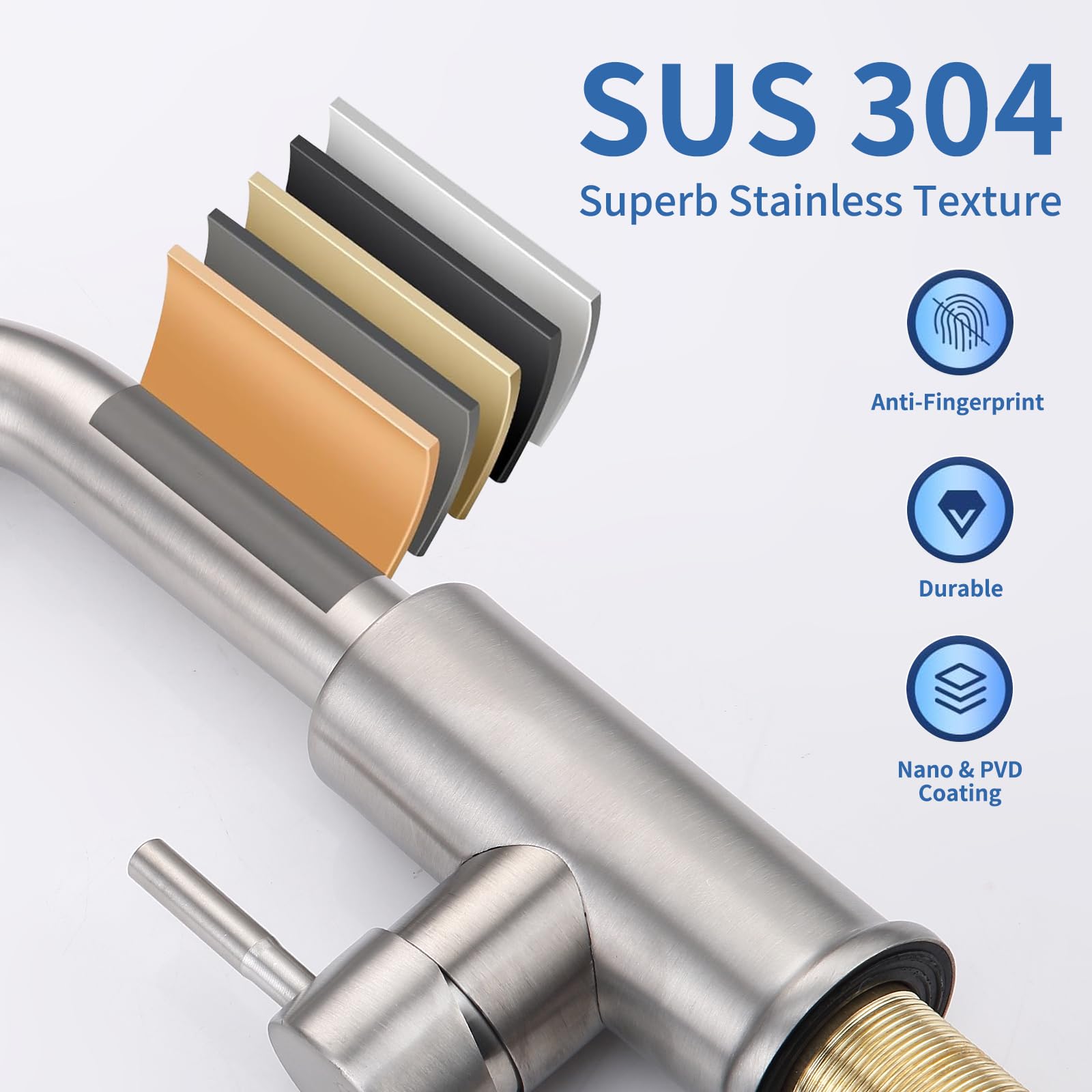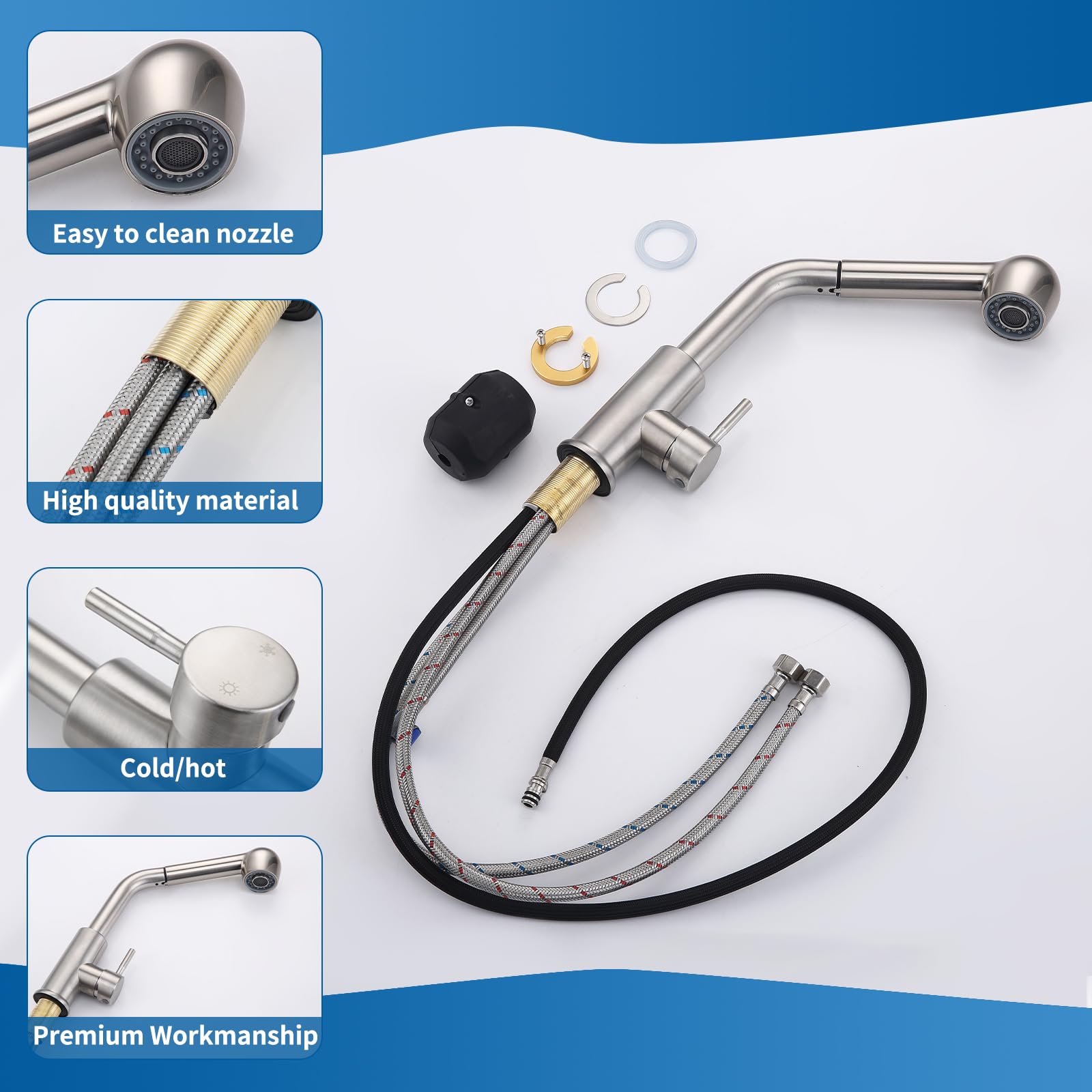 ["🌊Innovative Design💦Our kitchen faucet with 2 water spray modes offers you unique flexibility in cleaning your kitchen. No more compromises between shower water or air bubble water - with just one click, you can easily switch between both functions.","💧Flexible Pull-out Kitchen Faucet💦Mixer tap can be extended up to 50 cm reaching all corners of the sink, reducing cleaning time and energy. You can even pull the hose out to the countertop when needed. Especially suitable for kitchens with large or double sinks.","👍Reliable Sink Faucet with Sprayer💦The high-pressure kitchen faucet is made of 304 stainless steel ensuring the safety and health of water, can be used worry-free for more than 2 years. The brushed surface is fingerprint and scratch resistant, keeping the kitchen clean and tidy at all times.","💡Effortless Cleaning💦The pull-out sink faucet features a soft rubber nozzle that never rusts. Simply wipe to remove lime scale build-up. The detachable large 50mm shower head sprays a larger area, providing a better and faster cleaning experience.","🛠️Easy Installation💦The pull-out hose is already mounted on the single lever mixer faucet, saving you time. With the included instructions, installation takes less than 15 minutes, even for beginners. No need for expensive plumbers anymore!"]