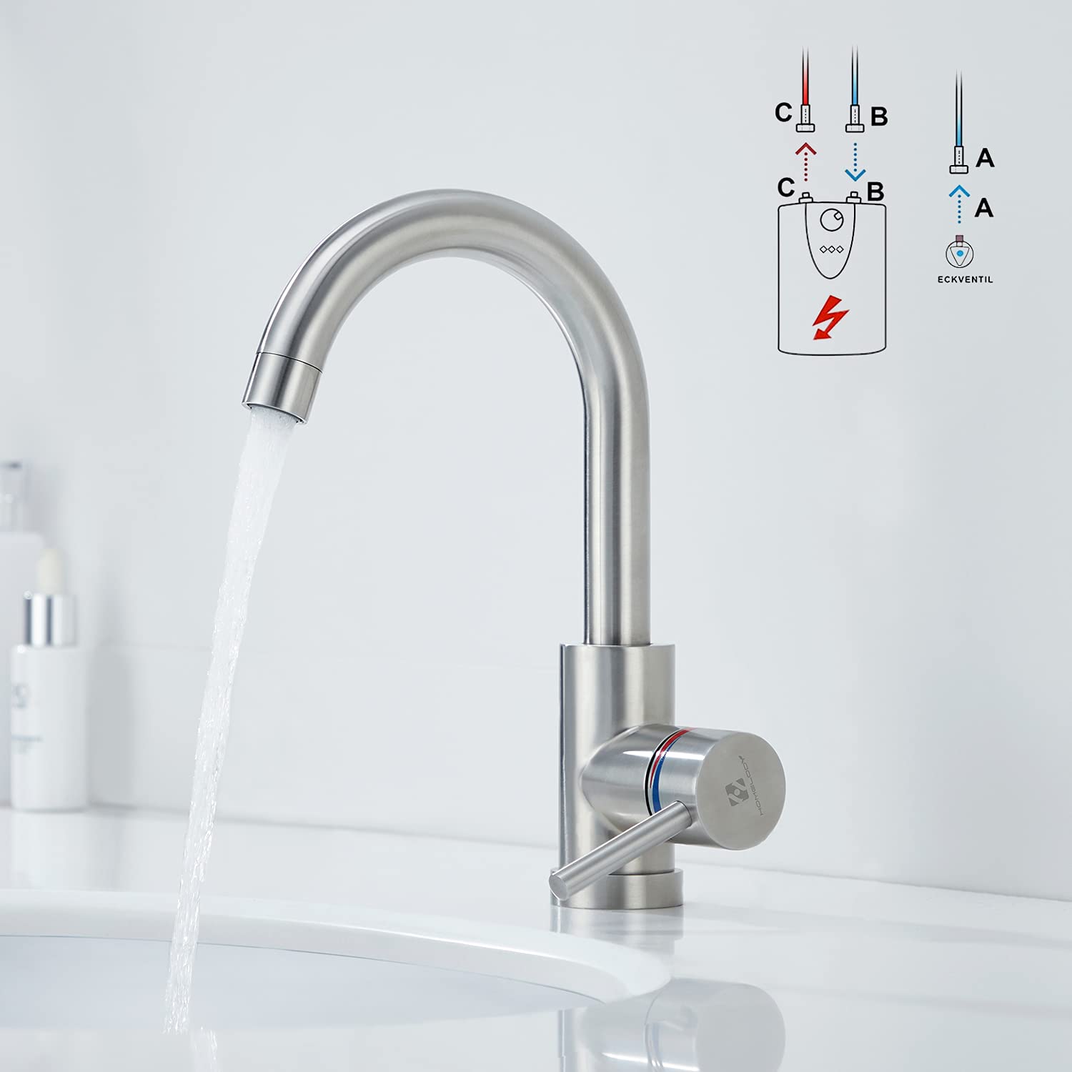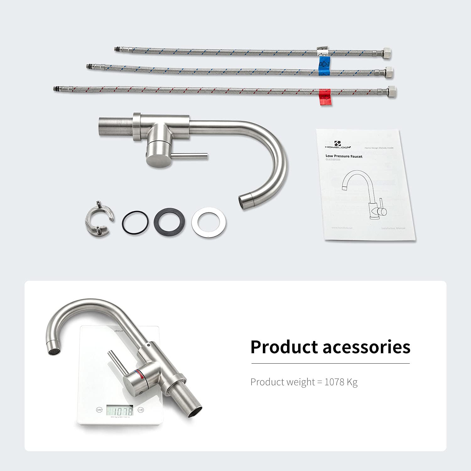 ["360° swiveling faucet for double sinks: This multifunctional faucet design fully meets the water intake requirements under various conditions and is ideal for double sinks and high-flow purified water outlets. The high-quality ABS aerator ensures a soft and rich water performance without splashing or noise, allowing you to save 30% water.","Safe and reliable: The flat open handle avoids scalding from high temperatures of boiling water. The temperature is regulated by the handle angle, with the handle heating up from cold. However, please note that this faucet cannot regulate water flow! It is specially designed for use in low-pressure hot water heaters and solves the problem of low-pressure dripping often seen in conventional low-pressure faucets.","Quality materials: Made of high-quality 304 stainless steel with wire drawing process, this low-pressure faucet is durable and corrosion resistant. Thanks to the PEX material hose, the wastewater is non-toxic, colorless, and tasteless.","Clean and hygienic: The valve core uses ceramic sheet sealing technology to protect you from harmful substances such as lead and nickel in the water, preserving your health. In addition, the core is wear-resistant and resistant to high water pressure, so it remains leak-proof even after 500,000 uses.","Easy installation: The three water inlet pipes are already connected to the faucet before leaving the factory and are equipped with color and guide marks to make installation easier and more visual. The mounting fixture uses a durable stainless steel locking nut with screws."]