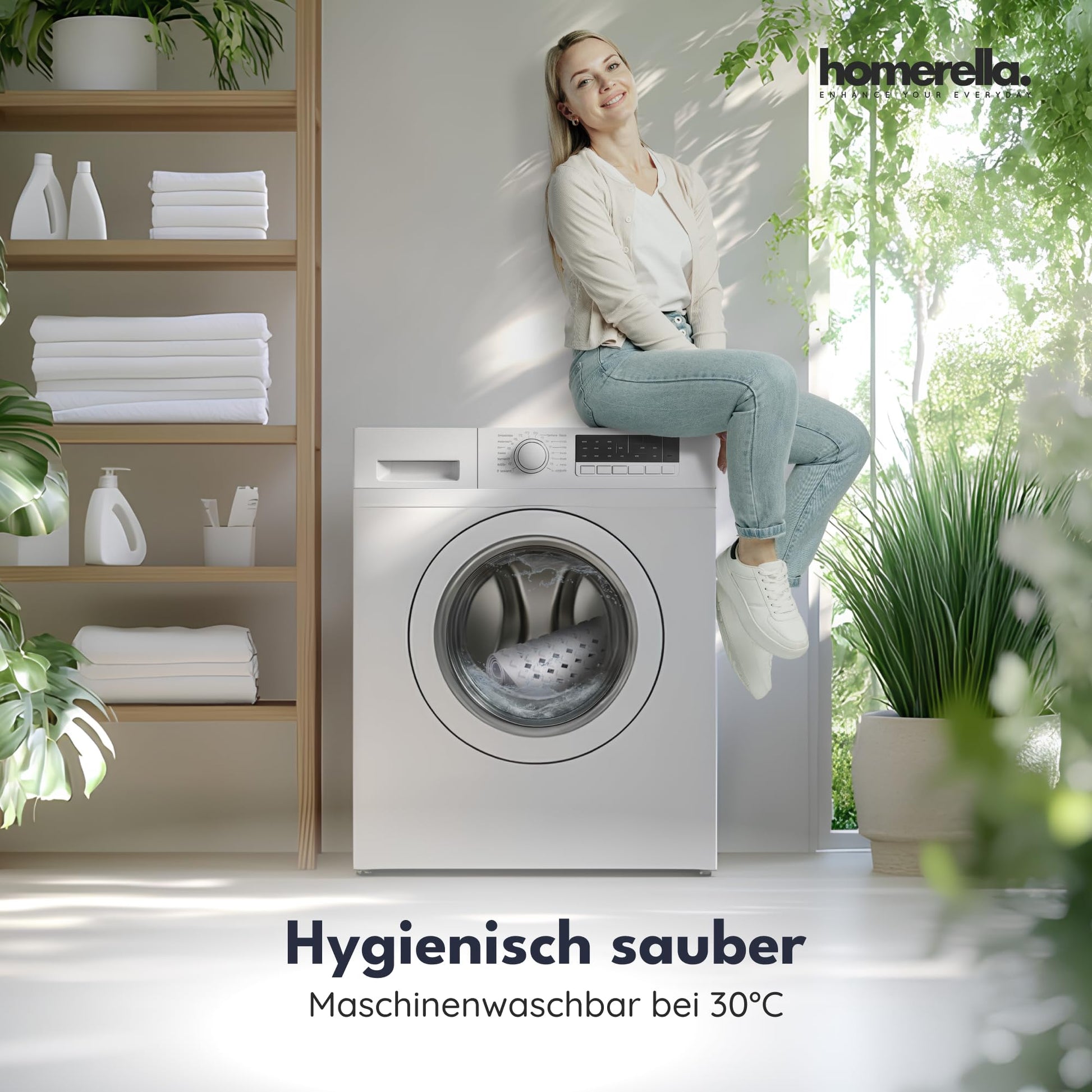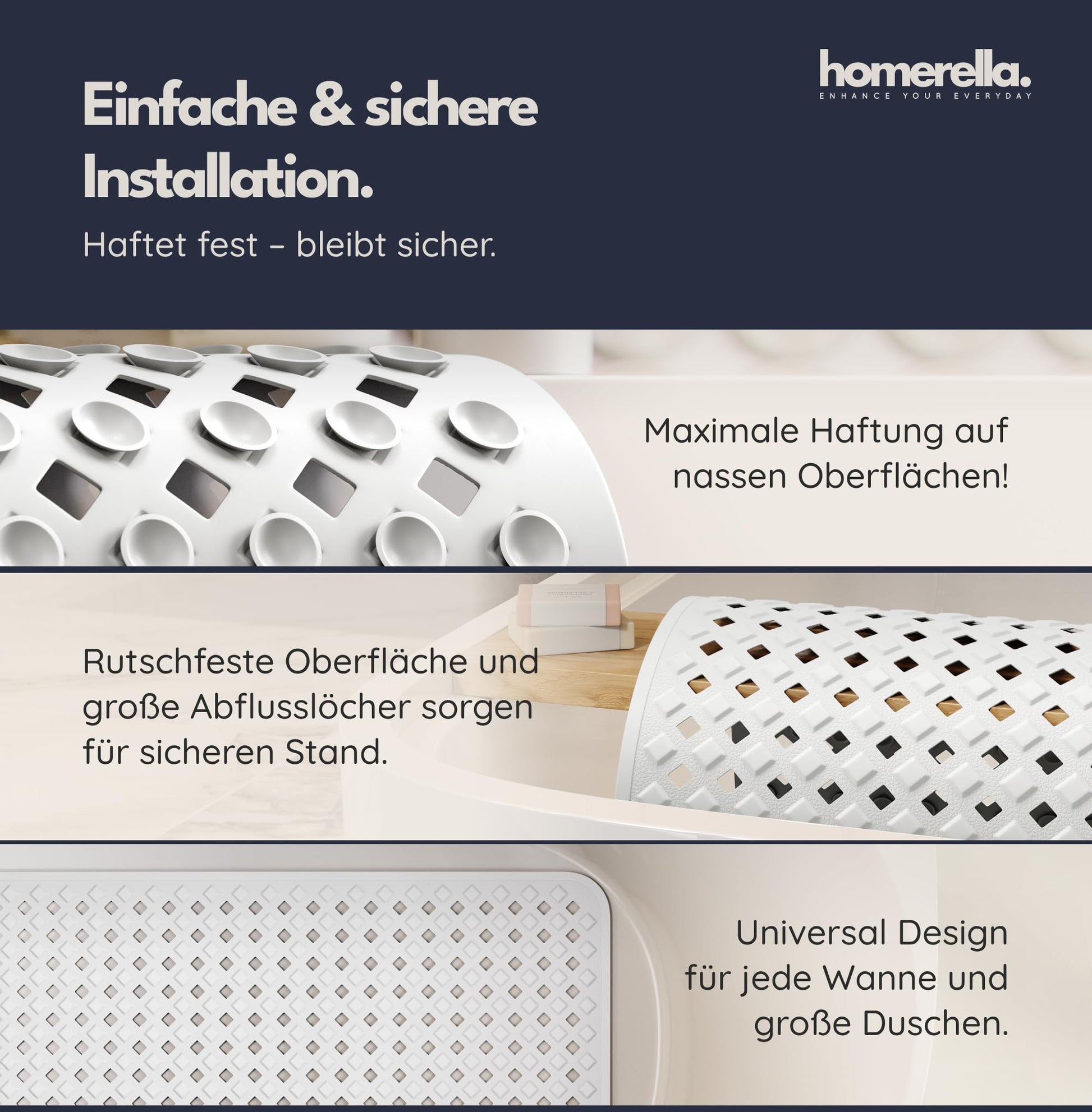 "NON-SLIP? FOR SURE - The HOMERELLA bath mat has over 250 anti-slip suction cups on the bottom for optimal grip. The top side of the non-slip shower mat is equipped with an anti-slip special structure! MOLD? NO CHANCE - The non-slip mat is antibacterial, mold-resistant & machine washable at 30°. Extra large holes in the mat allow water to circulate & drain optimally - no matter where the drain is! FOR KIDS & ADULTS? FOR EVERYONE! - The non-slip mat is ideal for everyone, especially babies, seniors, pregnant women or dogs: The bath mat is latex-free, odorless & BPA free, without phthalates or plasticizers! EASY DRYING? WITH HANGING - Finally, the wet mats are away from the edge of the bathtub! Thanks to the 2 self-adhesive, residue-free removable hooks, the bath mats can dry optimally! HAPPY CUSTOMERS? WE DO OUR BEST! Not satisfied with your delivery? Something missing? Something defective? Please contact us immediately - we will find a solution!"