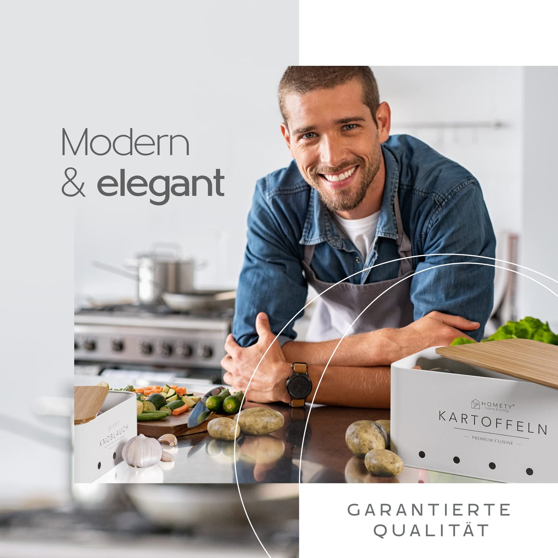 ["KITCHEN STORAGE & ORGANIZATION - easily get a storage box for potatoes, onions, and garlic. A kitchen gadget that is space-saving, stackable, and modern.", "STYLISH KITCHEN DECOR - high-quality, timeless, our kitchen organizer set for onion storage, potato storage, and garlic is the highlight in your kitchen or pantry.", "COOKING MADE FUN - store and have at hand 3 lbs of potatoes, 4 lbs of onions, and 5 garlic bulbs easily. Vegetable storage made simple and beautiful.", "HIGH-QUALITY AND DURABLE - our kitchen storage set is easy to clean, suitable for up to 6.6 lbs of potatoes, 4.4 lbs of onions, and 5 garlic bulbs. Air holes.", "OUR HOMETY QUALITY PROMISE - If you are not 100% satisfied with our storage container set, you will easily get your money back for 100 days!"]