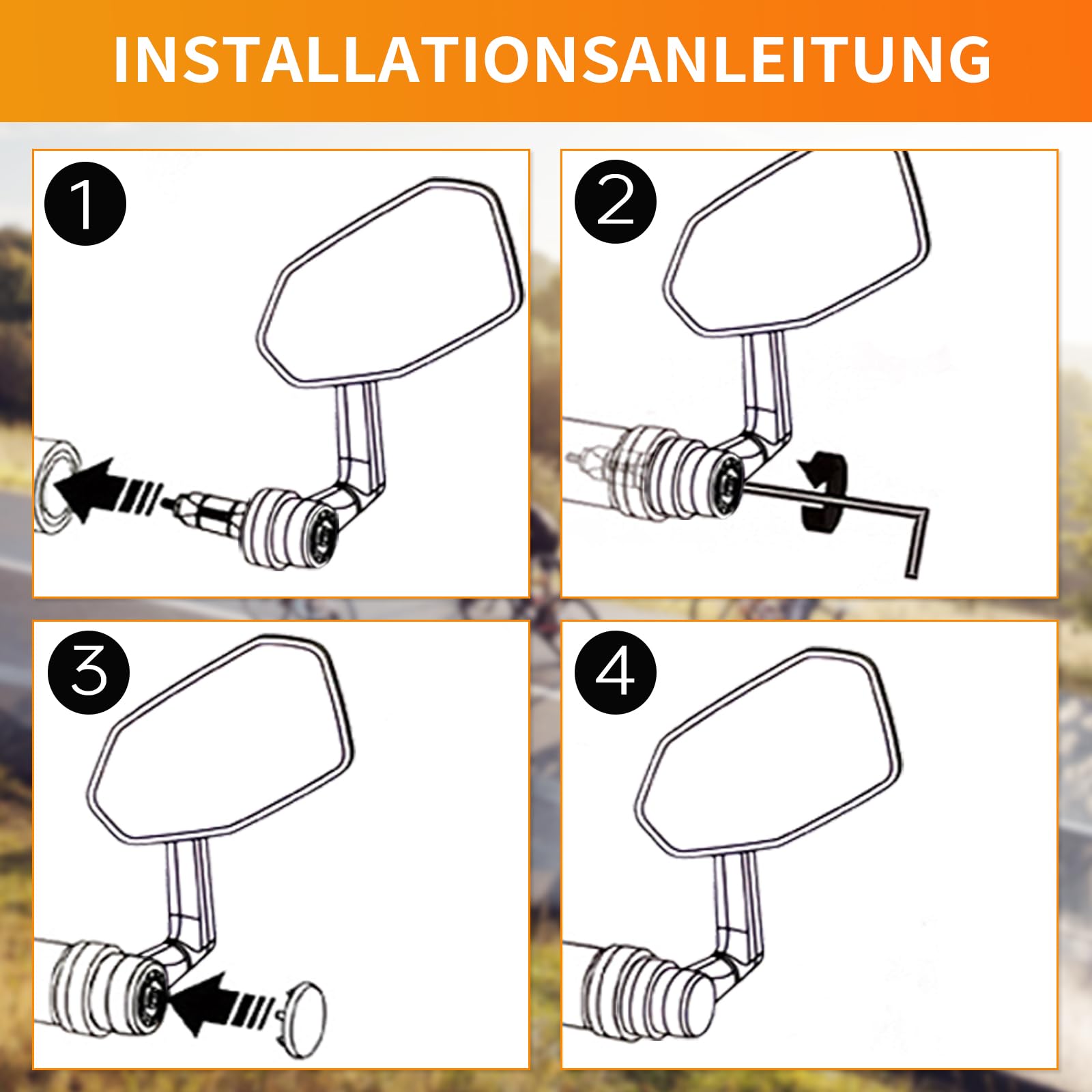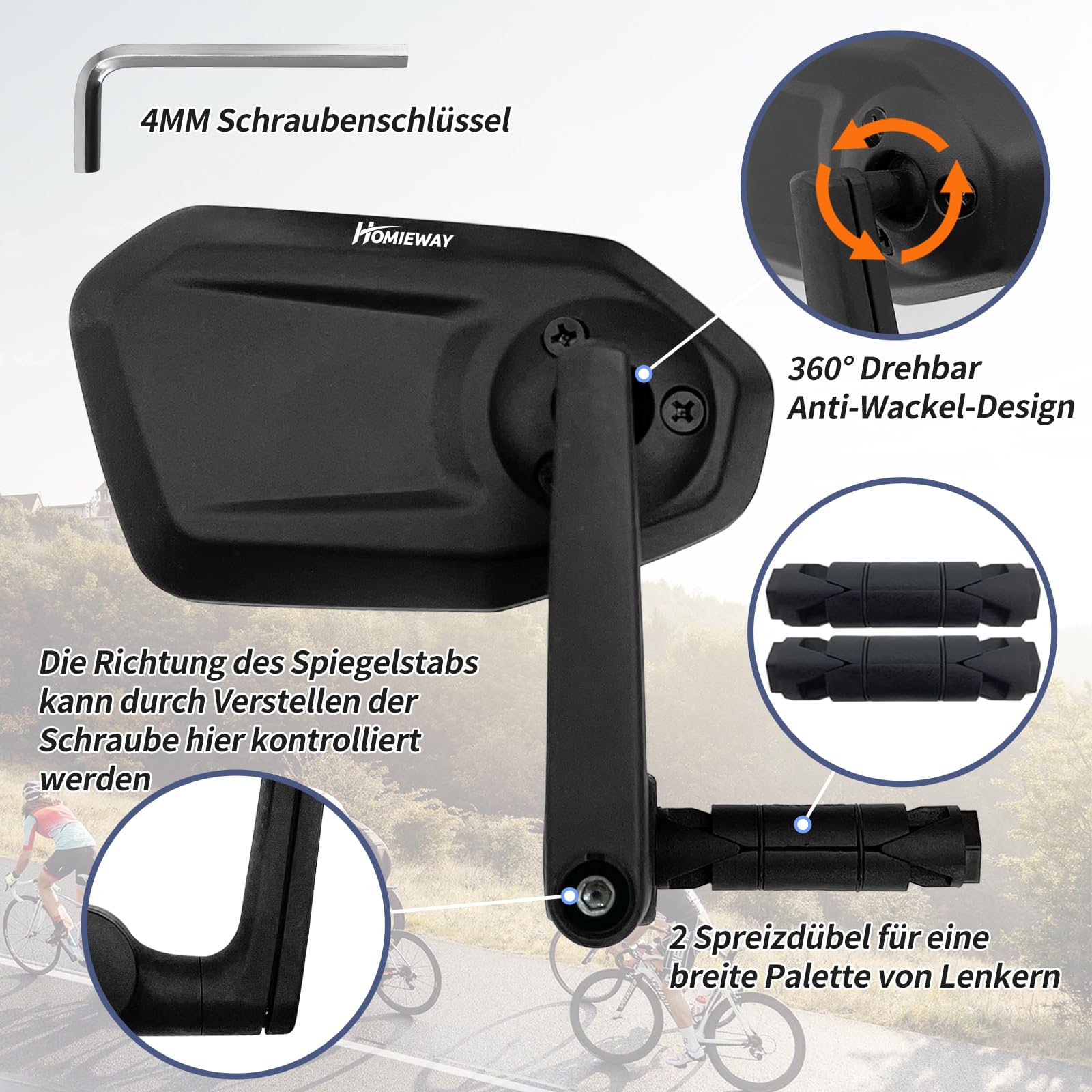 ["Latest Design: The mirror rod of the bike mirror is equipped with a unique direction control that can be adjusted in different directions during installation, such as up, down, outwards, etc., to ensure that our arms do not appear in the image and obstruct the view","Clear and Stable: The mirror surface of the large mirror is adjustable by 360°, providing a clear and wide view. The bike mirror and mirror rod are secured with multiple screws, making the mirror more stable and less likely to wobble","Space-saving: The E-bike handlebar mirror does not take up any space on the handlebars, allowing for the mounting of other bike accessories such as a bell and phone holder. The bike mirror can be folded and is easy to transport","Versatile Universal: The E-bike mirror comes with two sets of expansion plugs: 15-17.5mm and 17.5mm-20mm, making the mirror suitable for various open handlebars of outdoor bikes, E-bikes, city bikes, road bikes, mountain bikes, electric scooters, etc. Material: ProVision mirror made of real glass, providing a clearer and more stable reflection even in poor lighting conditions. The high-quality nylon frame is galvanized coated and not easily scratched or damaged"]