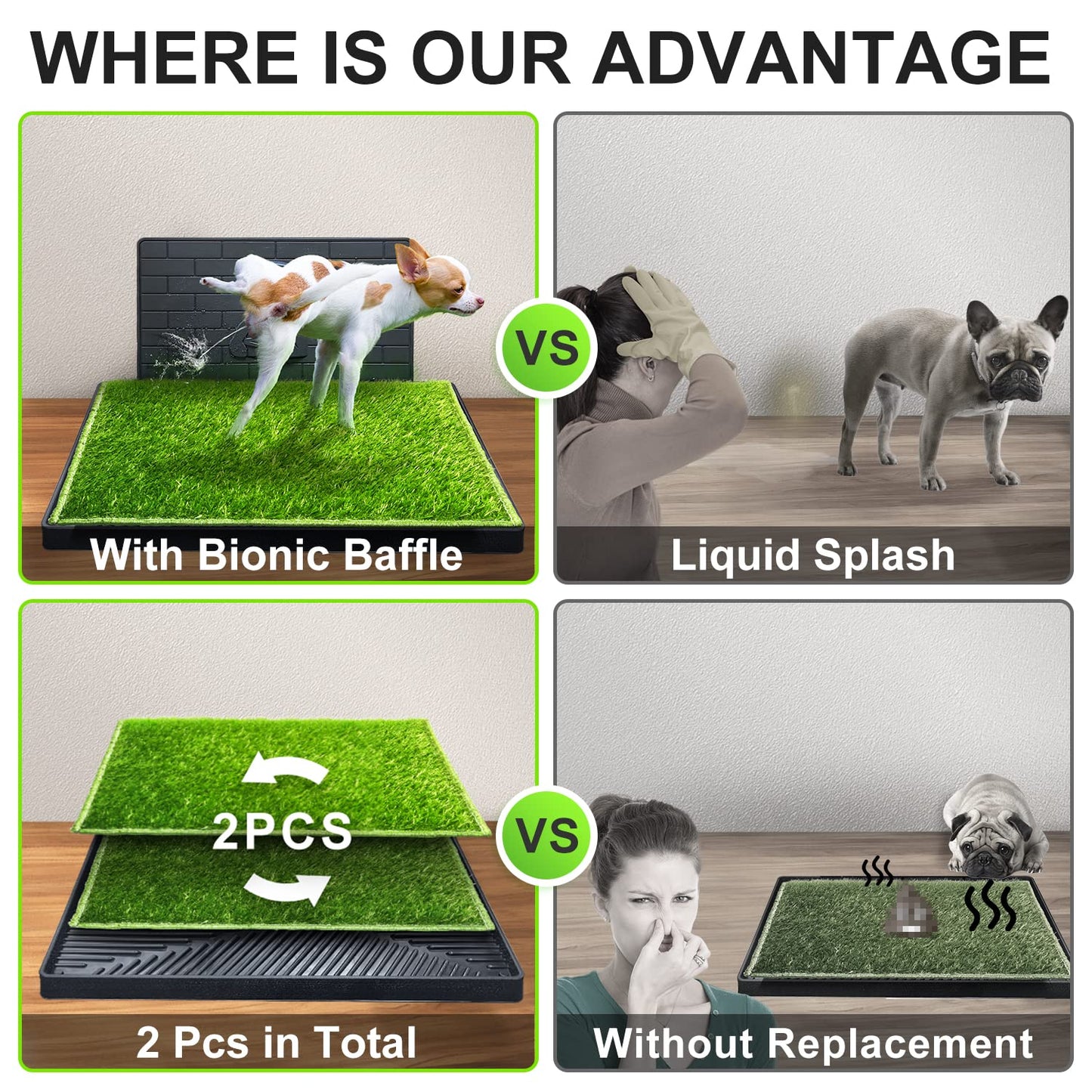 "【Pee Baffle+3-piece System, easy to clean】: Hompet dog grass pad with tray adopts a three-layer system. The dog potty grass is on top, the printed base tray accelerates urine flow, which is collected through drainage holes and leads to the lower daser. The improved pee baffle can effectively guide pets to urinate, prevent urine, and keep the floor clean.