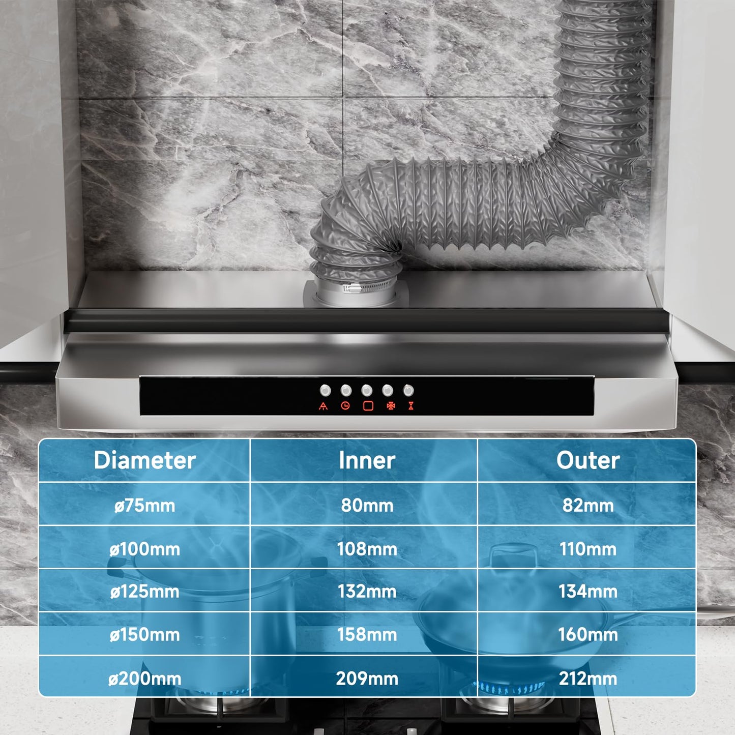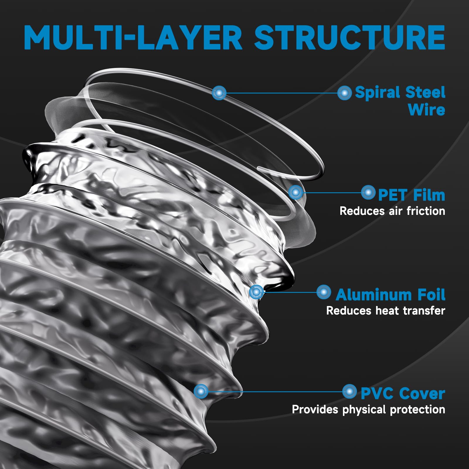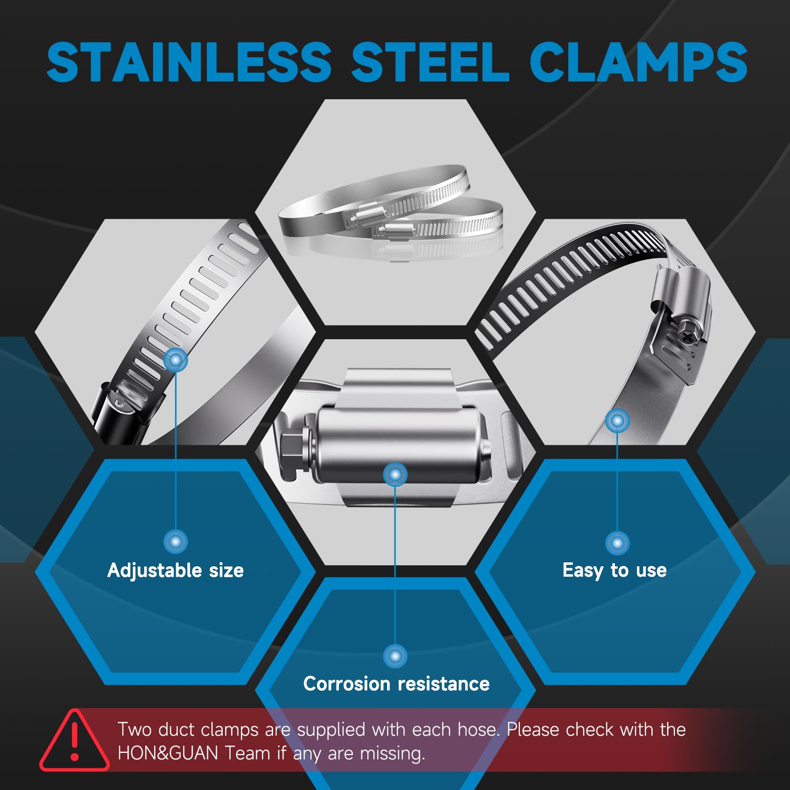 ["Pipe information: The gray exhaust hose, with an inner diameter of about 105mm and an outer diameter of about 110mm, can be extended up to 5 meters. The package also includes two clamps for securing the ventilation hose.","Installation: The air outlet is inserted into this PVC hose when in use. The actual inner diameter of this 100mm pipe should be greater than 100mm, 105mm, so that the pipe can fit over the outside of the air outlet. Secure it with suitable clamps and other materials such as a rope.","Durability: This Hon&Guan exhaust ducts are made of high-quality aluminum foil and PVC, PET, and steel wire helix to maintain shape, preventing gas leaks and protecting the duct from corrosion.","High temperature resistant: The operating temperature of the ventilation hose is from -30℃ to 80℃ (-86°F ~ 176°F). Do not touch the pipe when in use to avoid burns.","Flexibility: The ventilation duct can be stretched and bent as desired. The exhaust pipe can be bent 360 degrees and extended up to 5 meters, allowing it to be cut into as many pieces as needed.","Application: The exhaust hose is mainly used for portable air conditioners, dryers, exhaust fans, tube fans, range hoods, hydroponics, ventilation systems, etc."]
