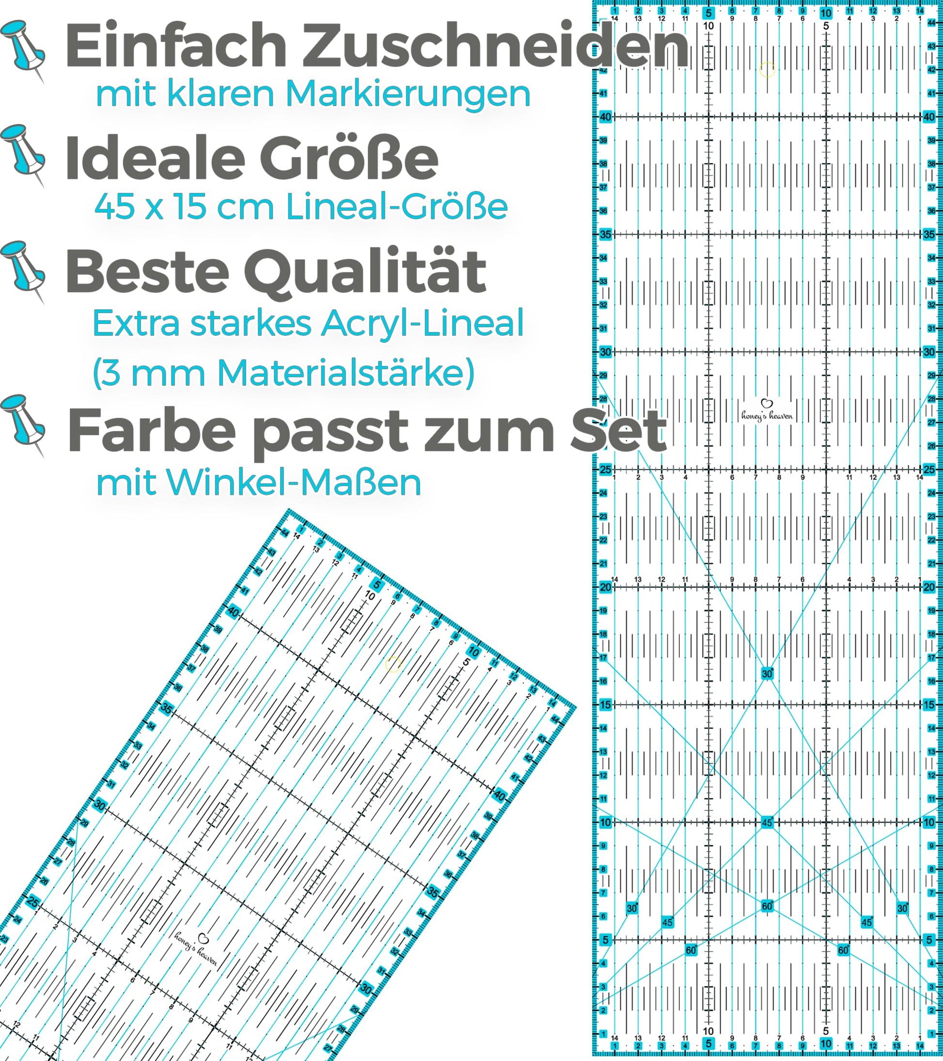 "❤️ HIGH-QUALITY SEWING RULER - The patchwork ruler in a practical size of 30 x 15 cm is not too big and not too small. A professional sewing ruler with cm grid and various angle degrees.",