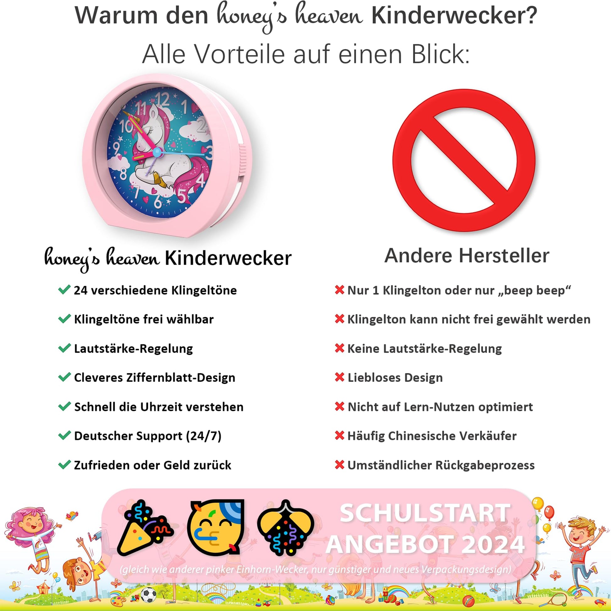 ππ₯³π SCHOOL START 2024 ππ₯³π Identical to other pink unicorn alarm clocks, just new packaging and cheaper for back to school! --- π PERFECT FOR BACK TO SCHOOL - This colorful kids alarm clock with Lilly the Unicorn helps your child wake up on time and makes every new morning a joyful experience. --- π©βπ« PERFECT FOR STARTING SCHOOL - This kids alarm clock is designed for children and is sturdy. --- π΅ VARIETY GUARANTEED - 24 different melodies are available as alarm options (including classics like Jingle Bells, Oh My Darling Valentine, and many more). Variety is guaranteed! --- π GREAT GIFT - Looking for a suitable gift for back to school, Christmas, birthdays, or the start of school? With this colorful and practical alarm clock, you're in the right place - even for grandchildren and godchildren. This is a meaningful gift with a high learning effect! --- π PERFECT FOR SCHOOL STARTERS OR AS A CHRISTMAS GIFT!