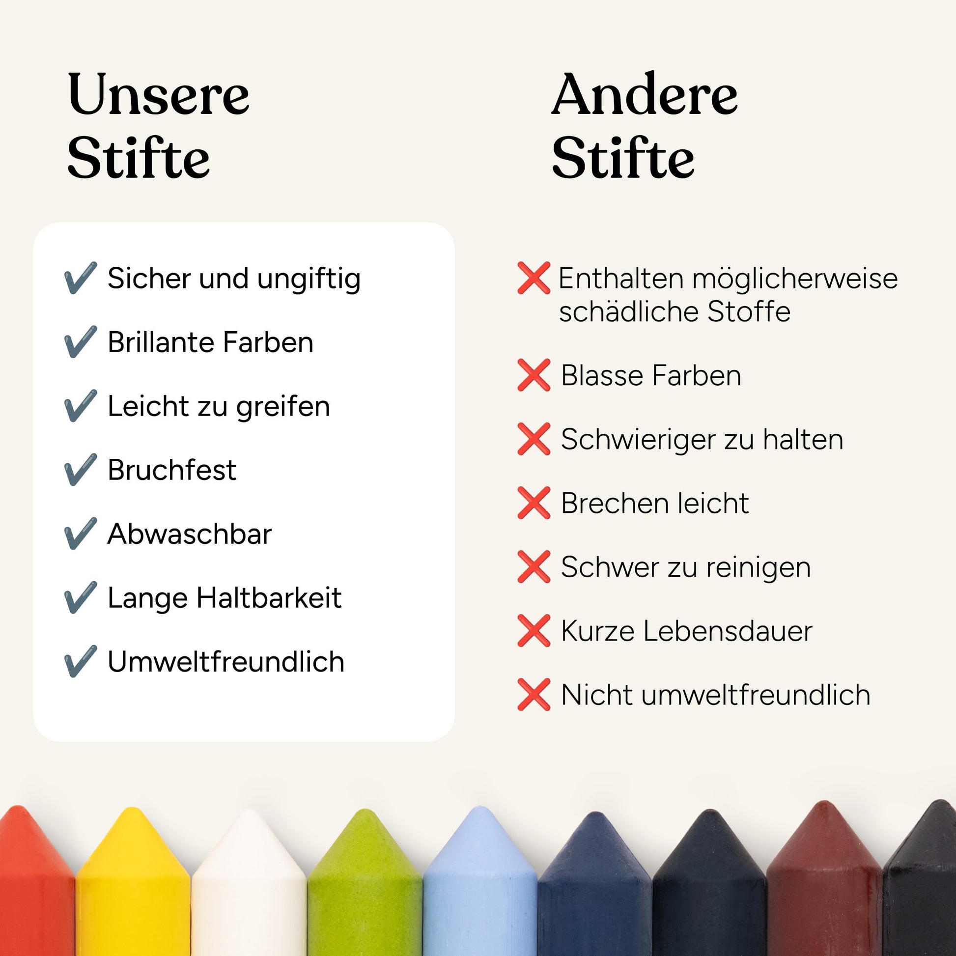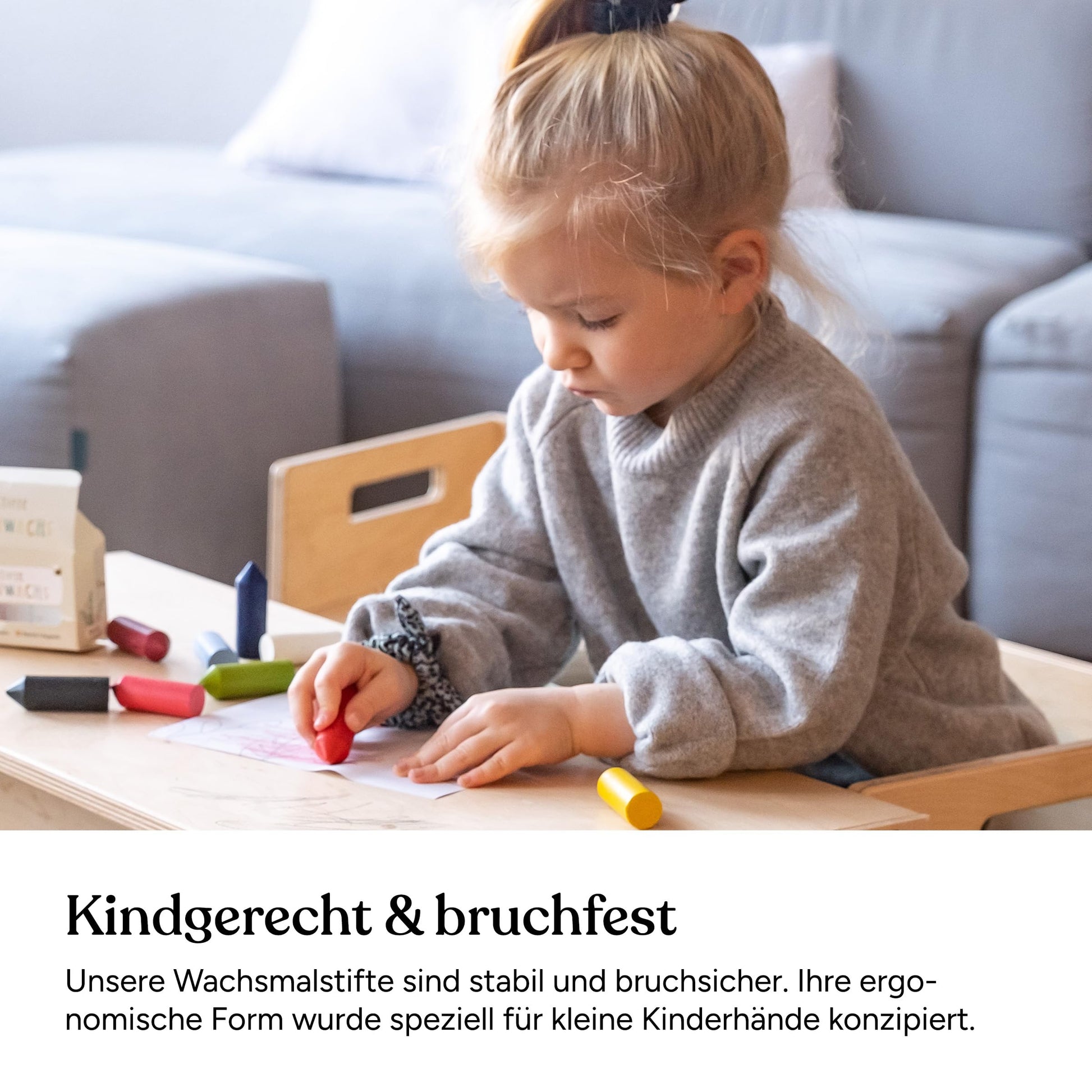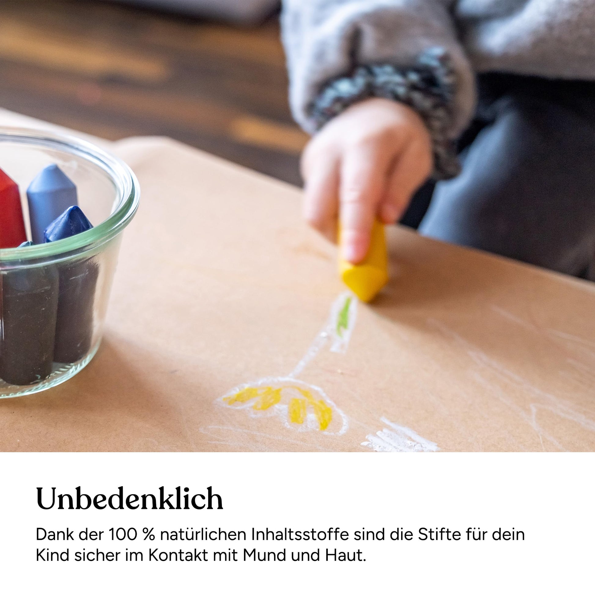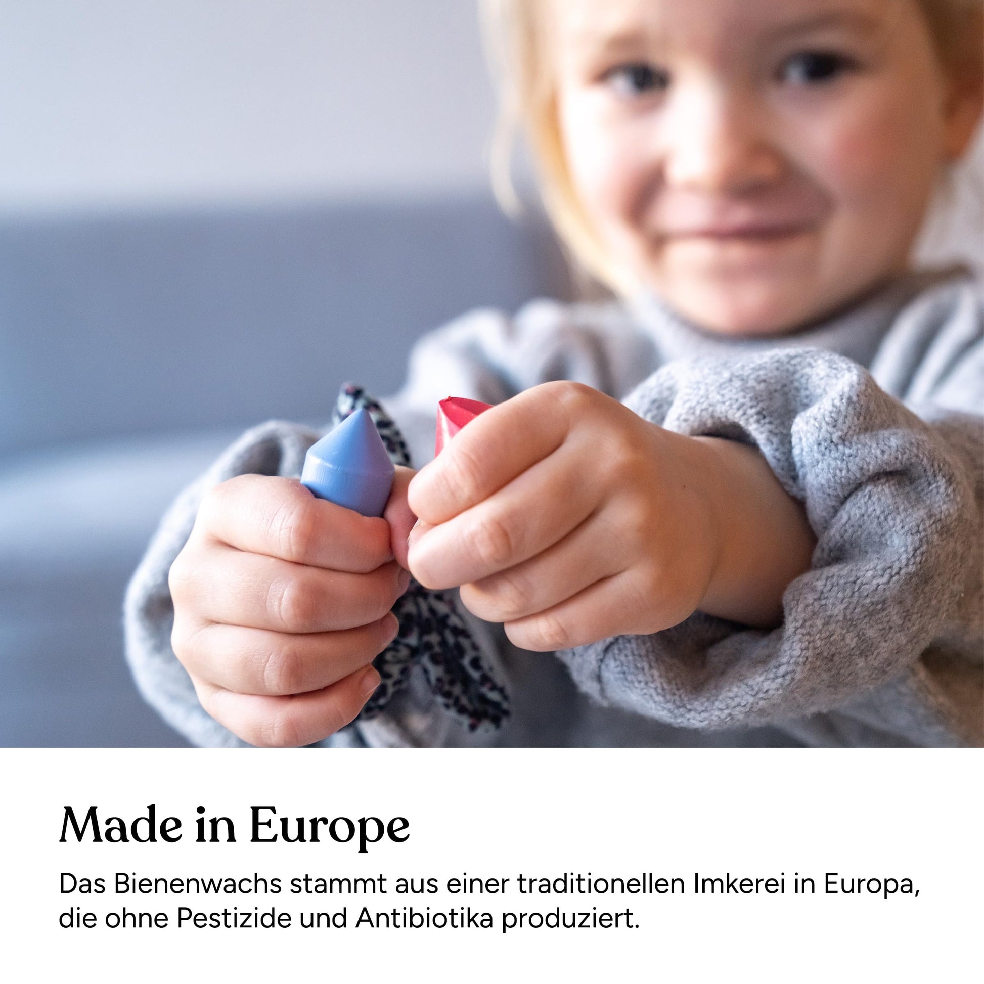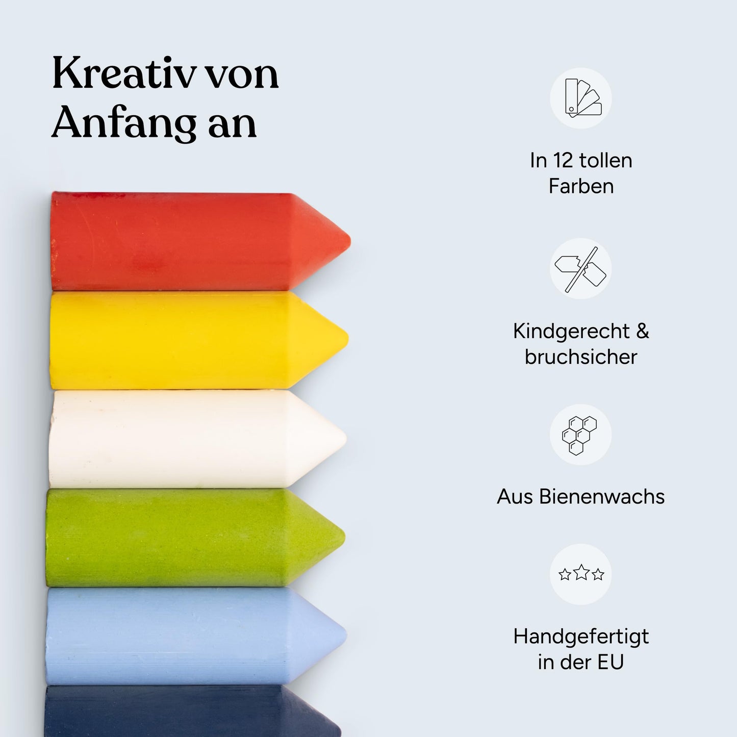 ["NATURAL BEESWAX CRAYONS FOR TODDLERS / NON-TOXIC - Beeswax crayons for children. Developed with kindergarten teachers and art educators. Suitable for children from 1 year old.","ERGONOMIC & BREAK-RESISTANT CRAYONS - The sturdy crayons are specially designed for small children's hands. The 12 vibrant colors are perfect for early drawing and coloring.","SAFE & NATURAL - Made with beeswax and organic food-grade pigments, the crayons are safe for contact with mouth and skin. Tested according to DIN EN 71 for children's toys.","SUSTAINABLE BEESWAX - The beeswax used in the crayons is a by-product of honey production and comes from a European beekeeping operation.","MADE IN EU - The crayons for toddlers from 1 year old are handcrafted in the EU and are fully biodegradable. Perfect as a gift."]