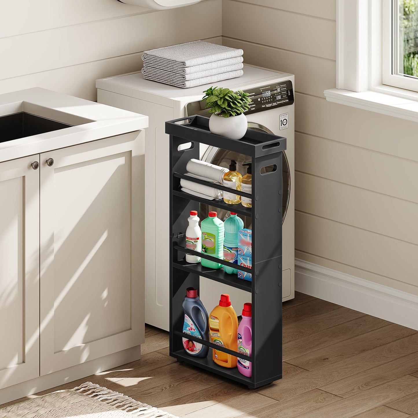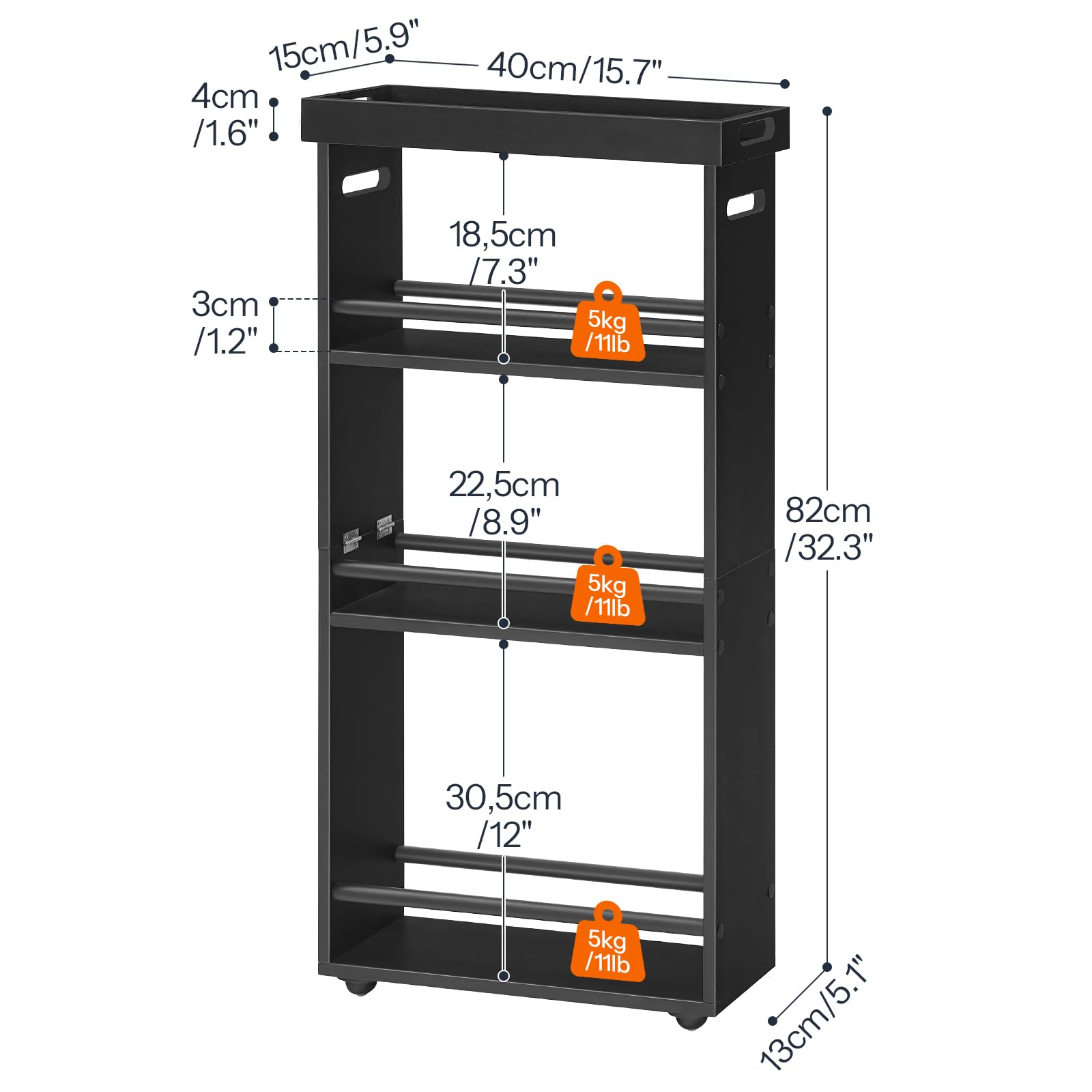 "Multi-layer storage: This storage cart with 4 levels features 3 open shelves and 1 removable top tray, providing ample space. Items of different heights can be neatly arranged."