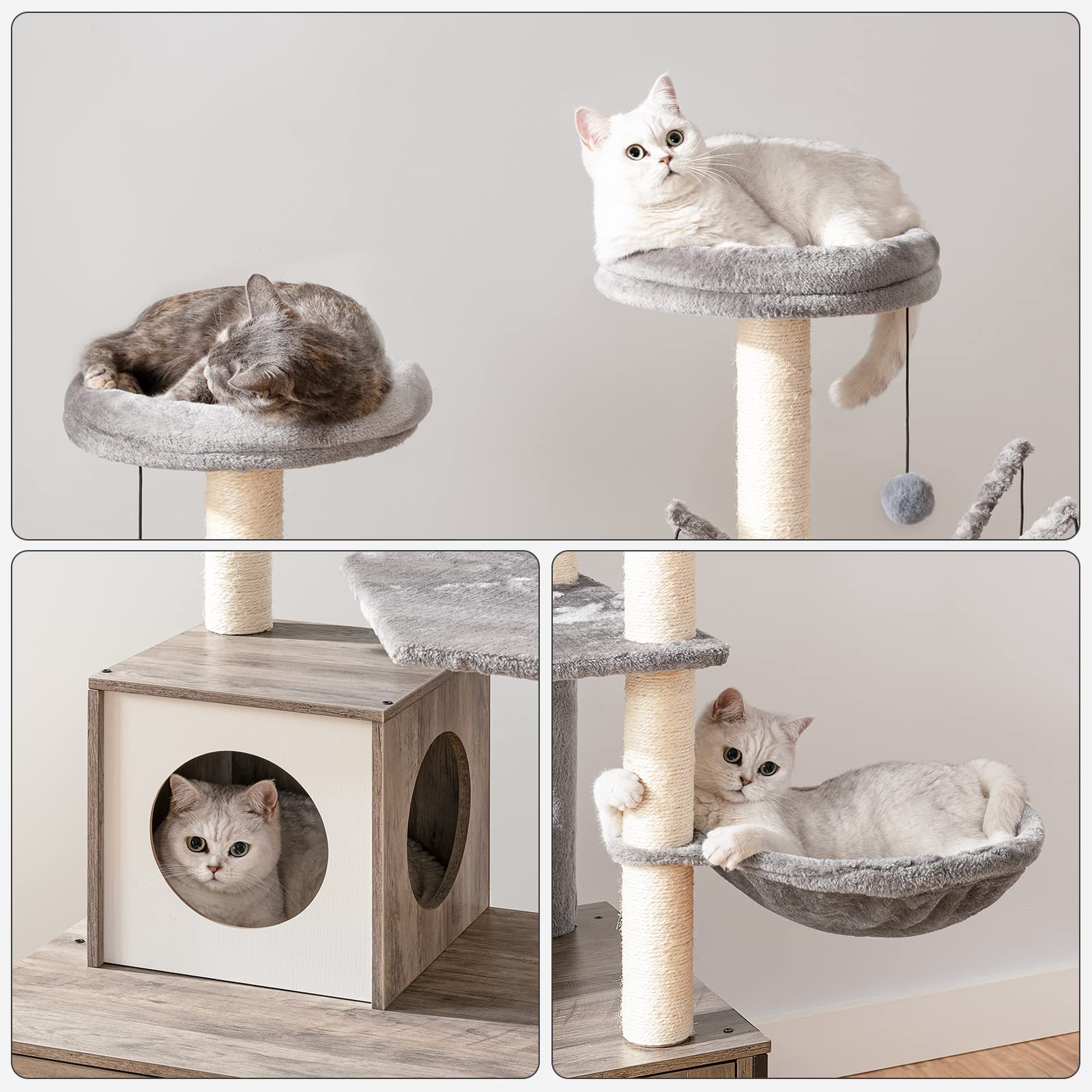 ["All-in-One scratching post: The All-in-One cat furniture can fulfill cats' needs such as playing, resting, and relaxing. It includes a cat litter box, cat hammock, observation platforms, sisal pole, plush ball sticks, creating a dream cat tower that cats will immediately fall in love with.","Hidden litter box cabinet: At the bottom of the cat tree is a cat litter box with two breathable slatted doors, providing the cat with more privacy and keeping the space tidy. It measures 70 x 48 x 132 cm. In addition to serving as a litter box, it can also store cat supplies.","Multiple resting spots: Is the cat tired from playing? This scratching post has multiple resting spots - spacious platforms with plush cushions and a cute cat hammock. There is also an additional square cat litter box. With two round holes (diameter: 17.5 cm), the cat can freely enter and exit.","Designed to fit feline nature: The product uses sisal poles of different heights to create cat towers that cats can climb. The sisal rope is strong for sharpening claws. The plush balls serve as a scratching post for the cat and simulate hunting. The plush ball sticks are detachable for easy interaction with the cat.","Sturdy materials: Our cat climbing tree is made of high-quality particle board, the construction is strong, and the four adjustable feet on the bottom increase stability and protect your floor from scratches, so you can rest assured that your lively cat can enjoy climbing and jumping."]