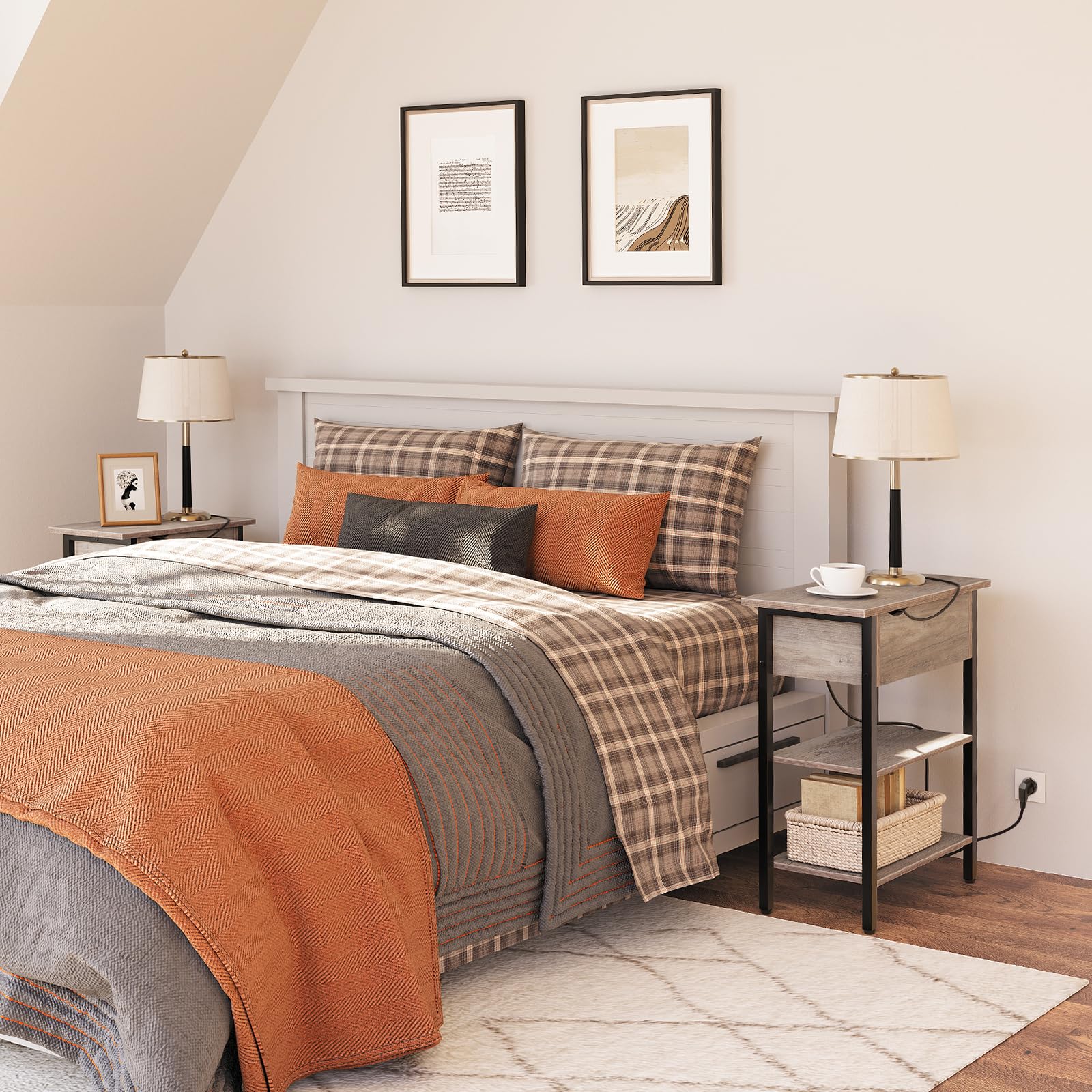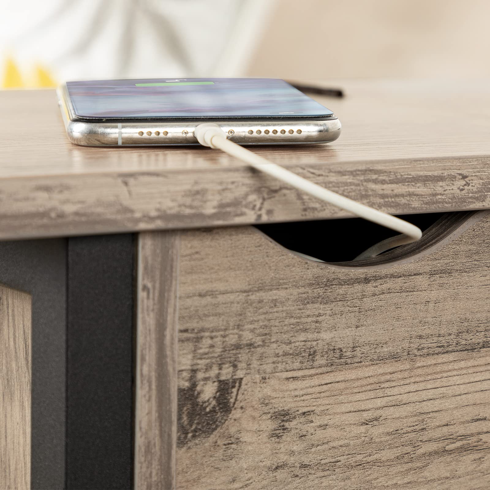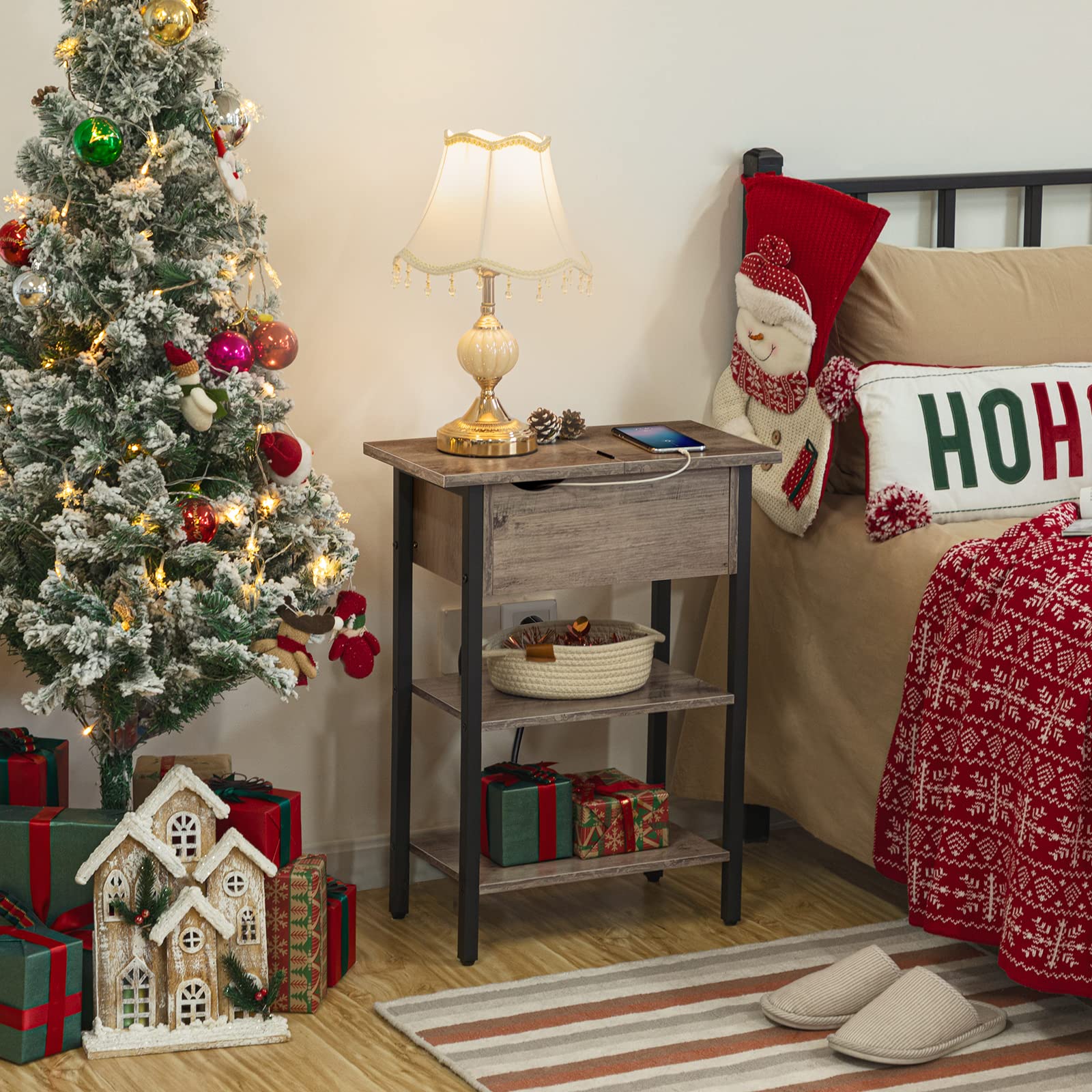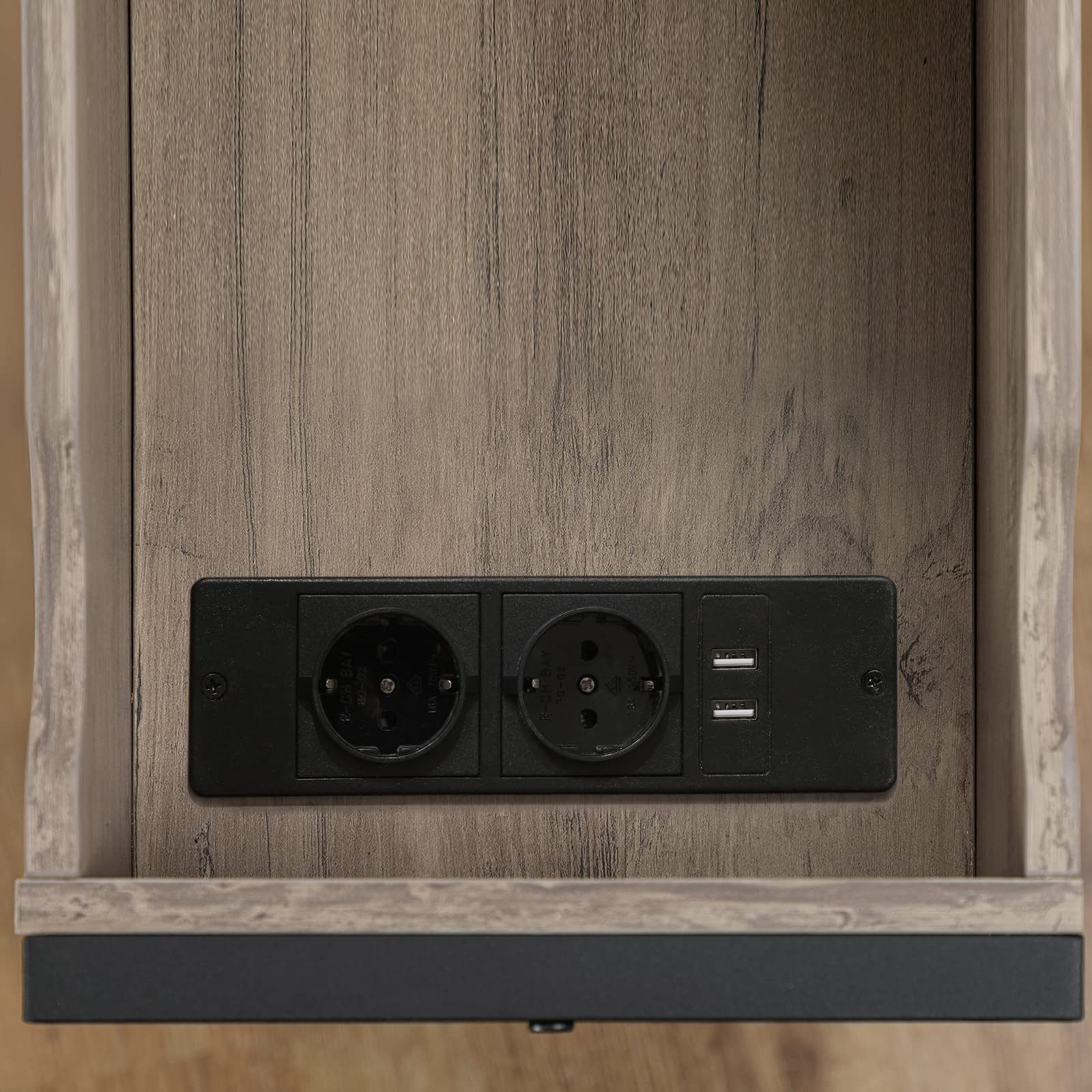 ["Minimalist style: With a matte black metal frame for industrial style and a greige wood top for vintage design, this side table is a focal point and a decorative piece for your home","Flip-top design: The top drawer flips up to provide concealed storage, while the bottom half is open for displaying decor, lamps, books, etc. The coffee table measures 48 x 26 x 64 cm, saving space to keep your various items organized and the room tidy","Multipurpose: Side table with charging station, the 150 cm long charging station features two 2-hole outlets and 2 USB ports for easy charging of your phone, tablet, lamp, or laptop, keeping everything you need at hand","Safe and friendly: The charging station has a separate storage area, so you don't have to worry about children accidentally touching it while charging. You can also place your drinks on the table without worrying about spills, and the side cutouts help you say goodbye to the annoying cable mess on the table","Easy assembly: Thanks to the easy-to-understand instructions, numbered parts, and supplied accessories, you can quickly and easily assemble the nightstand"]