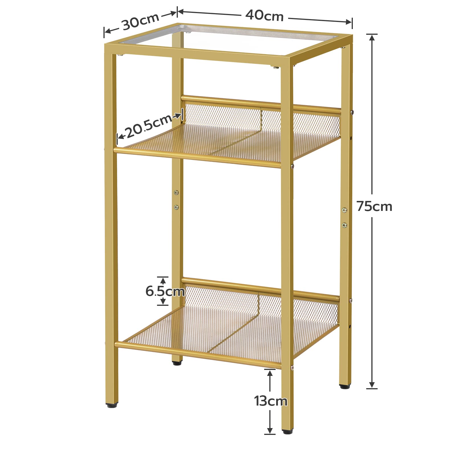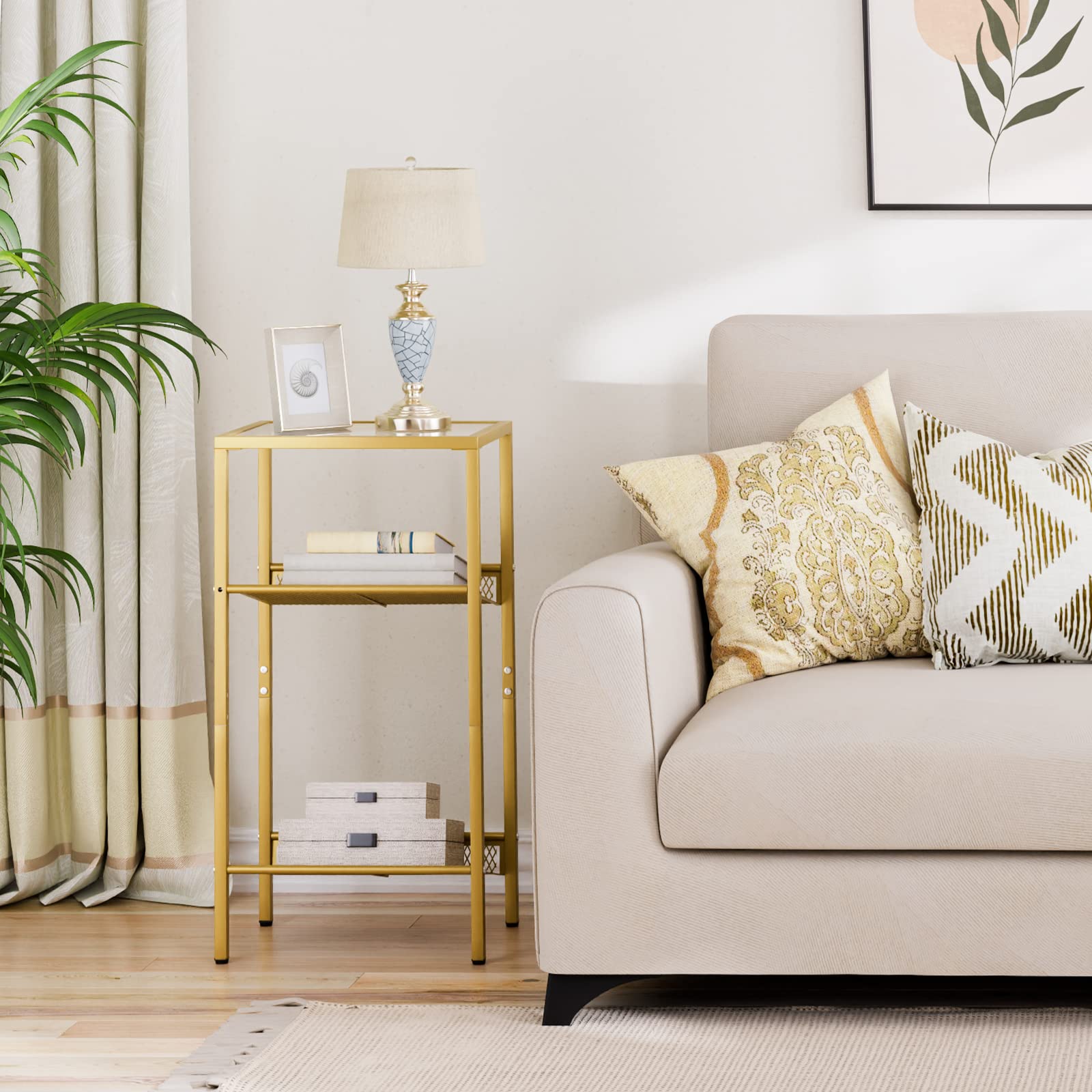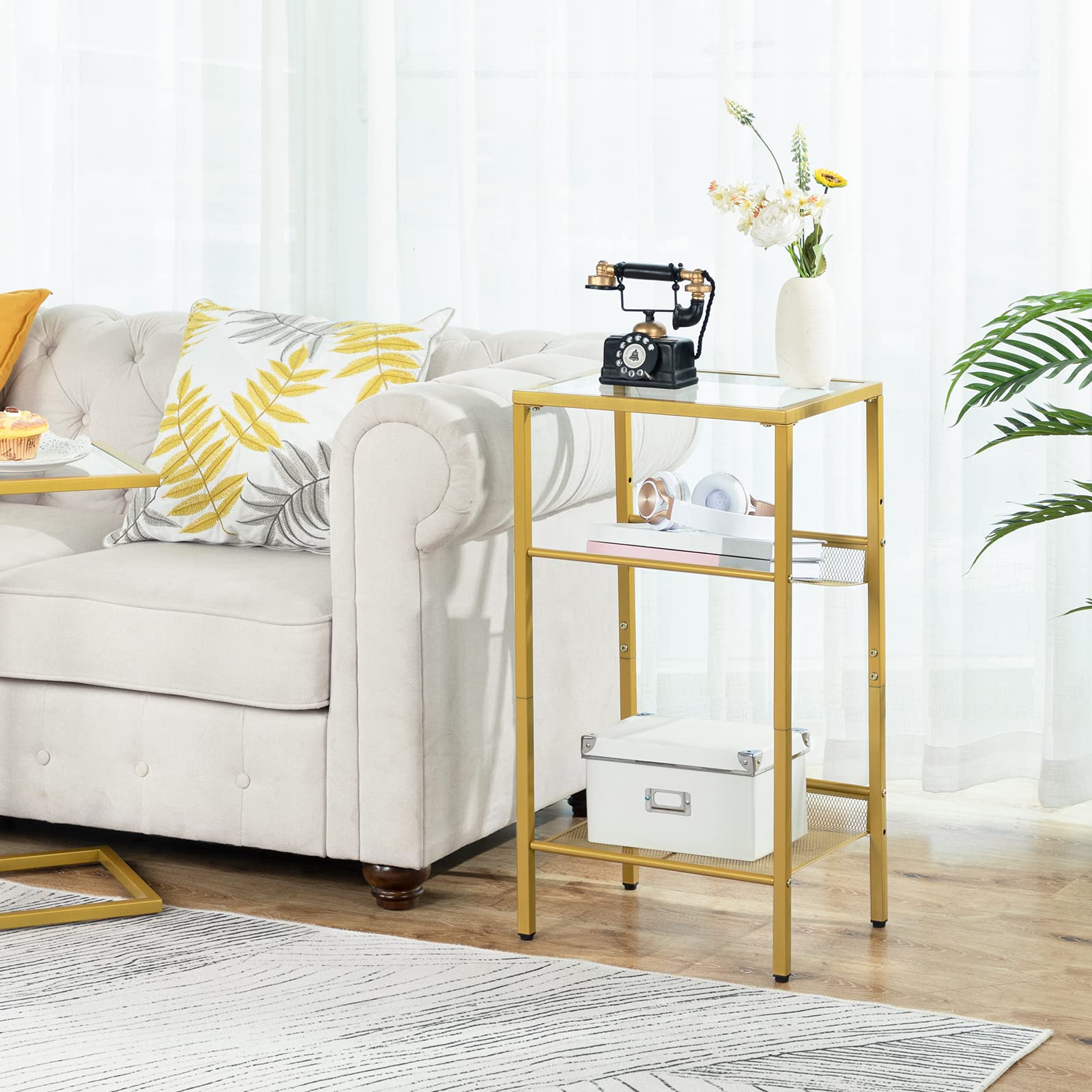 HOOBRO Side Table Gold, Telephone Table, 3-Tier Nightstand with Tempered Glass Top and Grid, Coffee Table for Living Room, Bedroom, Gold Color EGD04DH01