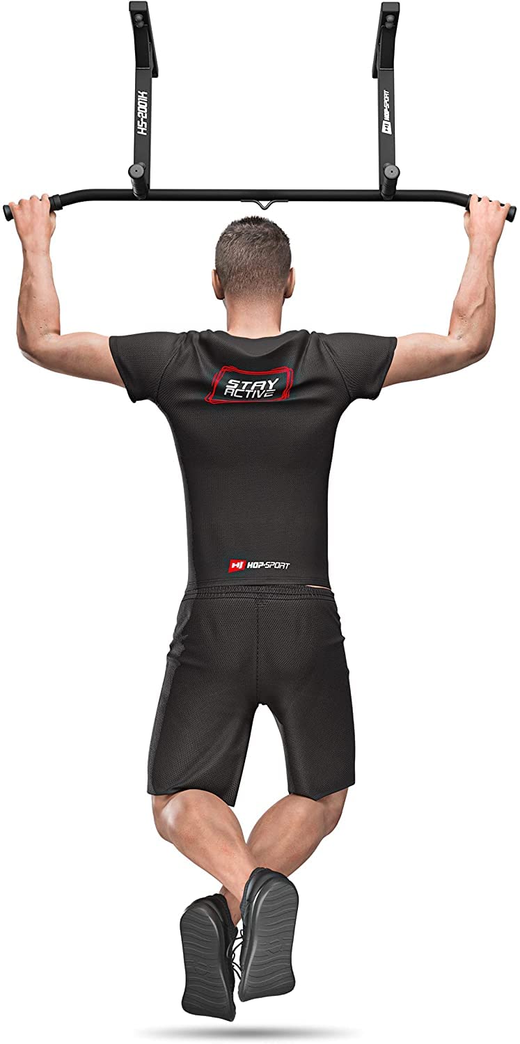 ["MULTIFUNCTIONAL TRAINING DEVICE: The HS-2001K is a unique ceiling-mounted pull-up bar. With it, you can perform classic pull-ups as well as other exercises (e.g. aerobic)","6 ANTI-SLIP HANDLES: The 6 anti-slip handles provide a wider range of training options than traditional pull-up bars. You can perform pull-ups in overhand, underhand, hammer grip, as well as close grip variations","STABILITY AND QUALITY AT THE HIGHEST LEVEL: Made of powder-coated steel, it can support up to 210 kg with its 25 mm diameter. The powder coating protects it from corrosion, abrasion, and mechanical damage","ADDITIONAL BRACKET: An additional bracket in the middle of the pull-up bar allows you to mount a punching bag or TRX bands, as well as resistance bands","PREMIUM PROTECTIVE GLOVES: The included neoprene protective gloves are designed to prevent your hands from slipping off the handles during intense training, reducing the risk of injury."]