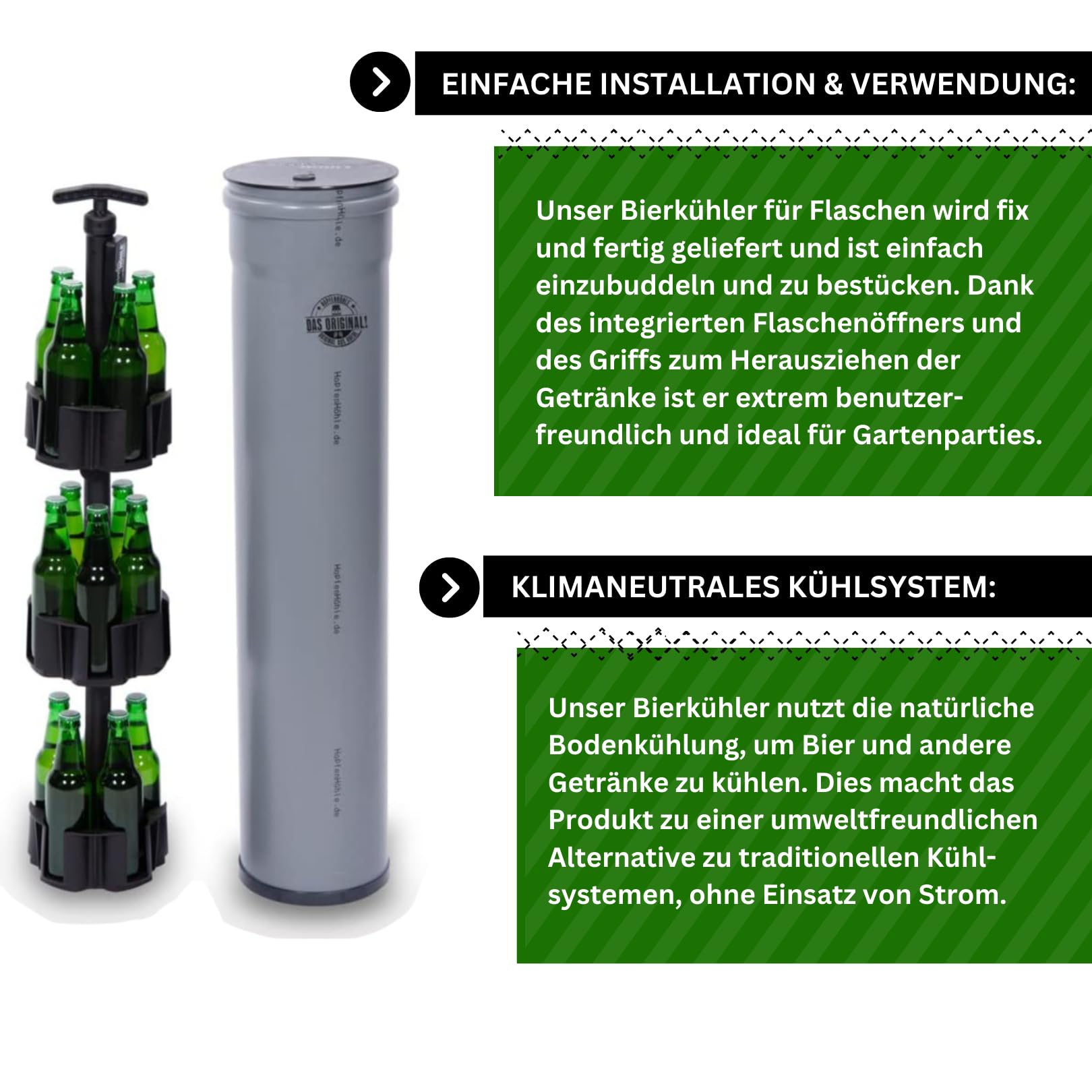 "CLIMATE-NEUTRAL COOLING SYSTEM: Our beer cooler uses natural ground cooling to chill beer and other drinks. This makes the product an environmentally friendly alternative to traditional cooling systems, as no power source or chemical coolants are needed.