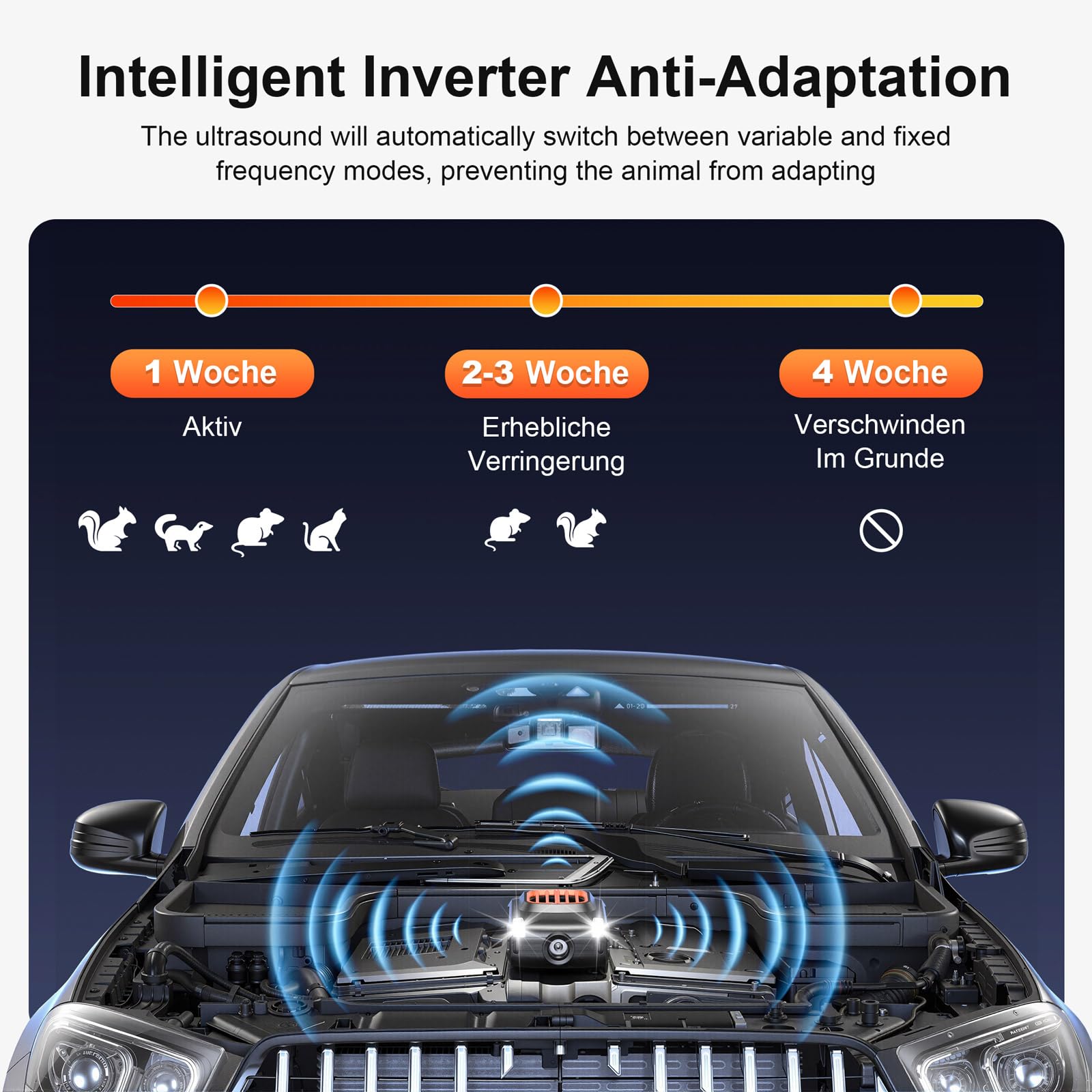 Smart Switch: The weasel deterrent automatically turns off when the car is started and turns on again after 120 seconds when parked. This saves energy and preserves the car battery, making driving more pleasant.