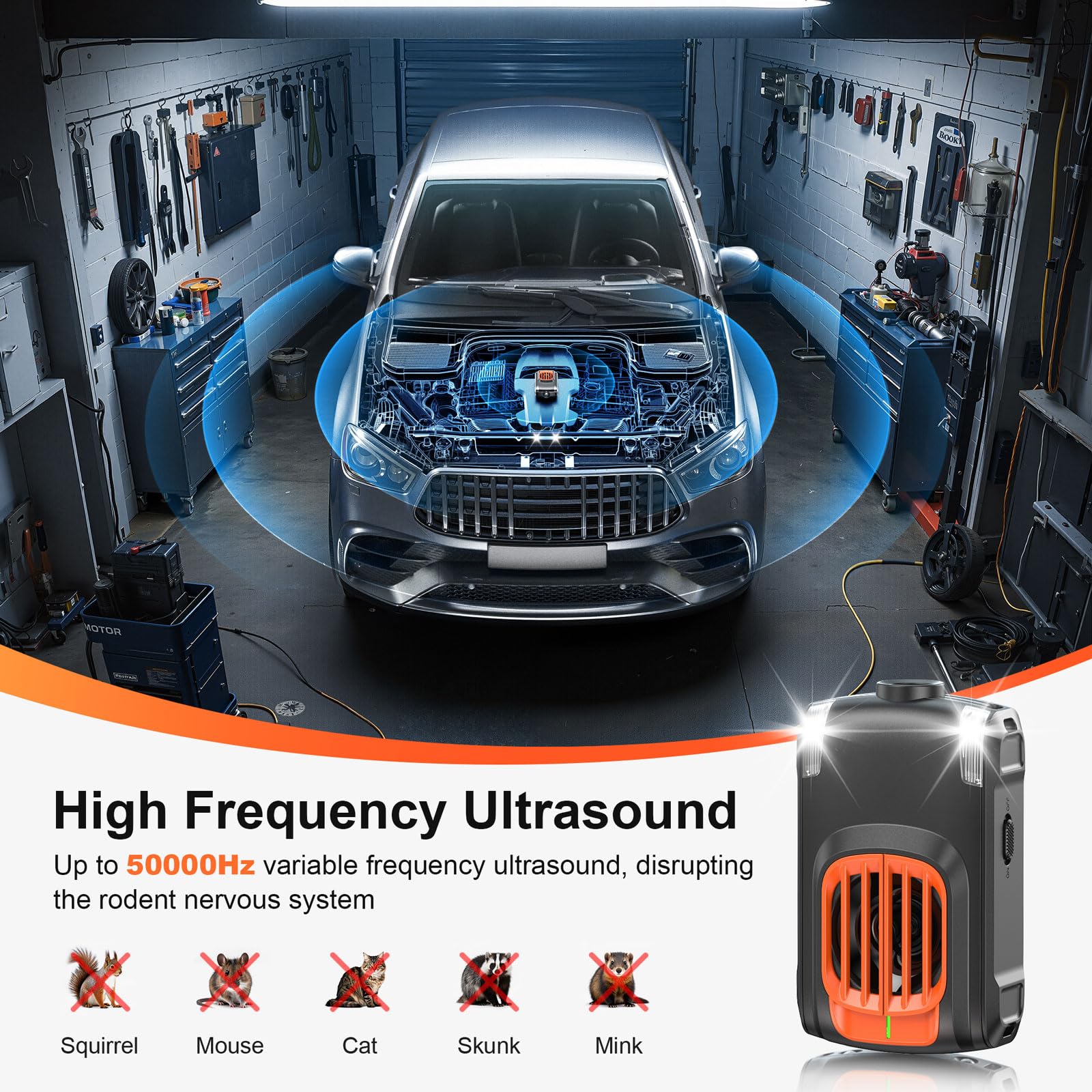 "Prevent Vehicle Damage: This rodent repellent for cars disrupts rodents' central nervous system with high frequency ultrasonic waves and LED flashing lights. This protects your vehicle from rodent damage. Protect your property from harm and drive with peace of mind.