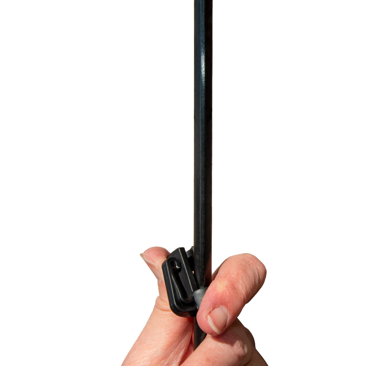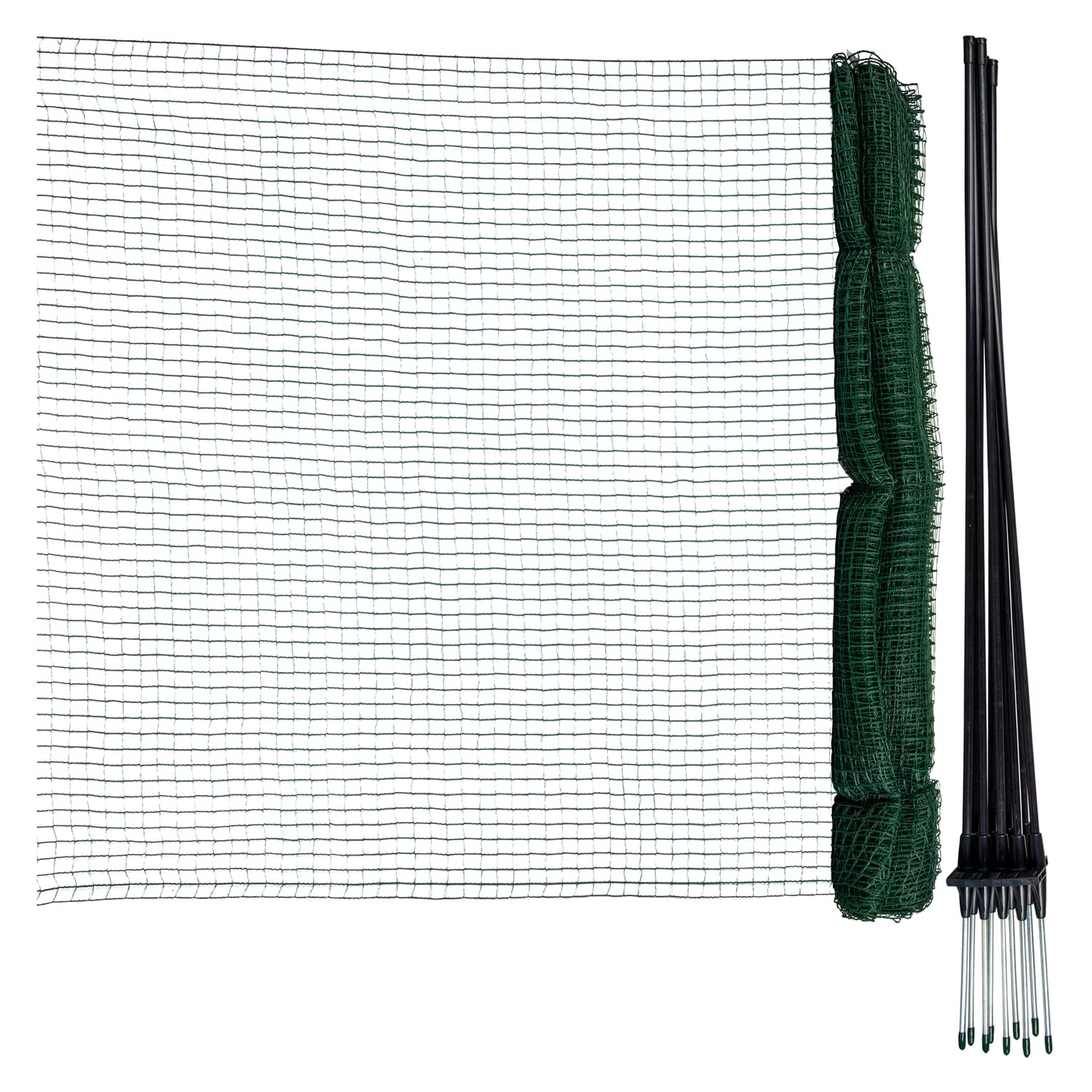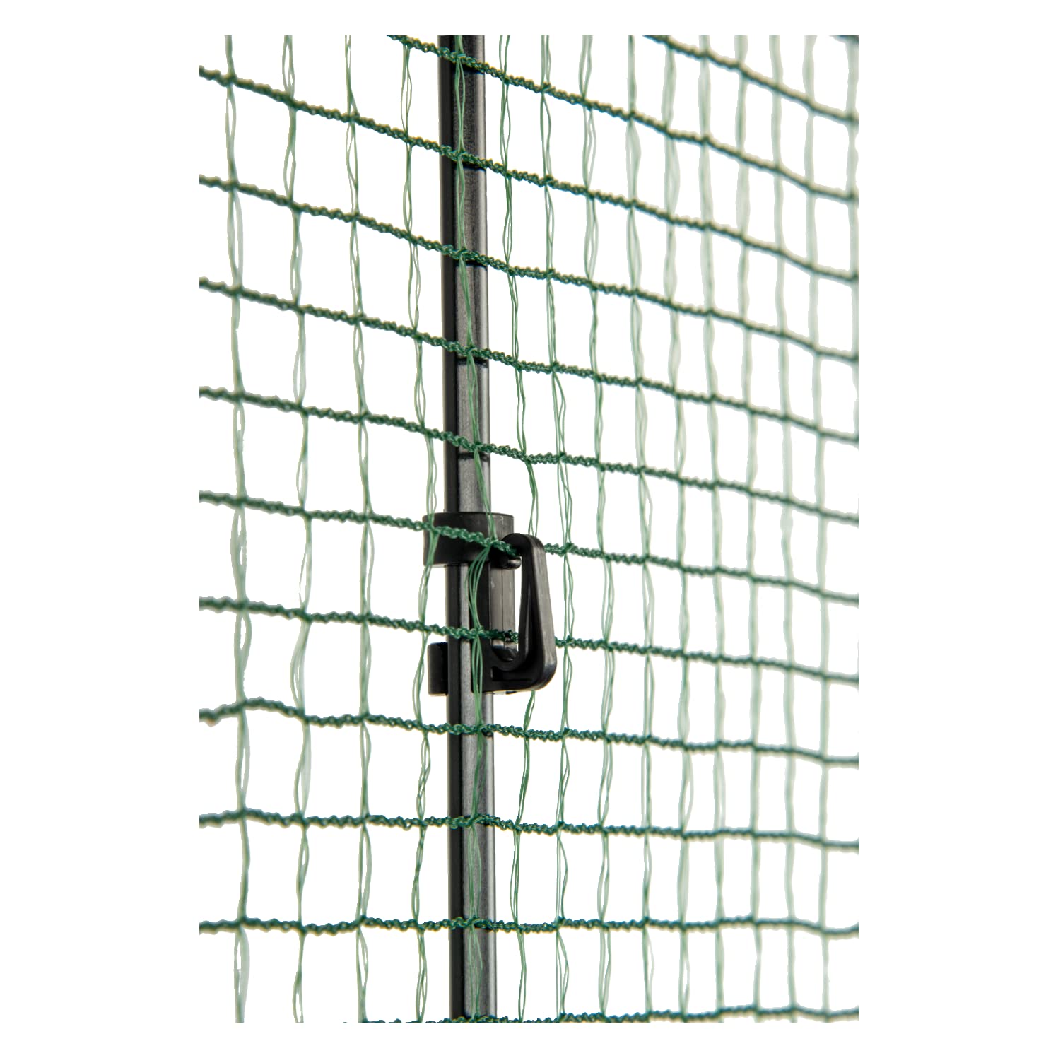 ["ADVANTAGE: Pole spacing can be freely chosen as poles are not permanently attached to the net - ideal for uneven terrain. Net can be pushed up using clip insulators for e.g. mowing work.",