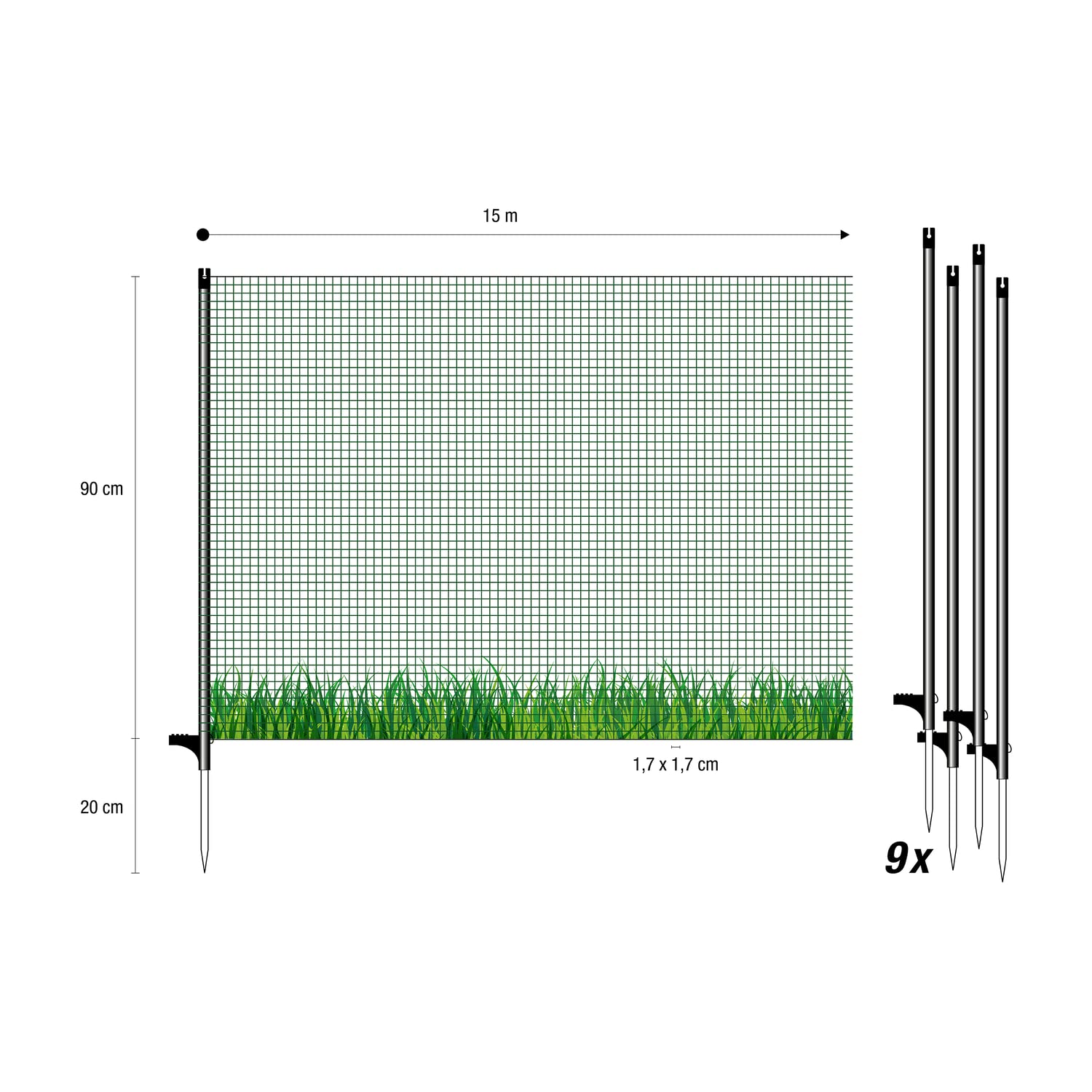 Horizontal boundary fence FLEX, 15m long & 90cm high, close-meshed, mobile special fence with 9 separate fiberglass posts, garden net, dog fence, barrier fence, for camping.
