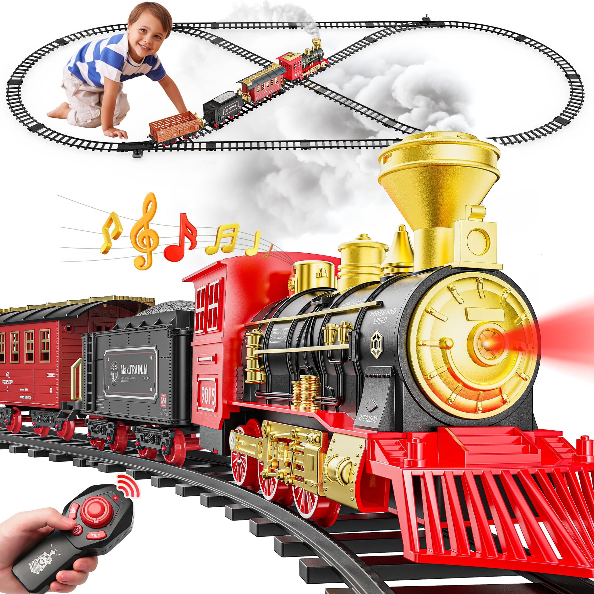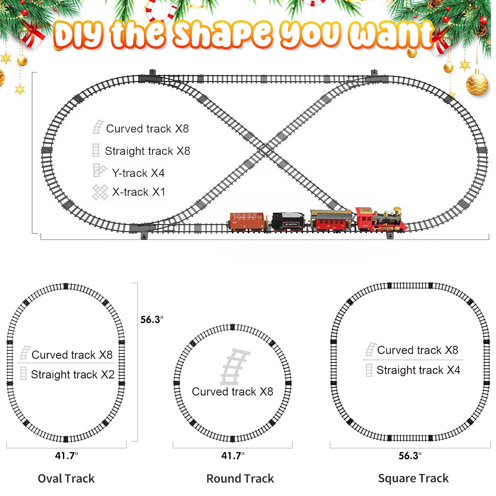 ["Upgraded remote control train"]: This Christmas train set includes a remote control, steam locomotive head, passenger car, coal car, car, 8 curved tracks, 8 straight tracks, 4 Y-shaped tracks, 1 crossing track MORE TYPES OF TRACKS]: Christmas Tree Train simply assemble the tracks in various shapes (round, oval, and deluxe layouts) and securely lock each train track, then flip the switch and the RC train runs smoothly on the toy track.