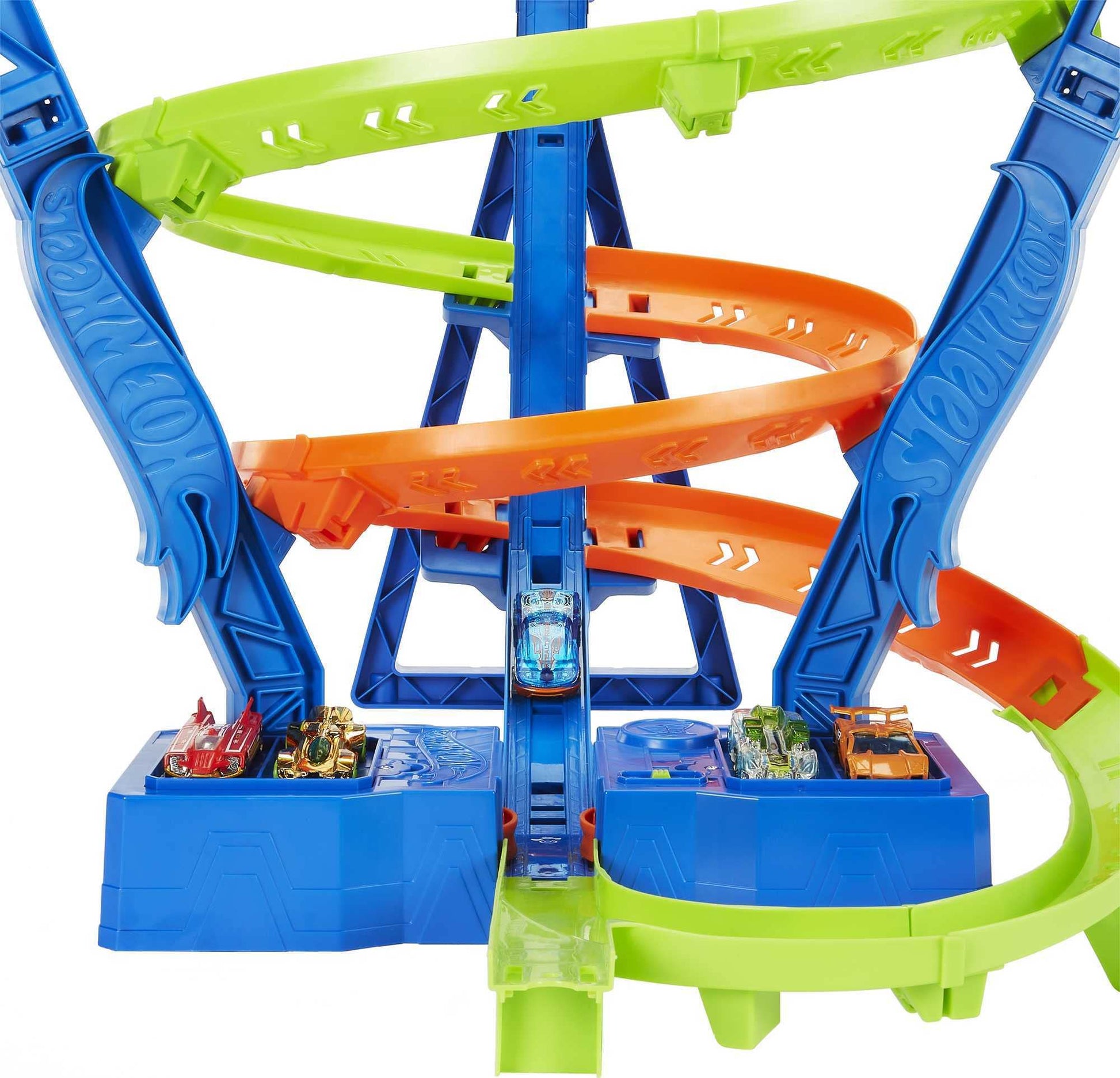 "The Hot Wheels Action Spiral Speed Crash Track Set adds high-octane thrills in a 29-inch high track set featuring multiple crash zones and a motorized booster. Kids send their favorite Hot Wheels vehicle through the booster, launching it to the top of the track and letting cars race continuously until a crash occurs. Add more vehicles to ramp up the excitement and create an epic collision in one of three crash zones. One Hot Wheels vehicle is included; additional cars sold separately. Store up to 6 cars on the battery box and booster. Additional cars sold separately. Colors and decorations may vary. Drive the included Hot Wheels vehicle to the booster and watch it continuously whip down the spiral."