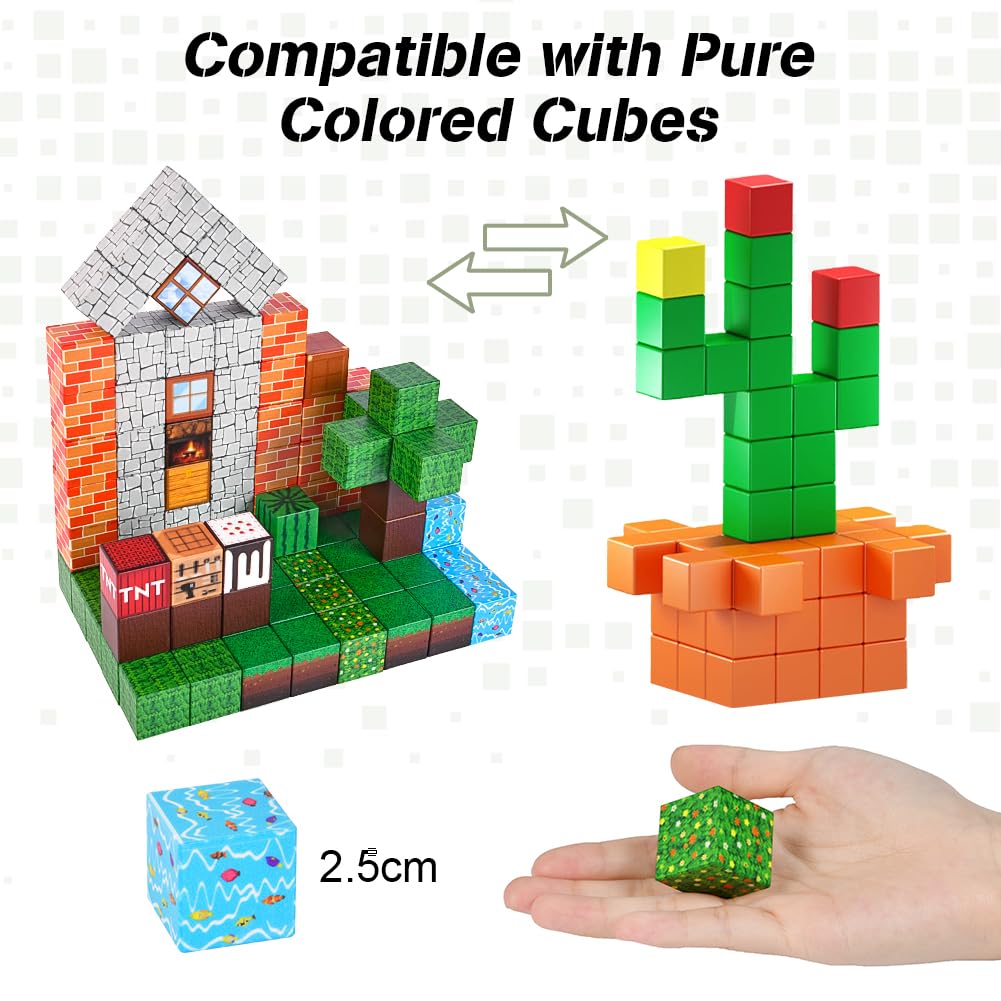 "Build your own magnetic building world with this 96-piece magnetic building set, featuring a variety of patterns including grass, oak leaves, earth, rocks, oak, workbench, oven, crate, and more to explore the magnetic dream world. Made of high-quality ABS material, the 1 inch size is the right size with rounded edges, safe for children to play without worrying about cutting their hands. Unlike other magnetic toys on the market, each block in our magnetic toy has 8 strong magnets that can easily attach to any magnetic object. Suitable for boys and girls ages 6 and up. By building different shapes themselves, kids can increase their interest in colors, geometric shapes, including 3D shapes, numbers, magnetic poles, and architectural designs while playing, developing practical skills, and enhancing their creativity, visual learning, and interaction. This fun block game can be played alone or with friends, providing a great alternative to screen time. The magnetic puzzle game is the perfect educational gift for birthdays, Christmas, Children's Day, STEM, school events, Halloween, and Christmas."