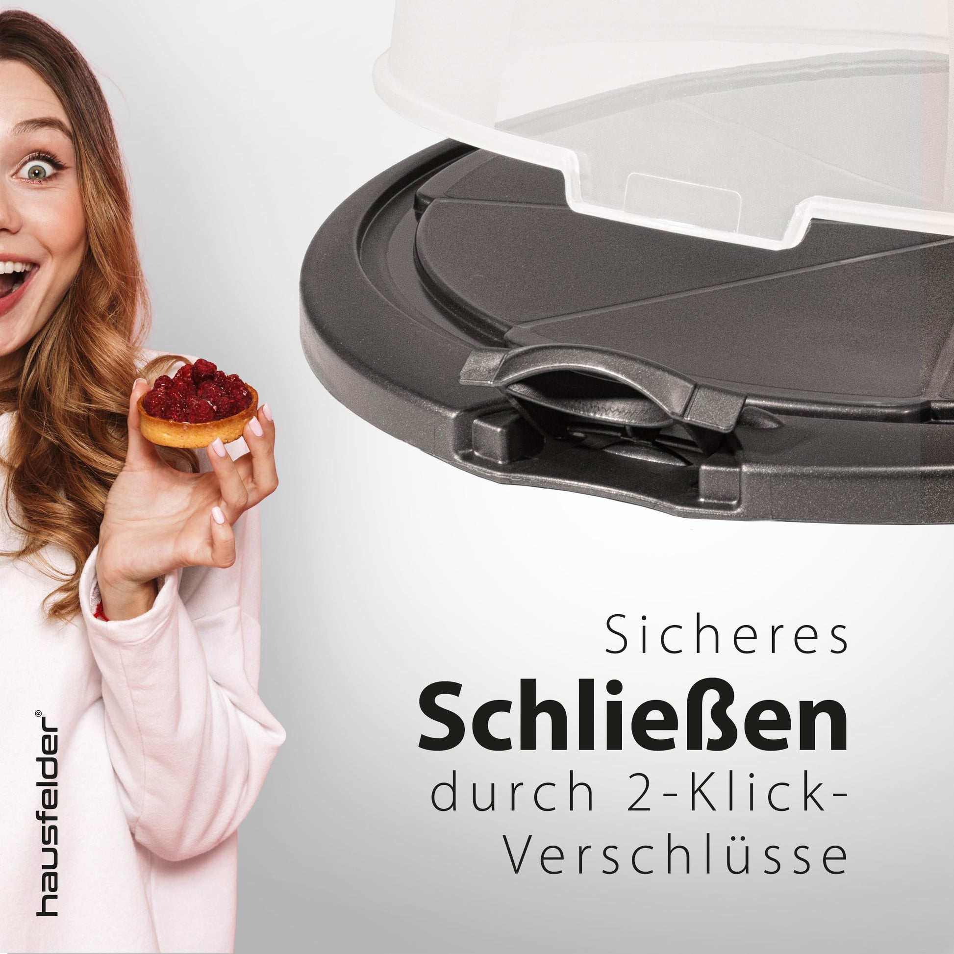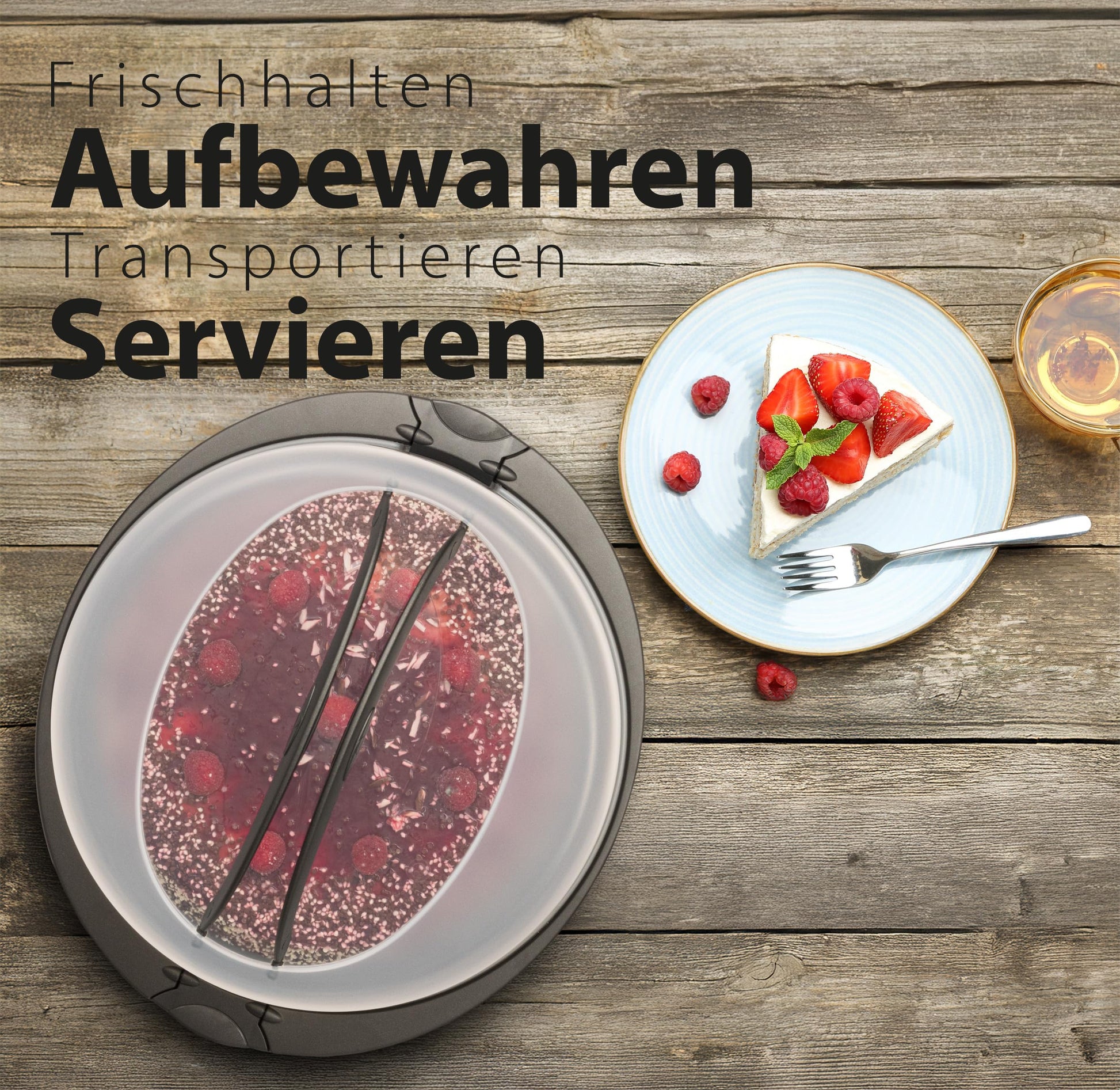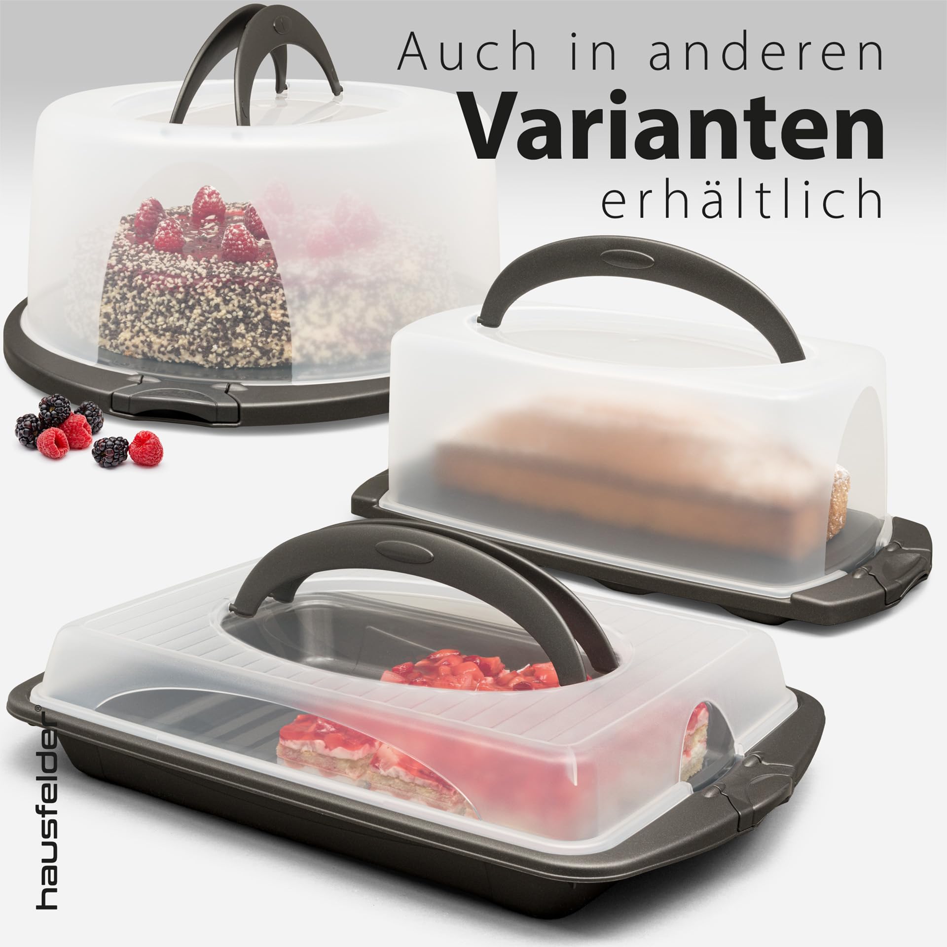 ["THE SAVIOR FOR CAKES: Never stress about transporting your homemade masterpieces again! This sturdy cake box is the ultimate companion for those who want to transport cakes and pies safely and stylishly.","COMFORT MEETS FUNCTIONALITY: The cake dome comes with an ergonomic handle that makes carrying a breeze. And with the side click closures, everything stays airtight and secure.","THE ALL-ROUNDER: From Black Forest cake to New York Cheesecake - everything fits in here!","MORE THAN JUST A BOX: This transport box is a true all-rounder and can also be used perfectly as a serving platter for tapas, snacks, and more. Every occasion becomes a special experience!","EASY CLEANING, MORE TIME TO ENJOY: After the party is before the party! The cake box can be easily cleaned under running water or in the dishwasher. This leaves more time for the good things in life.","EVERYTHING INCLUDED: You will receive a cake transport box with the perfect dimensions for your baking art. The dome has a diameter of 33 cm and is 16 cm high. It is suitable for a maximum cake size of 28 cm in diameter and 13 cm in height."]