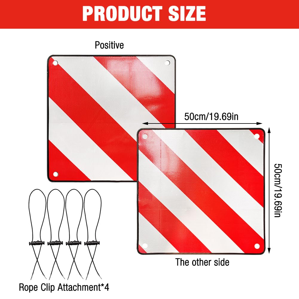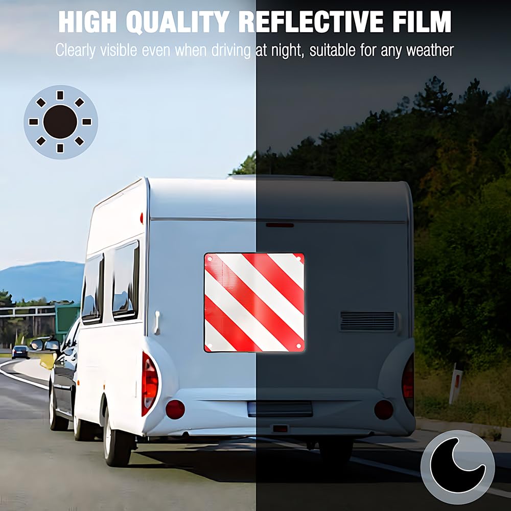 ["Double-sided design: Our 2-in-1 reflective warning sign features alternating red and white reflective stripes that enhance visibility and serve as an effective warning. The two-color design ensures easy recognition during day and night or in poor lighting conditions. The warning sign allows flexible use in Spain and Italy by simply flipping it over.","Easy installation: The package includes 1 piece of warning sign for Italy and Spain in size 50 x 50 cm. Equipped with four round holes at the corners, installation and disassembly are convenient and quick. You can choose between rope attachment or screw mounting flexibly according to your needs, meeting different installation scenarios.","High-quality material: Made of PVC material with waterproof, sun-resistant, and durable properties, our 2-in-1 red-white warning sign withstands various adverse weather conditions.","Compliance with regulations: With this warning sign for Italy and Spain, you can easily adhere to the different traffic rules in Spain and Italy and travel safely.","Wide application: Our warning sign for Italy and Spain is suitable for motorhomes, RVs, trailers, bike racks, trailers, boat carriers, construction machinery, commercial vehicles, and transport vehicles"]
