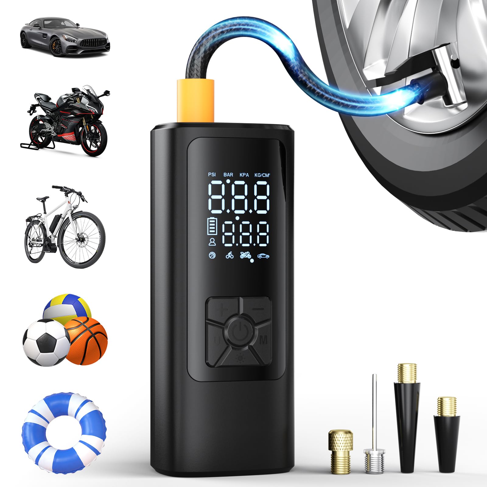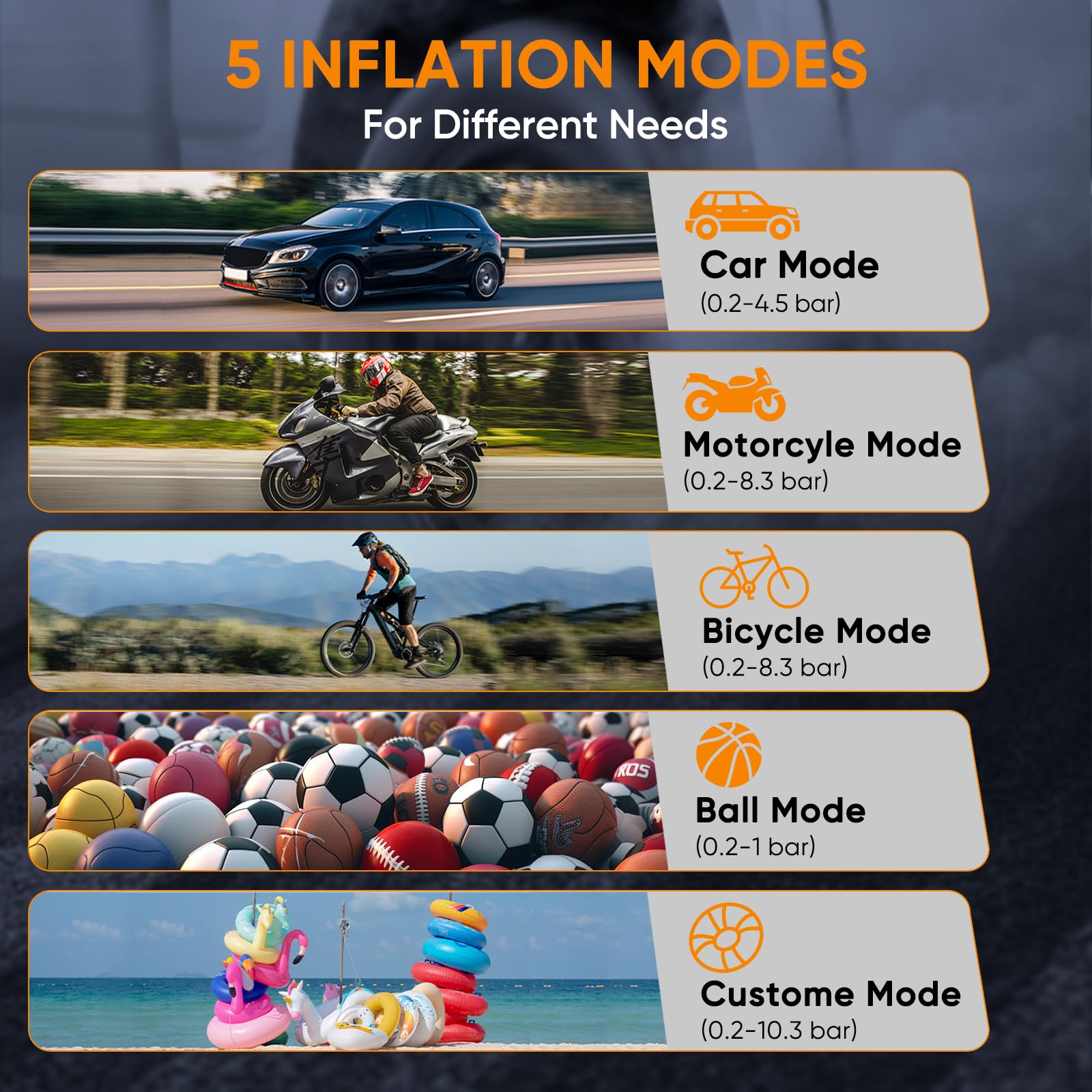 ["【5 Inflation Modes】The electric air pump has 5 modes (Auto, Motorcycle, Bicycle, Ball, Custom) and 4 units (PSI, BAR, KPA, Kg/cm2) to choose from. You can preset the pressure, once the preset pressure value is reached, the portable air pump will automatically stop. The custom mode allows you to set pressure values (0-10.3 bar) based on the inflation object to meet different inflation requirements.