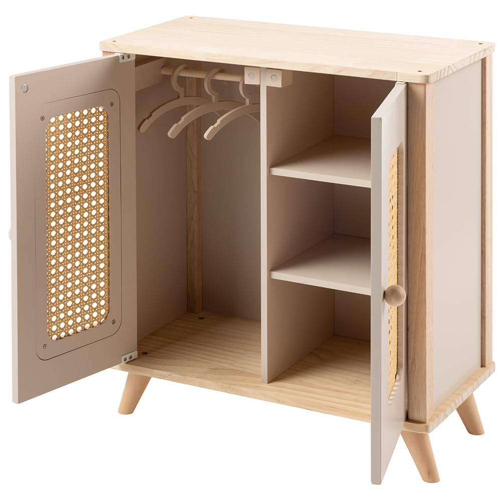 "The howa wooden doll wardrobe with beautiful rattan-style doors offers plenty of storage space for doll clothes and accessories. One side of the wardrobe has a clothes rail with 3 hangers for dolls. Behind the other door, 3 compartments provide ample storage space for doll accessories. Doll wardrobe dimensions: Height: 54 cm, Width: 49 cm, Depth: 24 cm. Our wardrobe for doll clothes can be complemented with a variety of other 'miniflowers' doll furniture and accessories."