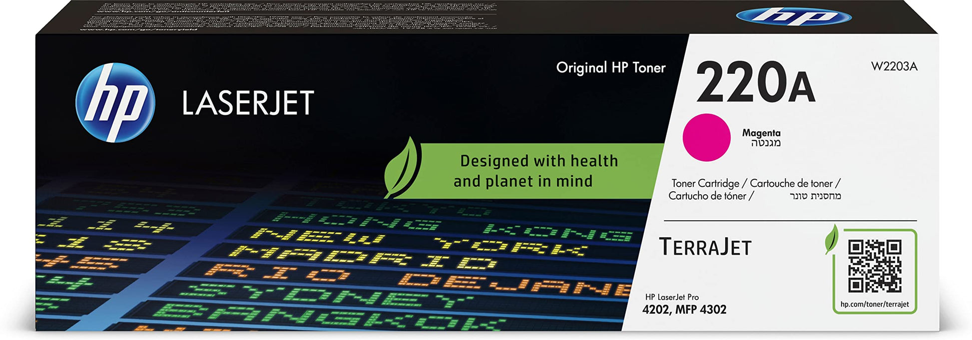 ["HP TerraJet toner cartridges have been responsibly designed and stand out for their high print quality and integrated security.","The HP 220 printer cartridge is compatible with: HP LaserJet Pro 4202, 4302, 4303","Approximately 1,800 pages","Requires less plastic and energy[5,6,7]","More vibrant colors and toner with higher efficiency[2,8]","Secured printer cartridges for better protected systems[4,10,11]","Better CO2 balance.[1] Consistent, high-quality color printing. Meeting environmental label emission criteria for indoor air quality. More vibrant, natural-looking images and sharper details.[2] Higher printing speeds. Protected supply chain integrity.[3]","As HP's next-generation toner and cartridge technology, TerraJet toner cartridges and their packaging have been completely redesigned to ensure sustainability, outstanding printing performance, and security you can trust. Designed for a better CO2 balance[12] with less plastic and lower energy consumption,[6,7,8] more efficient toner consumption with innovative toner particle design for less toner waste and outstanding print quality with integrated security,[13,14] HP is taking toner and cartridge technology to the next level.","Contents: HP toner cartridge"]