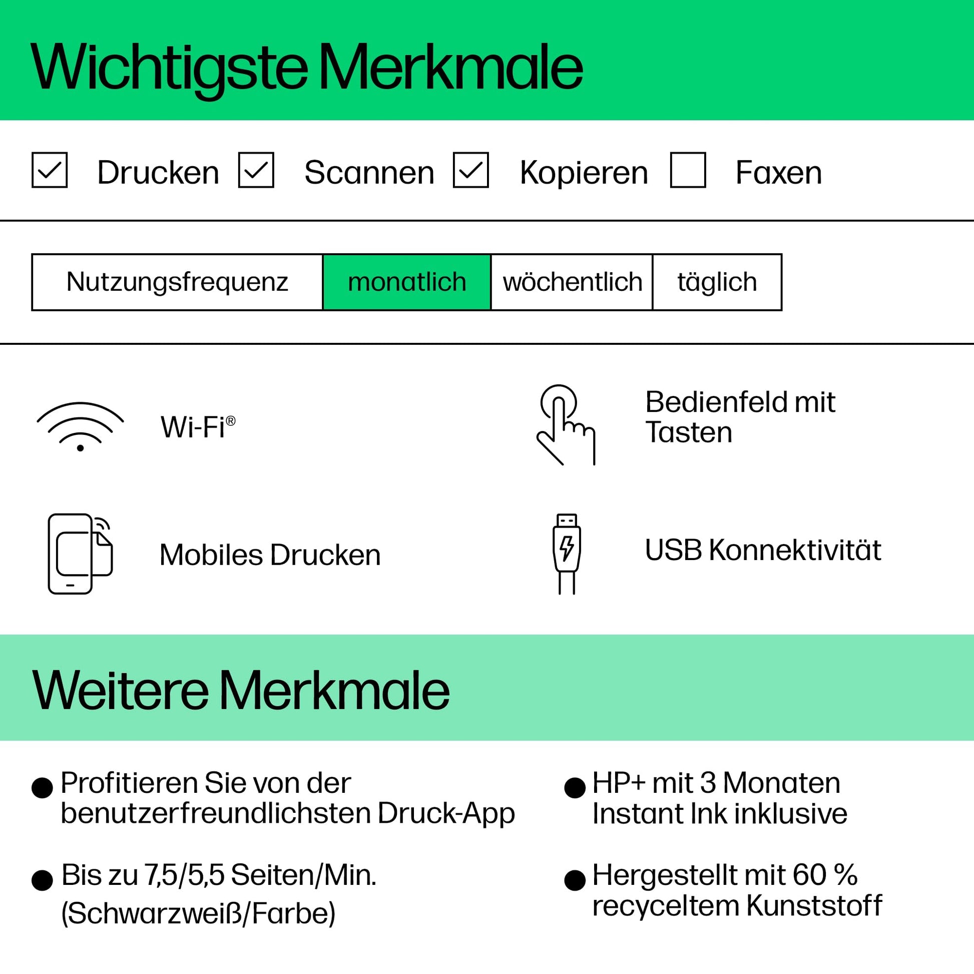 ["Secure $10 Cashback: Apply for your cashback online within 30 calendar days of purchase at the following link (Germany & Austria): hp.com/go/hpcashback.","The ideal choice for families: Quickly print everyday documents like homework, bills, tickets, etc.","Print speed: up to 7.5 pages/min (black/white), up to 5.5 pages/min (color); Print quality: up to 1200 x 1200 dpi; Connections: Wireless 802.11 b/g/n; 1 Hi-Speed USB 2.0; HP Smart App; mobile printing; 60-sheet paper tray","Easy 3-step installation with HP Easy Start, an automated download and installation application for HP printers: 1. Install HP Smart App 2. Enable printer Wi-Fi 3. Pair printer with HP Smart App; Guided support with free support hotline (DE: 06929993434 / AT: 013602774402)","With HP+, you get 3 trial months of Instant Ink and additional benefits. During the trial months, all printed pages are included regardless of the selected page plan. Monthly costs after trial months starting from $1.49/month. Monthly cancelable. HP+ activation required during printer installation. Prices are exclusively for Germany. Different conditions may apply for other countries.","This printer is only intended for cartridges equipped with Original HP chips and circuits. Products with chips or circuits from third-party manufacturers will be blocked. Regular firmware updates maintain the effectiveness of these measures."]