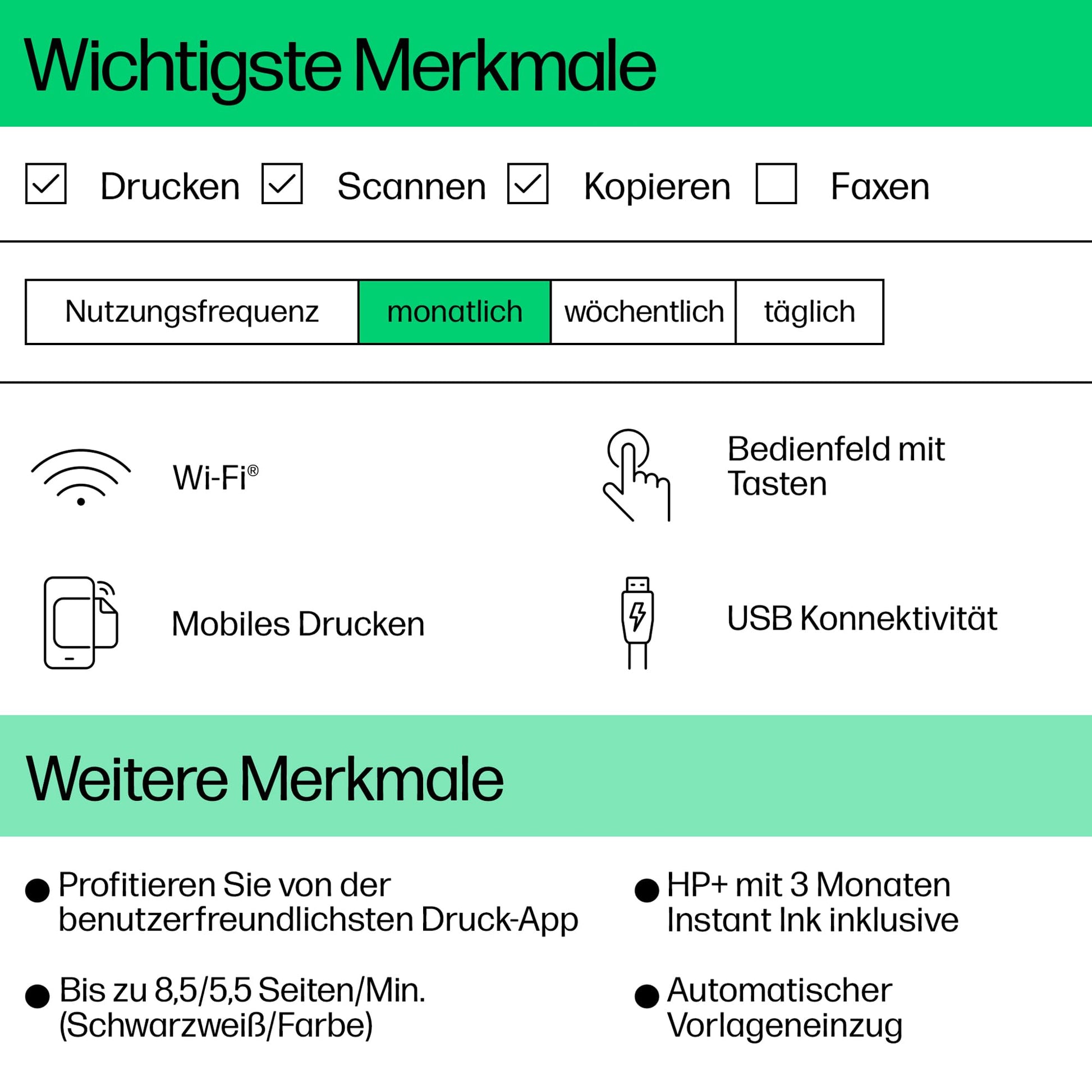 With HP+, you get 3 trial months of Instant Ink and additional benefits. In the trial months, regardless of the selected page rate, all printed pages are included. Monthly costs after the trial months from €1.49/month. Monthly cancellable. Activation of HP+ during printer installation required. Prices apply exclusively to Germany. Different conditions may apply for other countries.