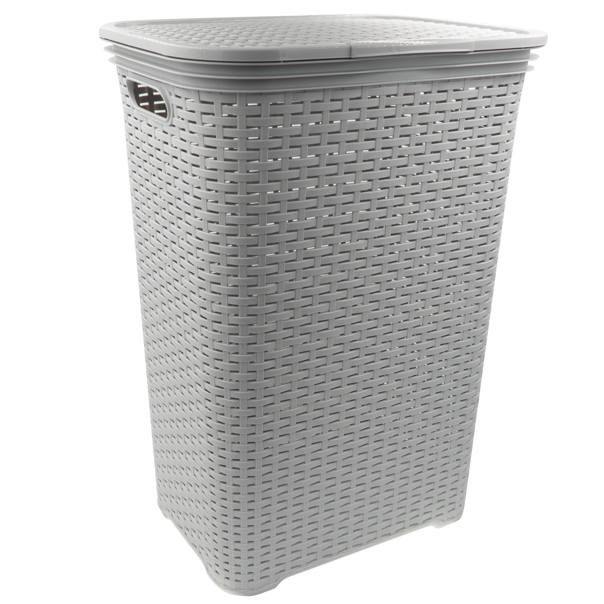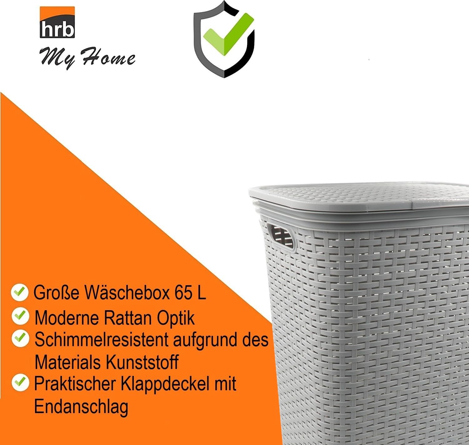 HRB laundry basket with lid made of 65 liters of rattan, plastic laundry storage, laundry sorter (gray)