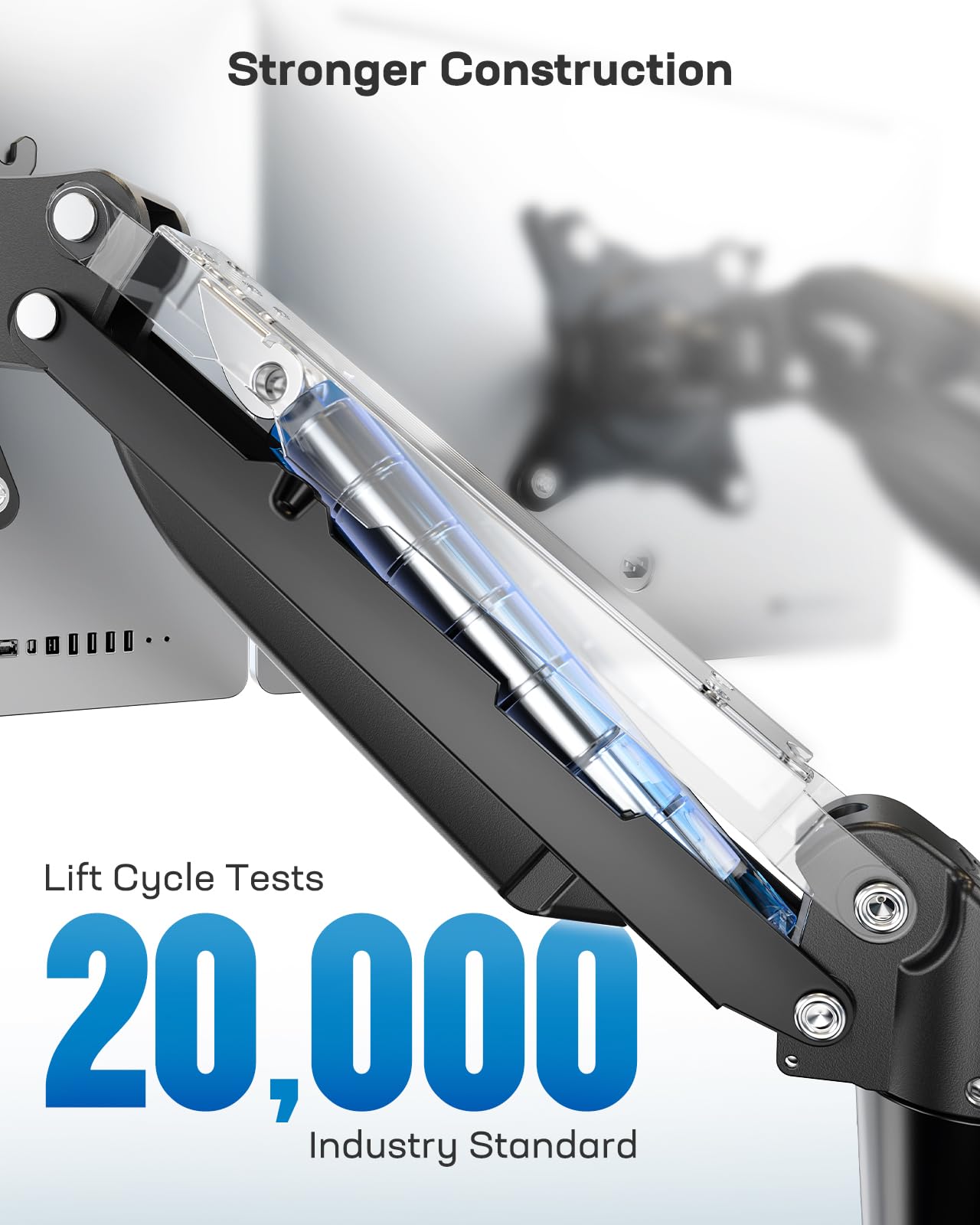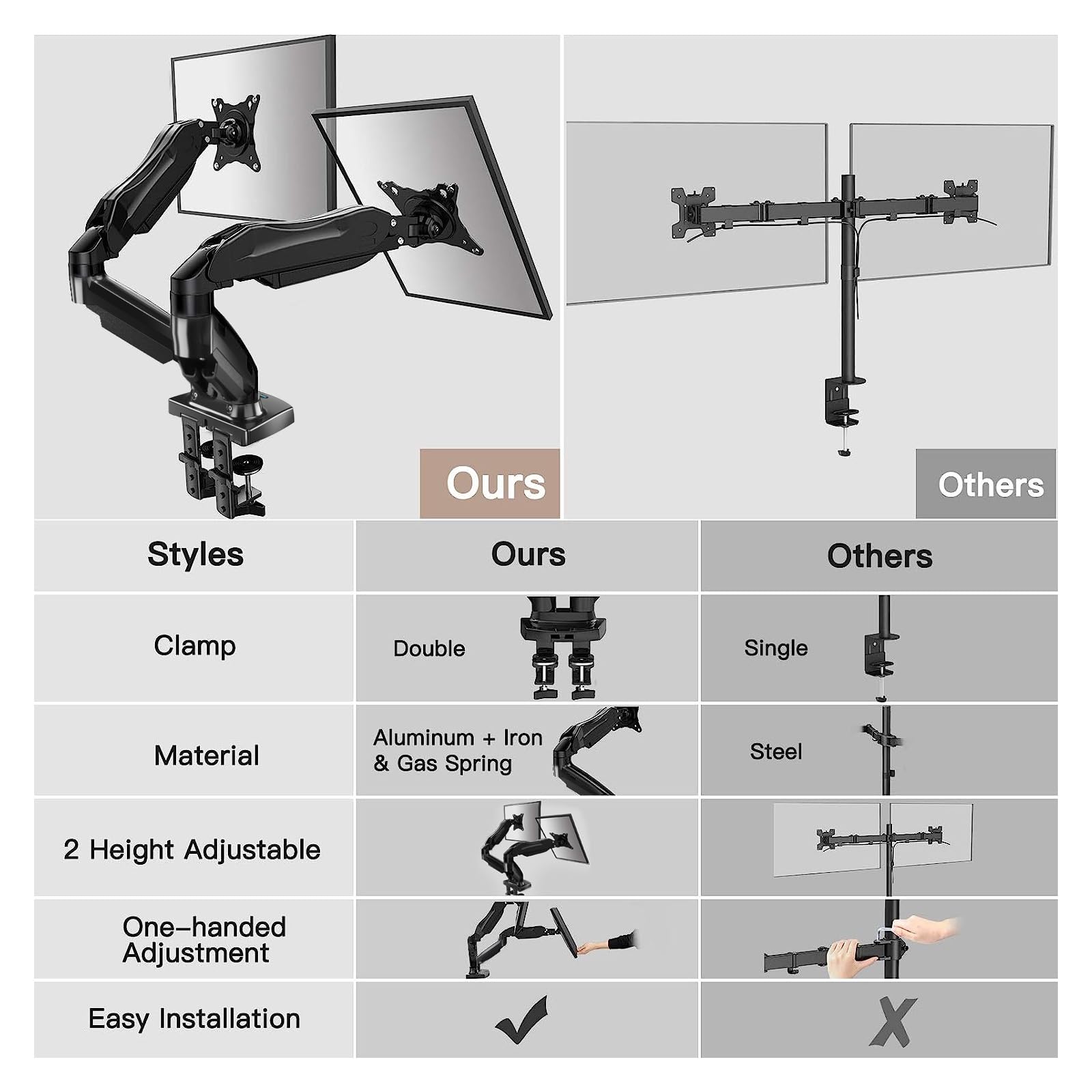 ["Universal Monitor Mount for 2 Monitors - The HUANUO dual monitor mount is the ideal solution for your dual monitor setup. It is compatible with VESA standards of 75x75 mm and 100x100 mm and suitable for monitors weighing up to 20 lbs. This dual monitor mount fits 19, 22, 23, 24, 25, and 32 inch screens, giving you the flexibility to combine different screen sizes.","Ergonomic Adjustments for added comfort - With the dual monitor mount, you can adjust each screen individually. Tilt the monitors from -50° to +85°, swivel them 180°, or rotate them 360°. Each monitor can be adjusted in height by up to 16 inches and in depth by up to 17 inches, allowing you to find the perfect position for your work or study. Optimize your workspace and increase your productivity.","Secure, durable technology - Compared to traditional mechanical springs, our monitor mount ensures a quiet, stable, and noiseless adjustment. Each dual monitor mount is tested 30,000 times before shipping to ensure reliable performance and guarantee a lifespan of at least 5 years. You can rely on long-term use.","More space on your desk - The dual monitor arm allows you to mount your monitors on the swivel arms, freeing up valuable desk space. With the integrated cable management system, your workspace will always remain neat and well-organized. The dual monitor mount helps you keep your work environment clean and tidy.","Easy desk mounting - The 2 monitor mount comes with a C-clamp and a grommet mounting kit. The C-clamp can be quickly attached to the edge of the desk (maximum thickness 3.5 inches), while the grommet mounting is ideal for desks with holes (0.43-0.87 inches in diameter). The dual monitor arm is easy to install and ensures a stable mounting without damaging the desk."]