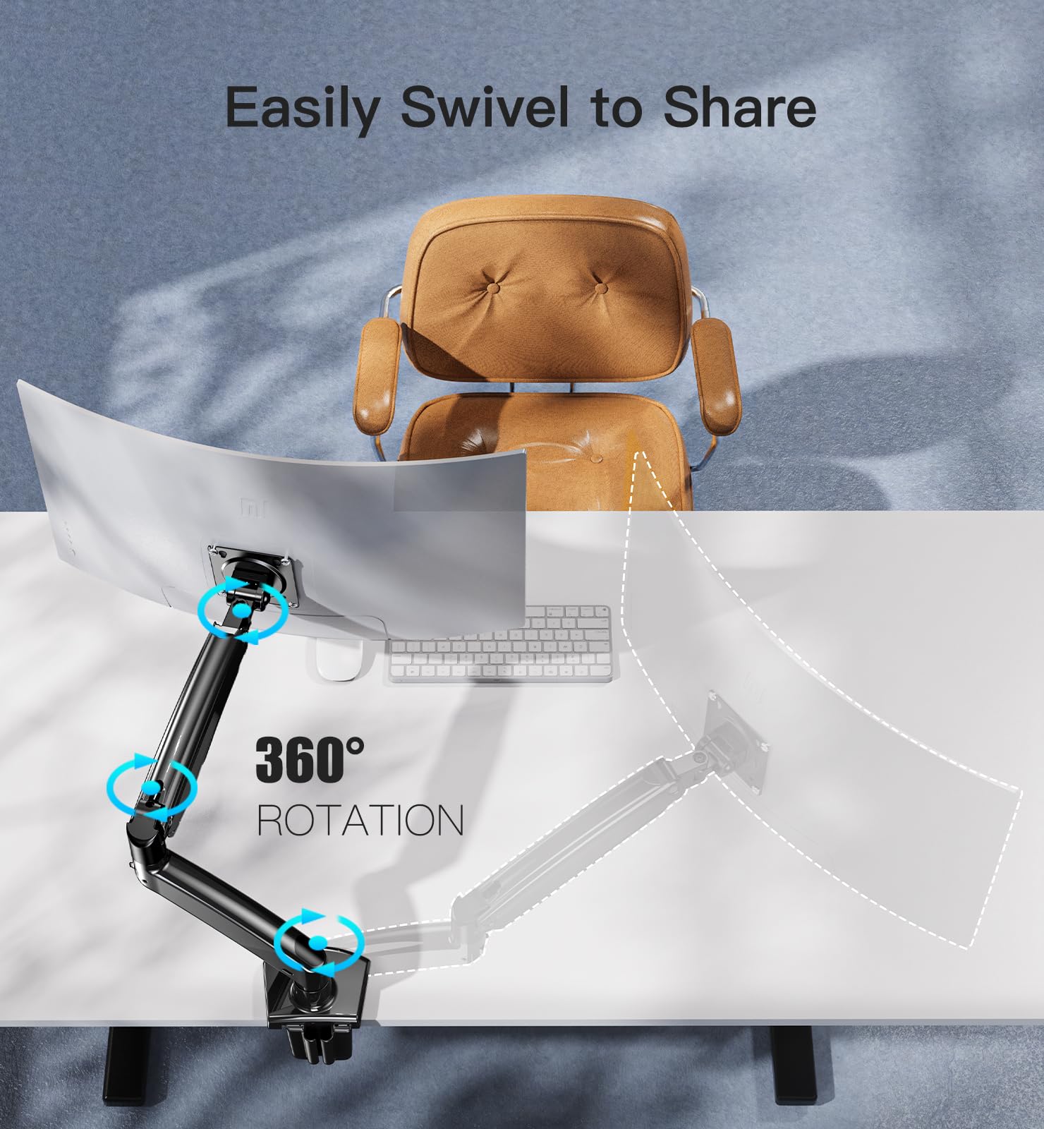 ["Greater Compatibility - This monitor mount is suitable for most 13 14 15 17 18 19 20 21 22 23 24 24 26 27 28 29 30 31 32 34 35 36 37 38 39 40 inch LED-LCD displays with curved/flat screens with VESA mounting patterns of 75 x 75 mm and 100 x 100 mm. The weight of your monitor should not exceed 12 kg. To ensure that the monitor mount can better support the weight of your monitor, please adjust the monitor arm according to the instructions.","Space-saving & Tidy - The PC monitor mount with USB ports and cable management solves your cable clutter and allows you to conveniently charge your devices; the desk monitor mount can extend horizontally by 53.34 cm and up and down by 53.6 cm, allowing you to always maintain a correct sitting posture and optimize your valuable desk space, creating a comfortable working environment.","Solid Construction - This monitor mount features an integrated premium arm construction, so you no longer have to make tedious adjustments. The streamlined die-cast alloy frame and steel ring compression joints ensure reliable positioning and stability. This desktop monitor mount has undergone 20,000 practice tests to ensure years of trouble-free adjustment.","Fully Adjustable Screen Mount - This monitor mount provides maximum ergonomic comfort. The tilt adjustment of +85°/-30° allows you to tilt the screen forward or backward to adjust it to your reading perspective. The 180° swivel adjustment allows you to share the screen with colleagues nearby at any time. The 360° rotation adjustment allows you to horizontally or vertically align the screen.","2 Mounting Options - The monitor mount comes with both a C-clamp and a grommet mount, so you can choose the one that best fits your desk. 1) C-clamp mounting (table thickness max. 9 cm). 2) If your desk has a hole, you can choose a grommet mount (table thickness 9 cm). Both provide stable support for your monitors."]