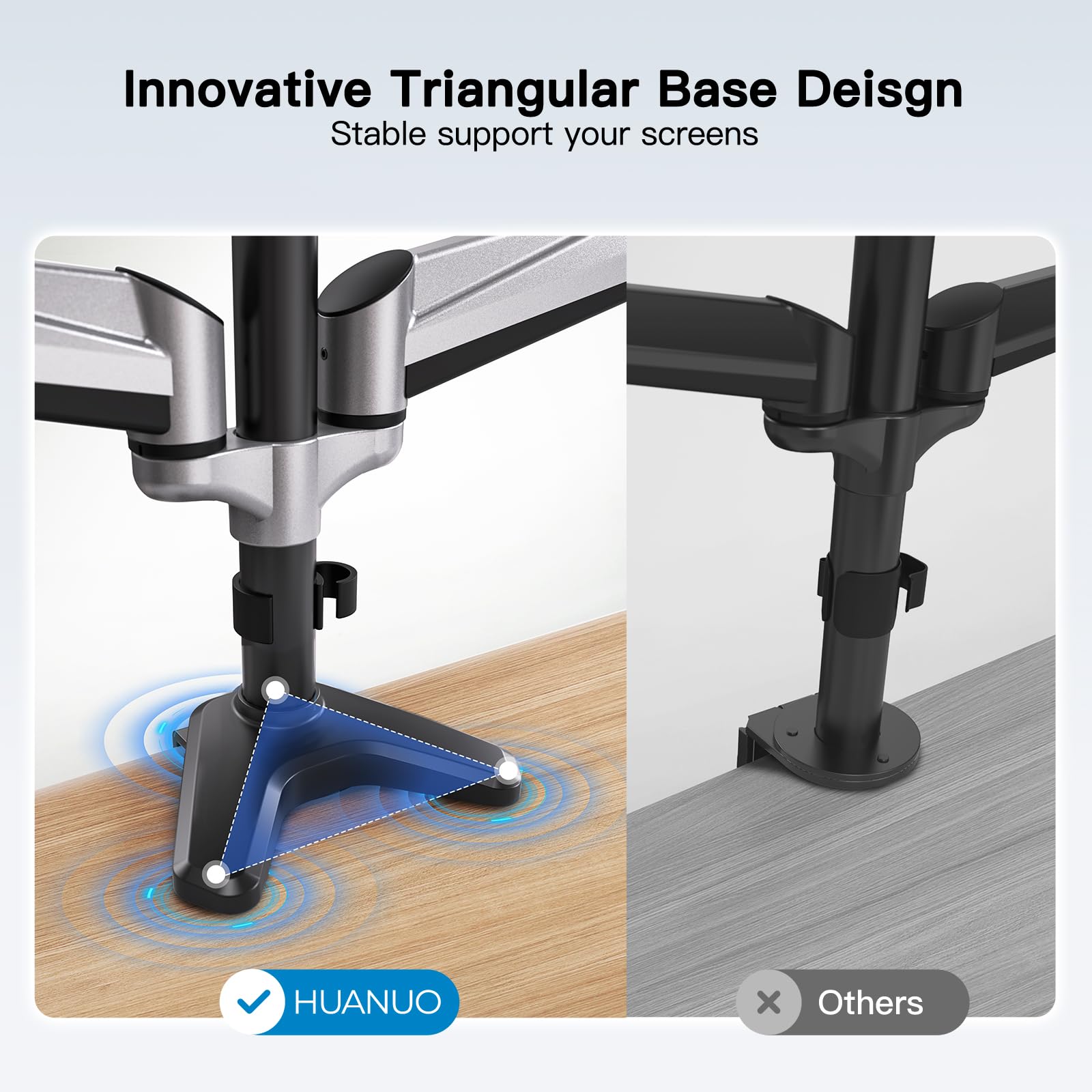 ["Unique 3 monitor mount design: The monitor mount for 3 monitors features a classic silver-white color and a smooth full-body structure. Simultaneous display of multiple screens, real-time gaming, and programming on multiple screens are more convenient and efficient than a single screen. This monitor mount for 3 monitors can be applied to most monitors up to 32 inches in size.","Safe and sturdy: Our monitor mount uses an automotive-grade gas spring core that has passed 20,000 motion tests and is equivalent to up to 5 years of continuous use; The screen mount is made of high-quality aluminum die-casting. The stability of our monitor mount is more than three times higher than that of the iron mount in the past.","Adjustable angle as needed: When in use, the screen mount can be stopped at any position without further adjustments. Compared to the adjustment method of a normal monitor mount, where the screws are repeatedly removed, you only need to carefully press this gas spring screen mount up or down with one hand to stop it precisely at the most comfortable height (66.5 cm from the table top)!","Effective use of space: Compared to a vertical screen mount, the base of our monitor mount can save more than 80% of the table space, allowing you to place accessories such as large keyboards and mouse pads. At the same time, this 3-monitor monitor mount features a hidden cable management function, effectively preventing cables from being scattered and tangled.","Installation options for C-clamp and grommet: This 3-monitor monitor mount comes with a C-clip and grommet mounting kit. You can attach the screen mount and hold your three monitors with the C-clamp."]
