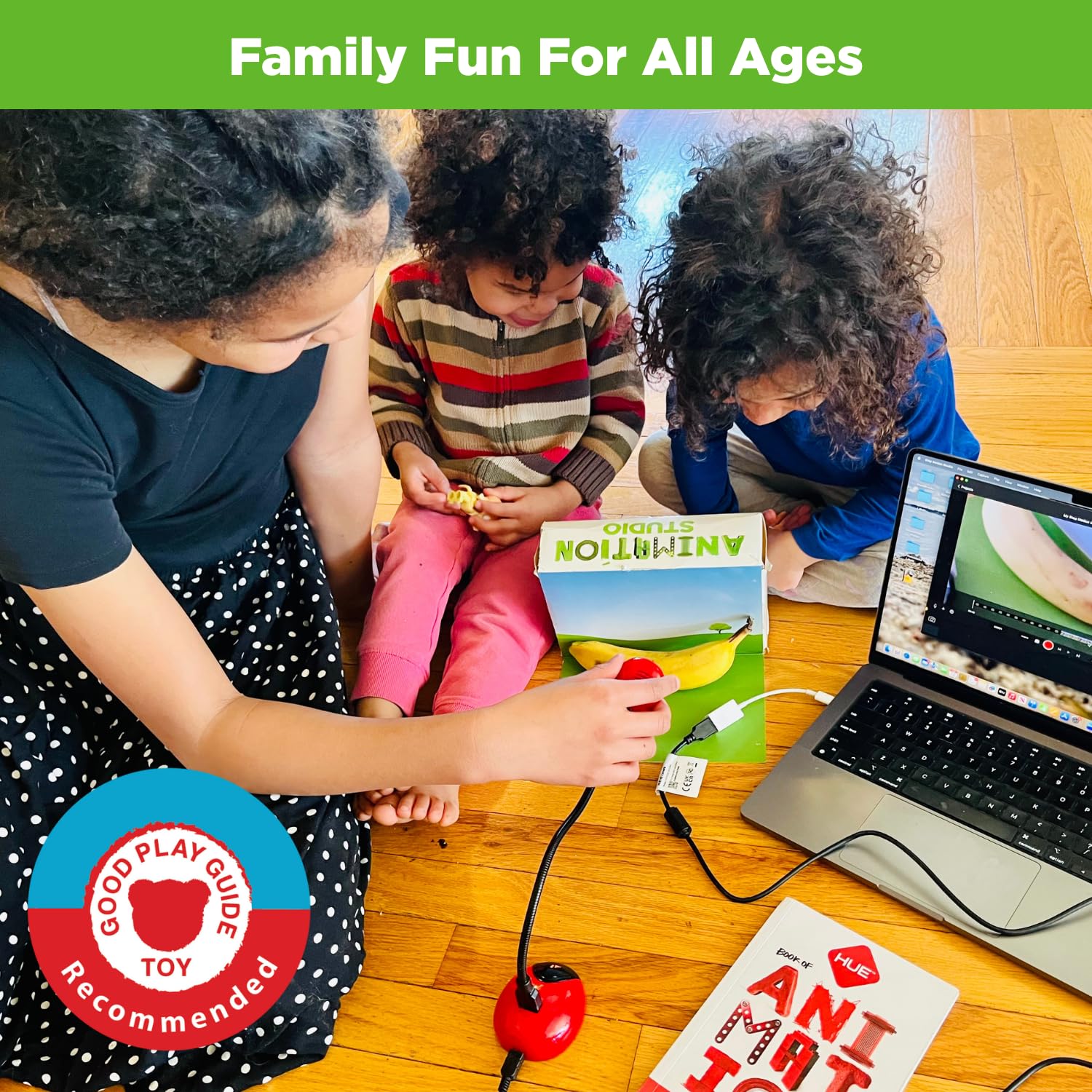 "COMPLETE STOP MOTION ANIMATION PACKAGE with HUE HD USB Camera, built-in microphone, and 64-page full-color instruction book for kids and adults. Includes a mini stage with background scenery, online tutorials, printable examples, sound effects, and free software (Windows and macOS).